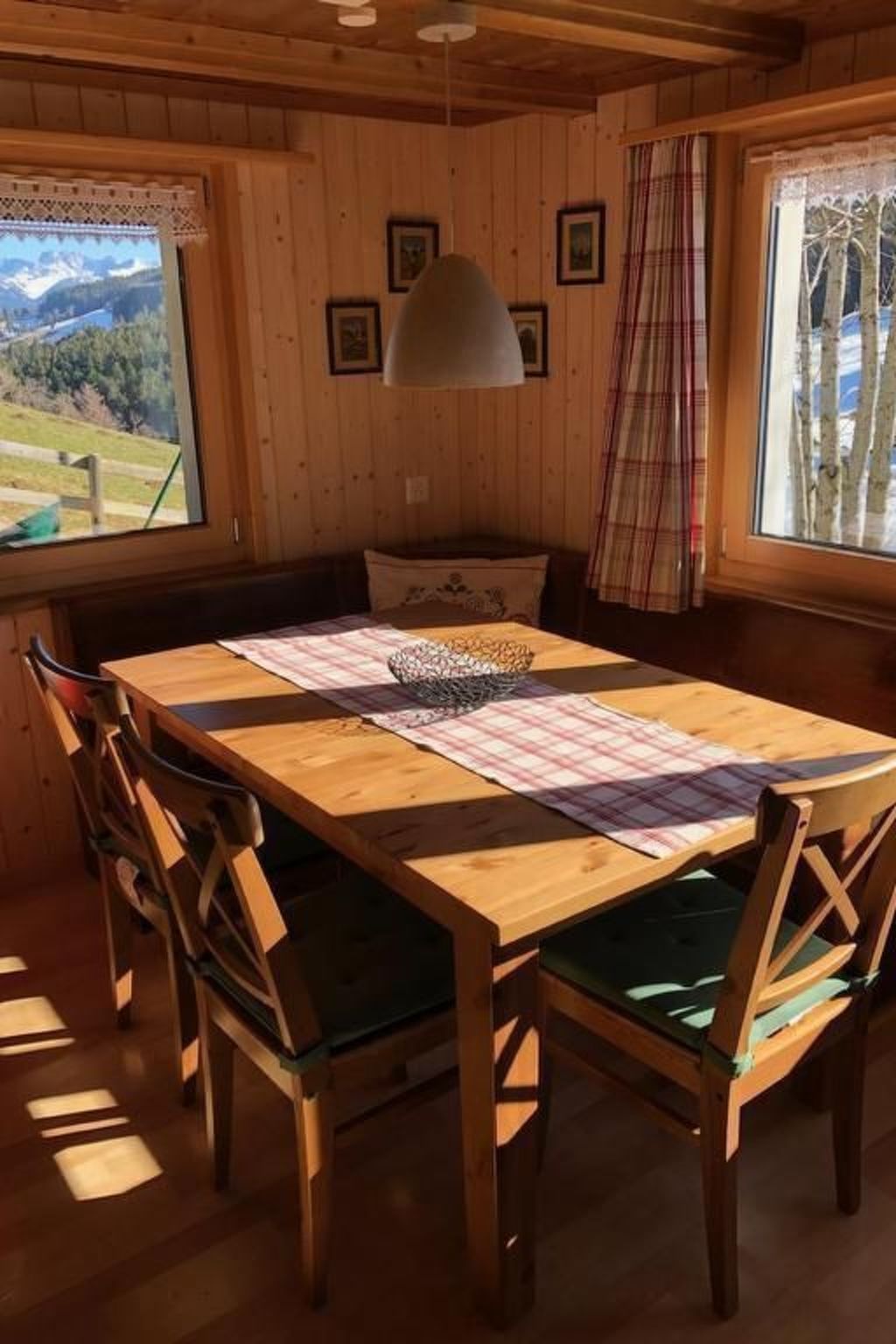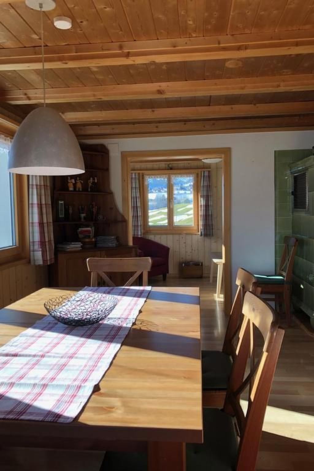 Sonstige Wohnzimmerausstattung (Wohnzimmer1): Eckbank mit Tisch und 4 Stühlen, Deckenlampe, kleiner Schrank mit Gesellschaftsspielen, Büchergestell mit zahlreichen Büchern mit Ferienlektüre (Romane etc.), Geschirrschrank (darunter ein Fondue-Caquelon). Heimeliger Kachelofen.