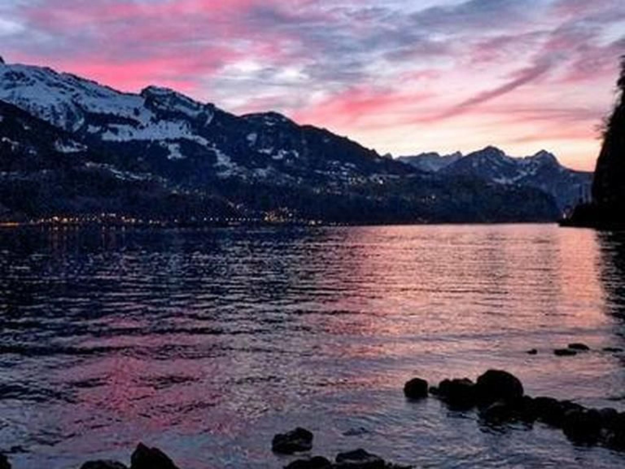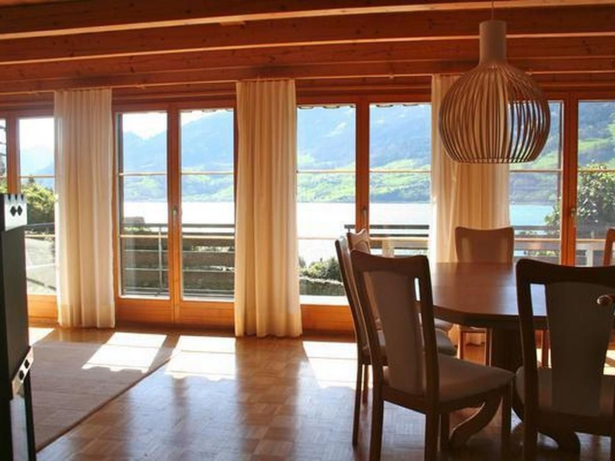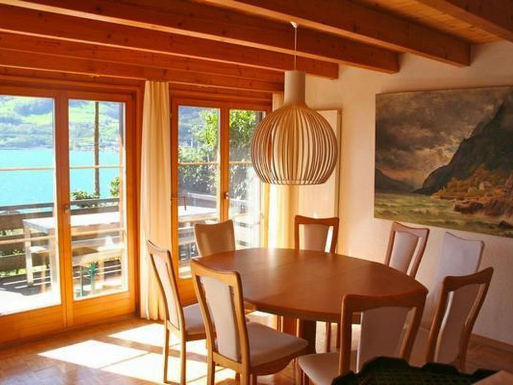 Sonstige Wohnzimmerausstattung (Wohnzimmer1): Stilvoll eingerichtetes Wohn- und Esszimmer mit vollem Blick auf See und Berge. Gemütlicher Couchbereich mit Schwedenofen, Bücher- und Spieleecke, sowie Musikanlage/WLAN. Ausziehbarer Esstisch für bis zu 8 Personen.