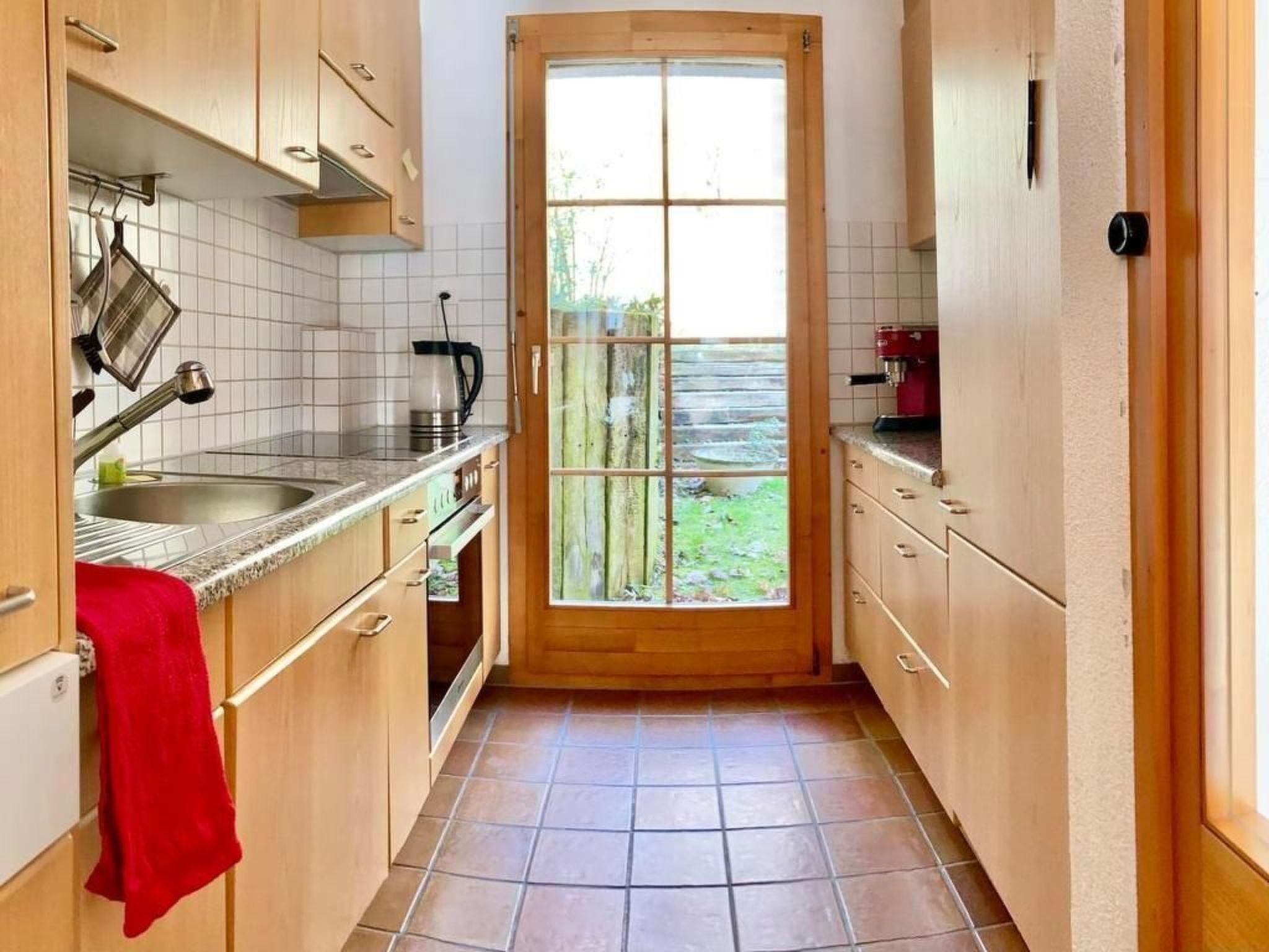 Sonstige Kücheneinrichtung (Küche1): Vollständig ausgestattete Küche (auch Racletteofen, Brotbackautomat, Mixer etc.). Herd, Ofen und Geschirrspülmaschine wurden 2020 erneuert. Von der Küche gelangt man in den oberen Teil des Gartens mit dem Pizzaofen und einem Weber-Kugelgrill.
