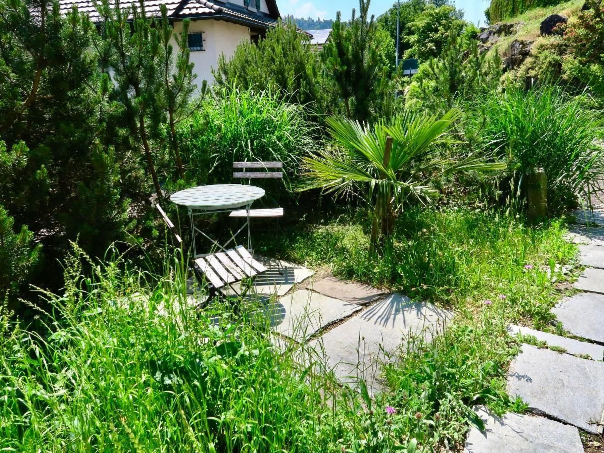 Wohnküche mit Glaskeramikherd. Kein TV, aber WLAN-Anschluss (Wireless). Parkplatz in 15m Entfernung. Aus den Fenstern haben Sie freie Sicht in die Berge, und die Wohnungstür führt direkt in den mit Palmen bewachsenen Garten, der zu Ihrer freien Benützung offensteht.