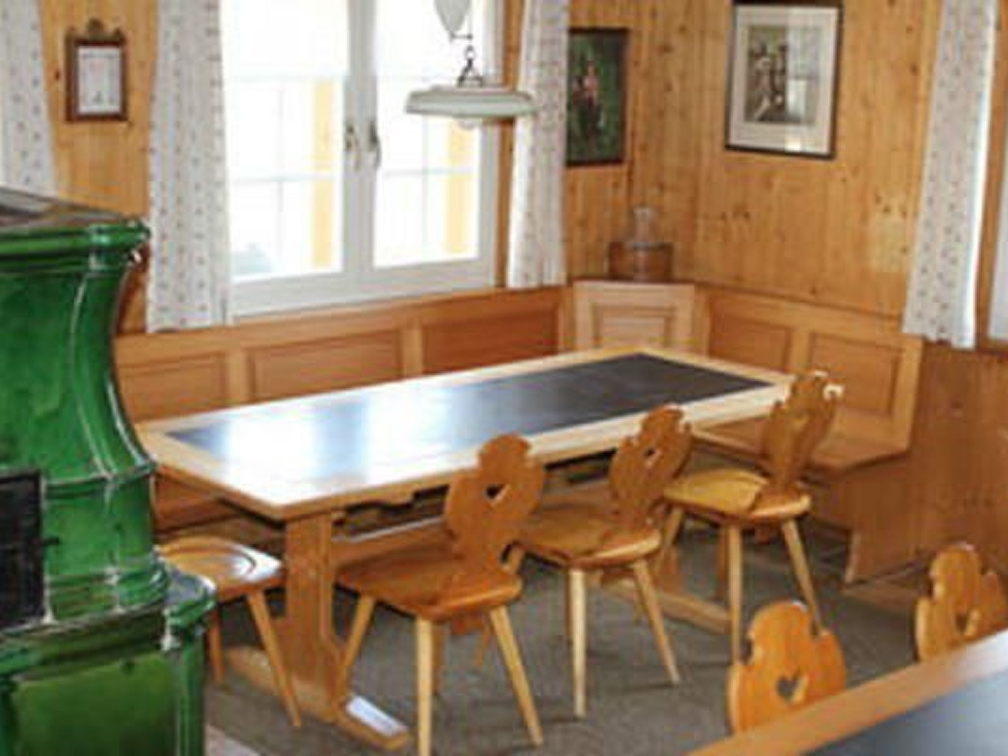 Das ehemalige Sticklokal wurde zur grossräumigen, hellen Stube mit original Kachelofen und grossem Schiefertisch. Ebenso gemütlich und heimelig ist die kleinere Toggenburger Stube, mit jahrhundertealtem Kachelofen. Die Öfen werden ausschliesslich mit Holz aus unserem eigenen Wald geheizt.