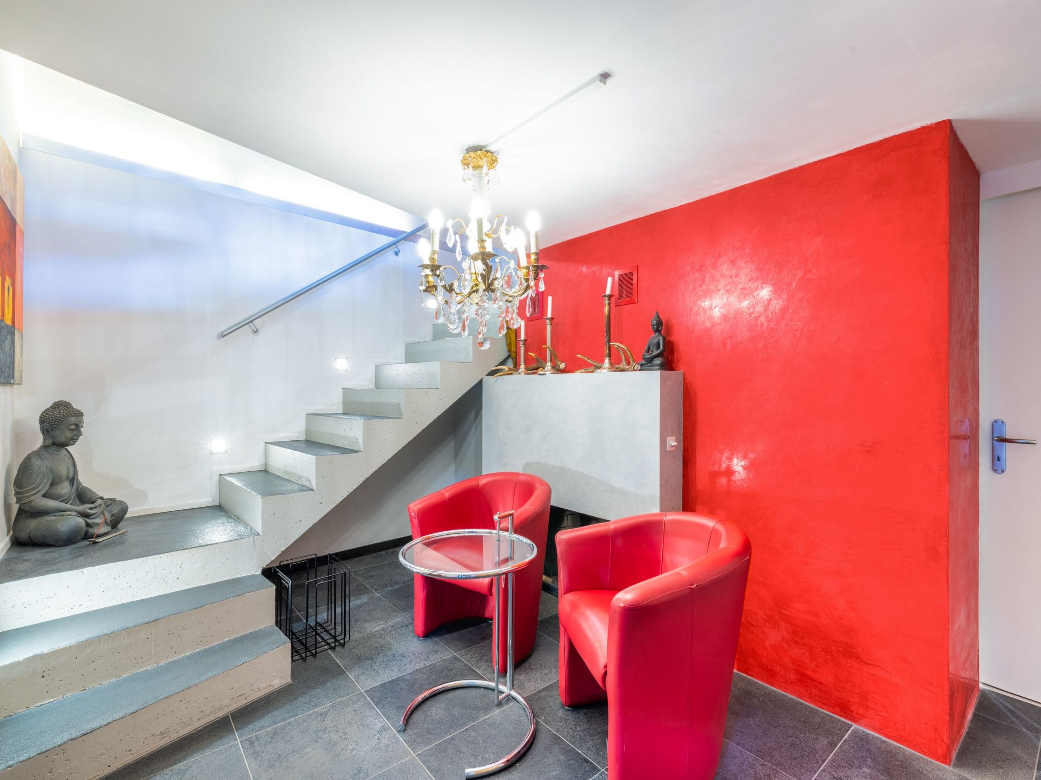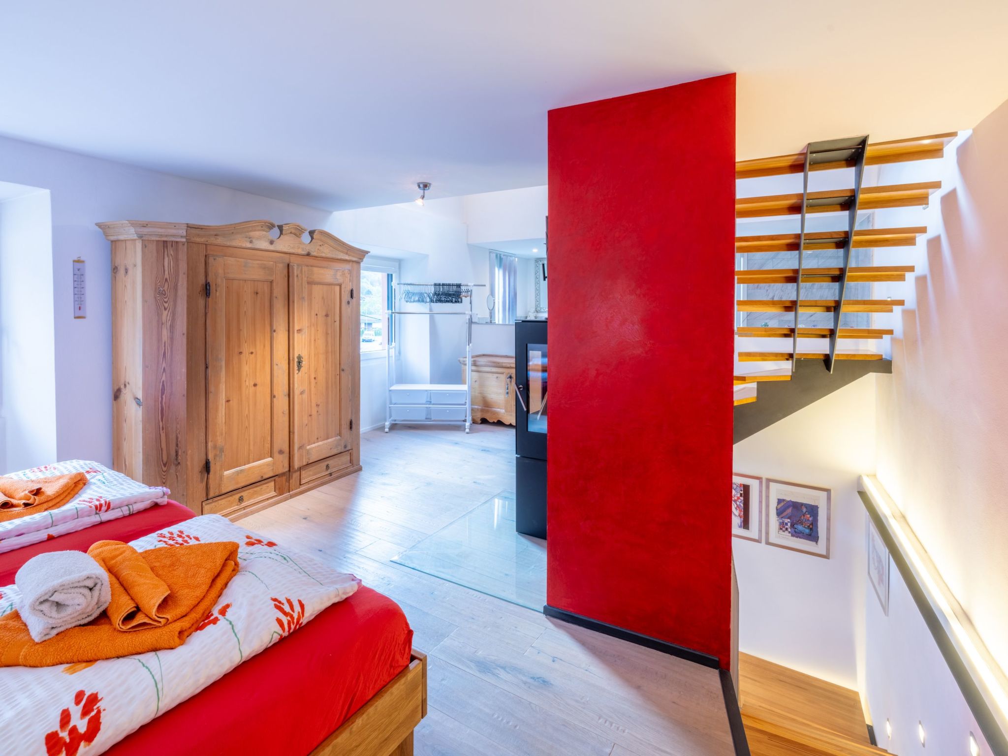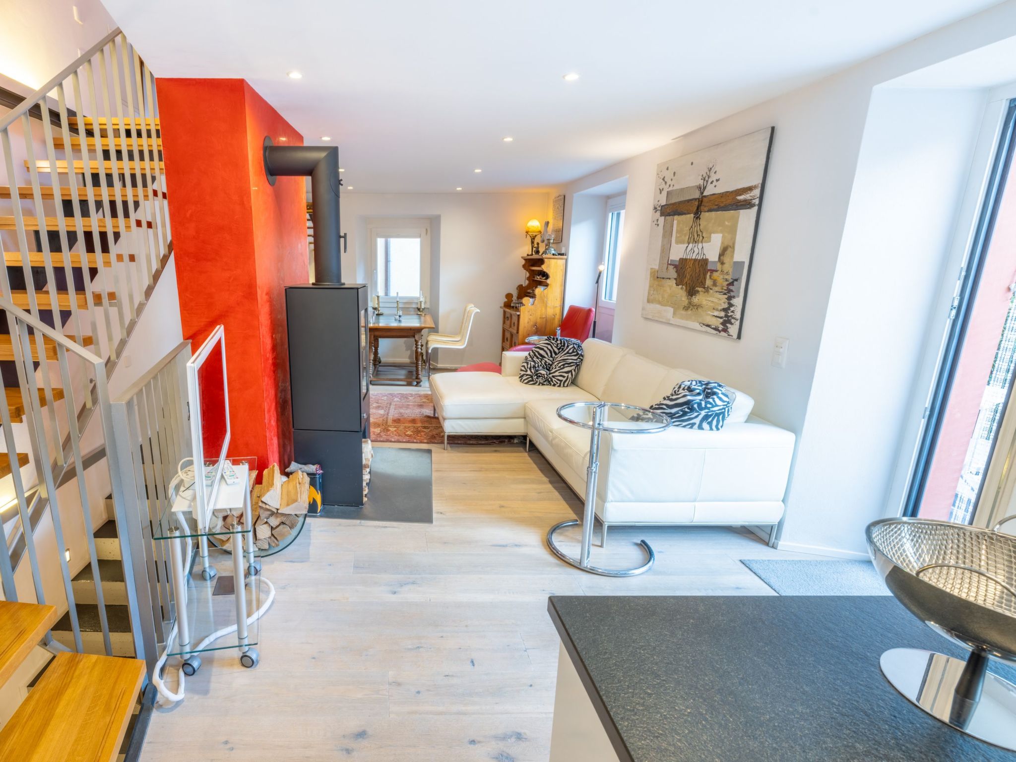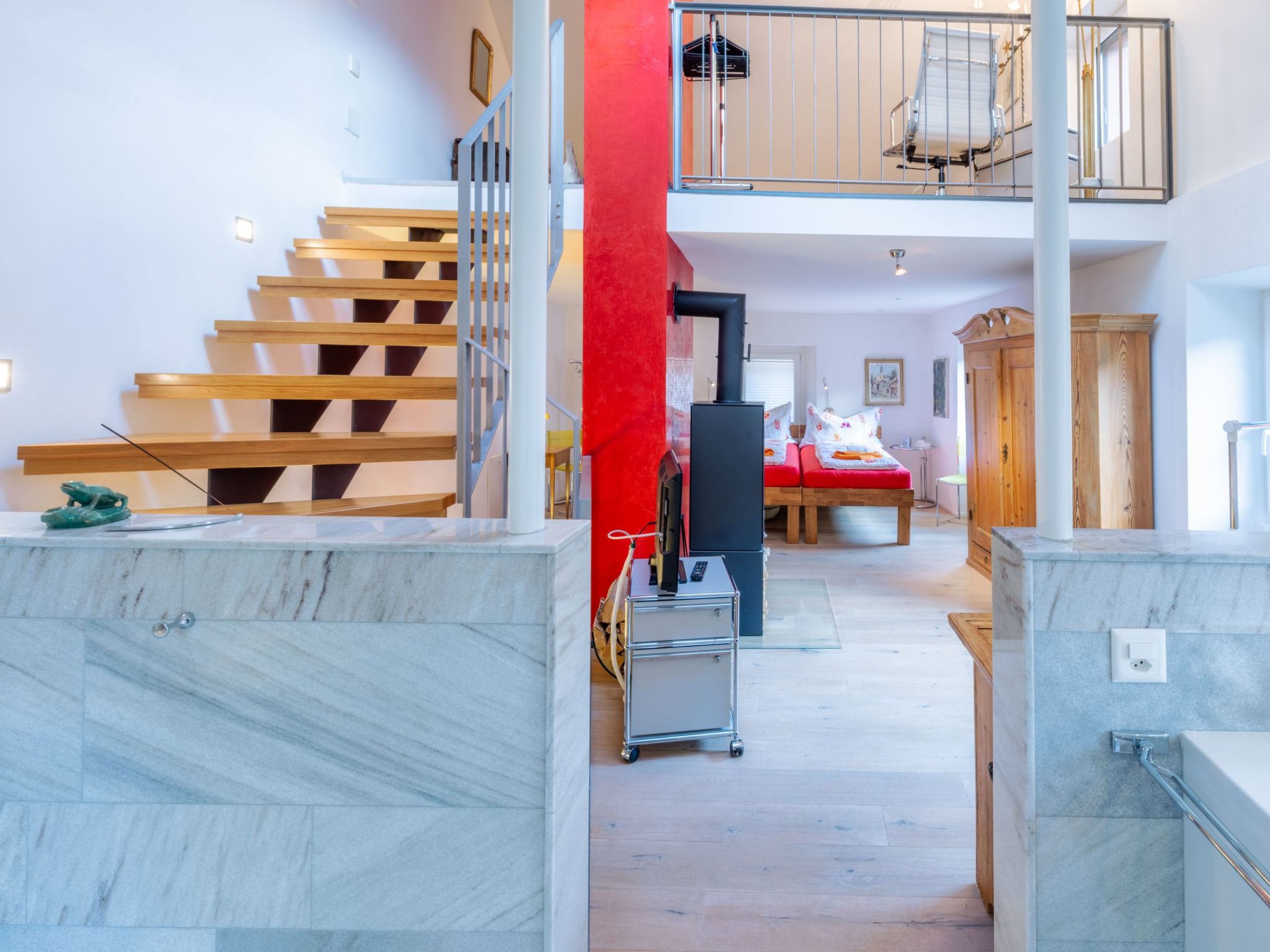 Innen überzeugt das Haus mit einem einzigartigen, mehrstöckigen Wohnbereich, der durch seine offene Gestaltung ohne Türen - mit Ausnahme des Technikraums und einer nicht abschließbaren Glas-Schiebetür zur Nasszelle - besticht. Die Innenausstattung umfasst - neben zwei eleganten Marmorbädern, einladende Eichenparkettböden im Wohnbereich und einer charakteristischen roten Stuckaturverkleidung der Kamine - auch moderne Annehmlichkeiten wie eine Wärmepumpenheizung mit Solarzellen und Bodenheizung. Die vollausgestattete Küche mit weißem Mobiliar, Glaskeramikherd und ausreichend Geschirr und Besteck - da sie regelmäßig von der Eigentümerin selbst genutzt wird - rundet das hochwertige Interieur ab.