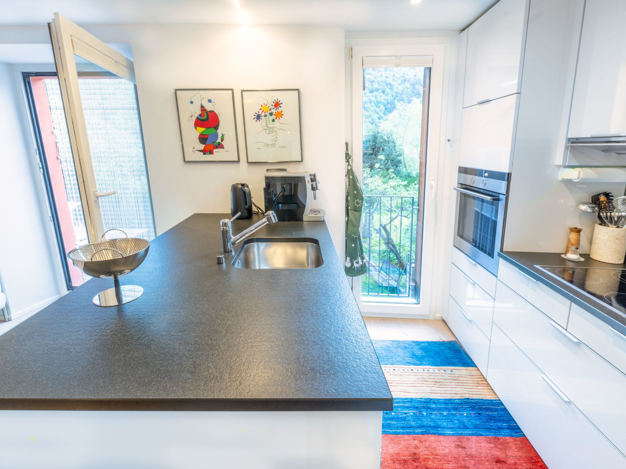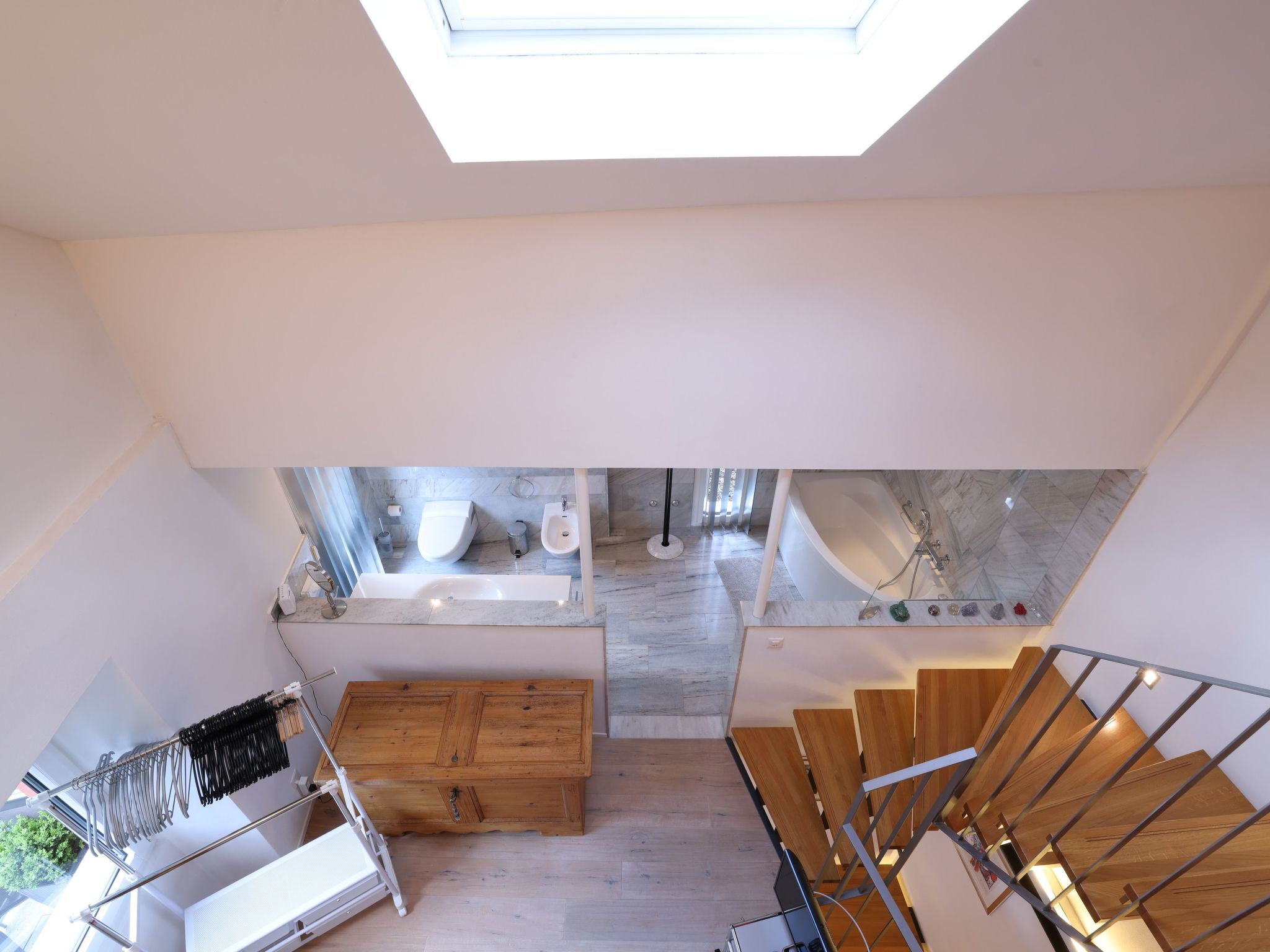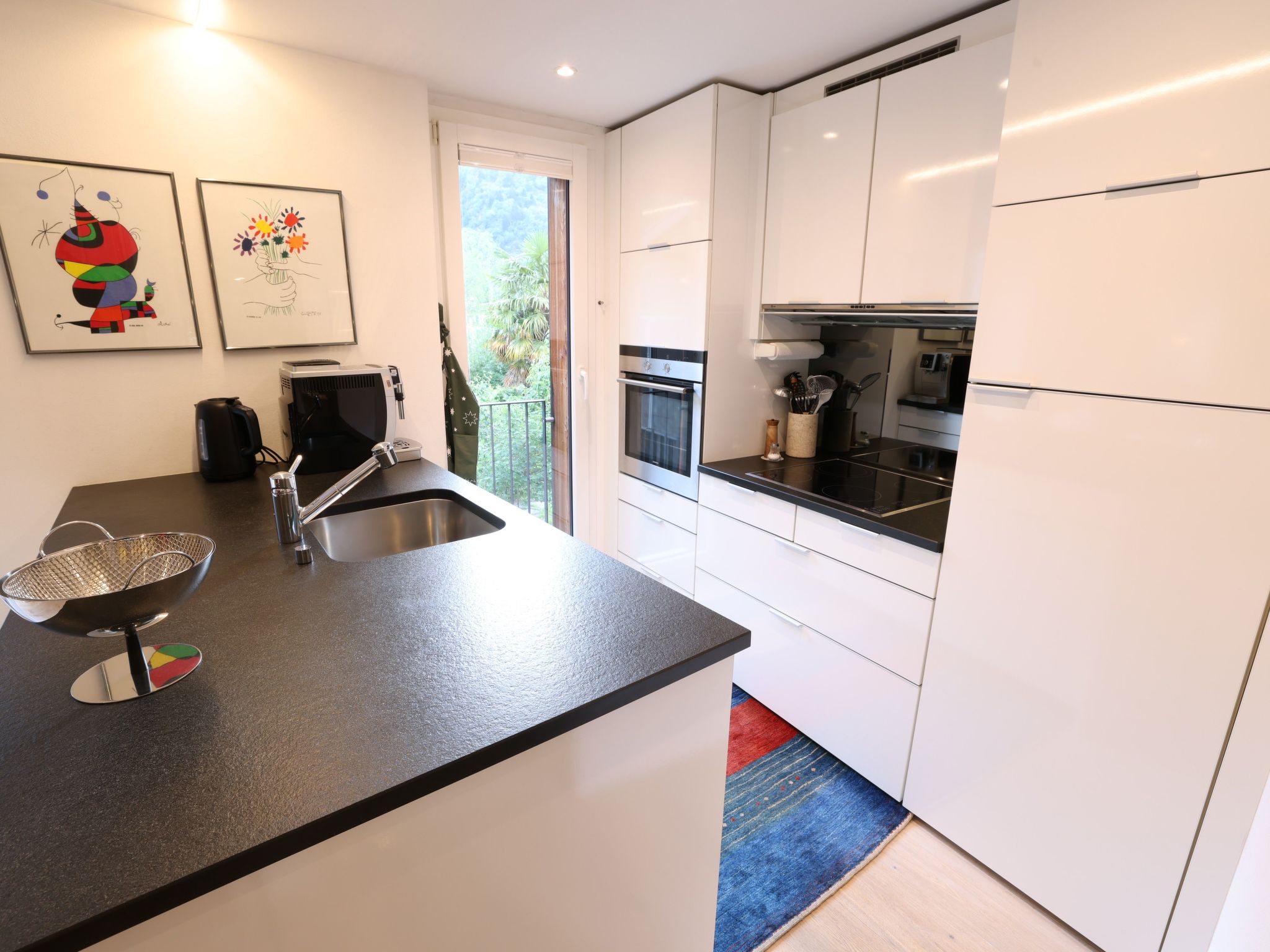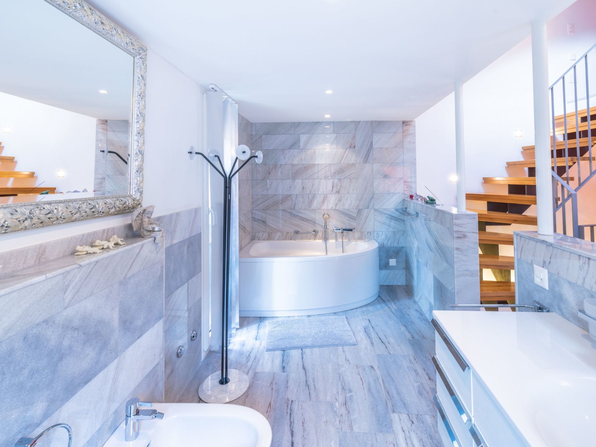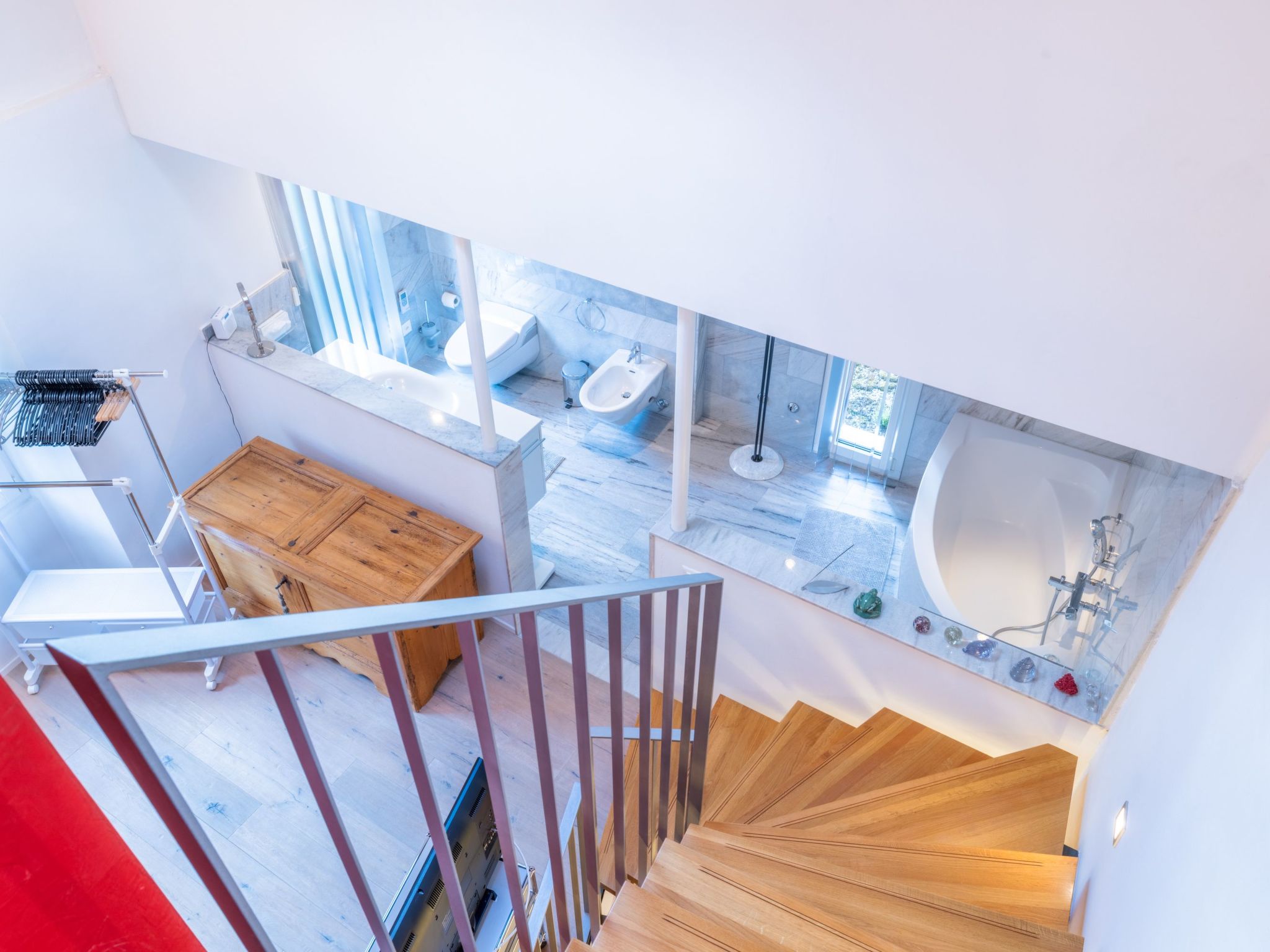 Innen überzeugt das Haus mit einem einzigartigen, mehrstöckigen Wohnbereich, der durch seine offene Gestaltung ohne Türen - mit Ausnahme des Technikraums und einer nicht abschließbaren Glas-Schiebetür zur Nasszelle - besticht. Die Innenausstattung umfasst - neben zwei eleganten Marmorbädern, einladende Eichenparkettböden im Wohnbereich und einer charakteristischen roten Stuckaturverkleidung der Kamine - auch moderne Annehmlichkeiten wie eine Wärmepumpenheizung mit Solarzellen und Bodenheizung. Die vollausgestattete Küche mit weißem Mobiliar, Glaskeramikherd und ausreichend Geschirr und Besteck - da sie regelmäßig von der Eigentümerin selbst genutzt wird - rundet das hochwertige Interieur ab.