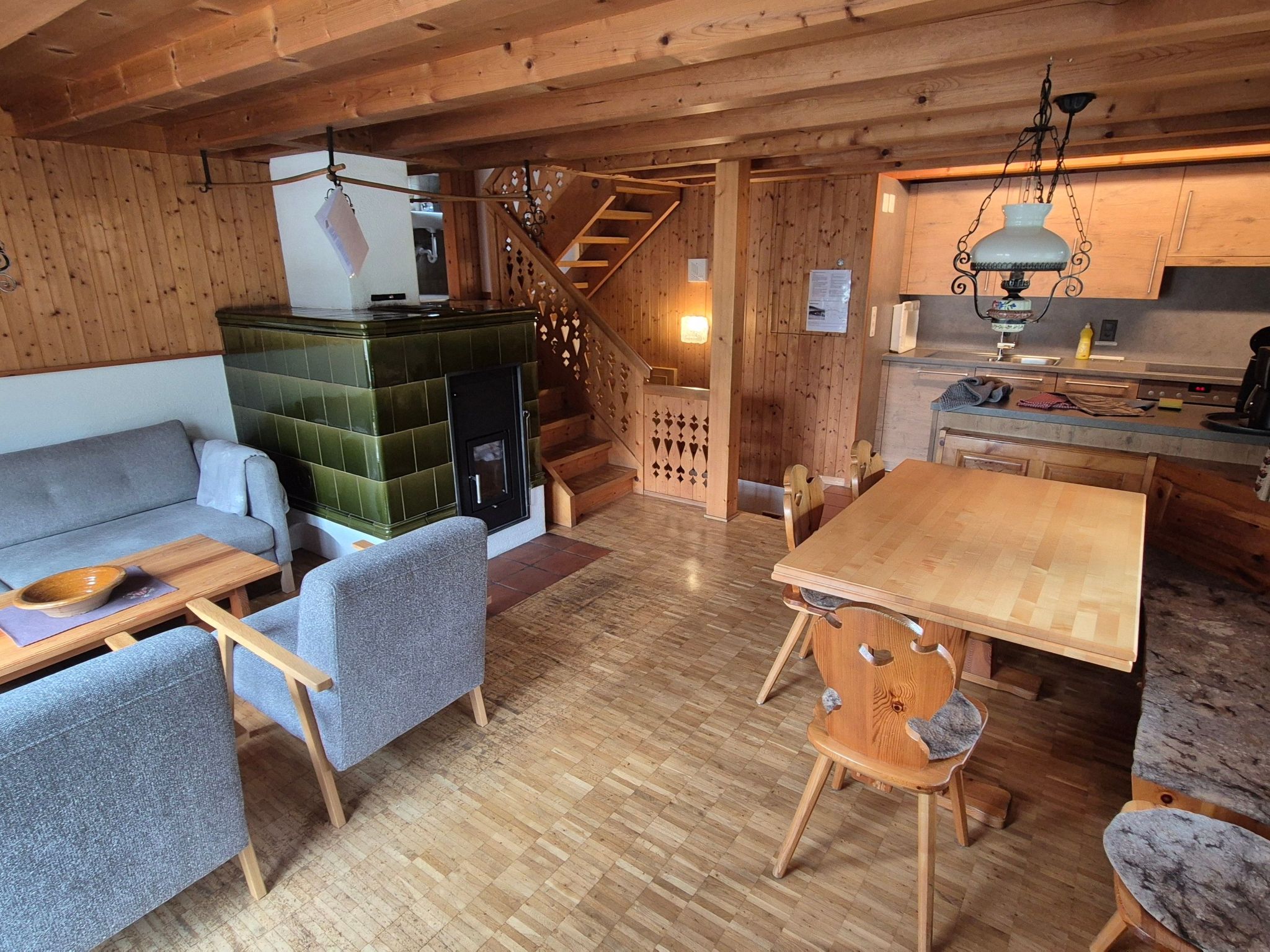Innen bietet das Ferienhaus Stutz eine gemütliche atmosphärische Wohnumgebung. Mit drei Schlafzimmern, eines davon mit separatem Zugang über das gemeinschaftliche Treppenhaus, bietet es ausreichend Platz für die ganze Familie. Die Küche ist komplett ausgestattet - inklusive Geschirrspüler, Geschirr, Besteck und aller notwendigen Küchengeräte - ideal für die Zubereitung gemeinsamer Mahlzeiten und zum Genießen in heimischer Atmosphäre.
