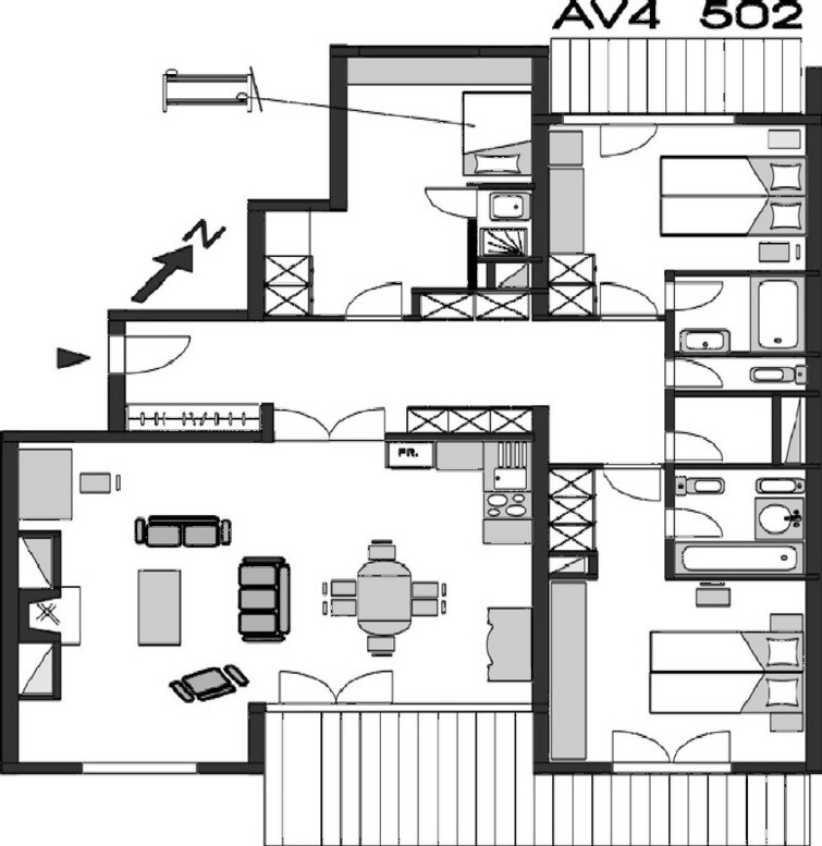 Wohnung mit Eingangskorridor, 1 Schlafzimmer mit 1 Doppelbett, 1 Schlafzimmer mit 2 Einzelbetten, 1 Schlafzimmer mit 1 ausziehbares Etagenbett für 3 Kinder, 3 Badezimmer und 2 separaten WC. Wohnzimmer (45 m2) mit Amerikanische Küche : 4 Kochplatten, Ofen, grosses Kühlschrank, Geschirrspülmaschine, Mikrowelle, Essecke, einem Sofabett für 2 Personen, ein Sofa und Sitzen, TV, DVD und Kamin. Grosses Südbalkon.