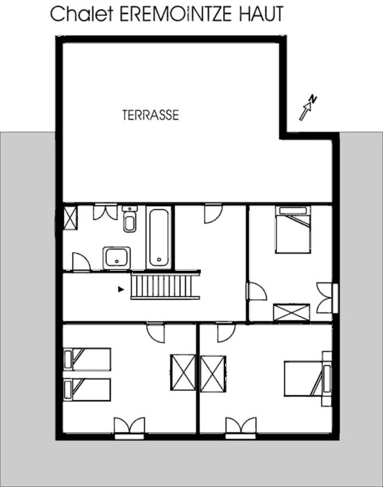 1. Stock : 1 Badezimmer mit Bad und WC, 1 Südschlafzimmer mit 1 ausziehbares Bett, Balkon, 1 Südschlafzimmer mit 1 Doppelbett, DVD mit Bildschirm, Balkon, 1 Ostenschlafzimmer mit 1 Doppelbett. Grosse Nordterrasse.
