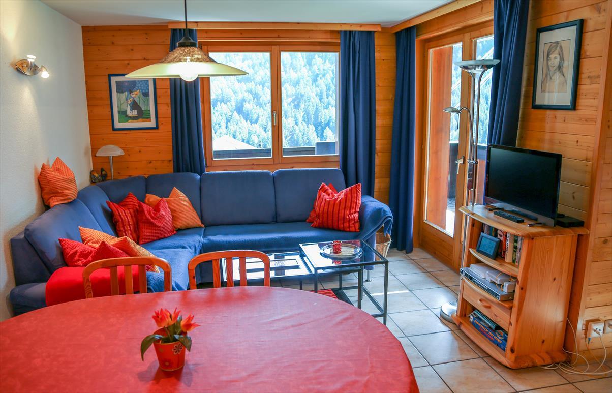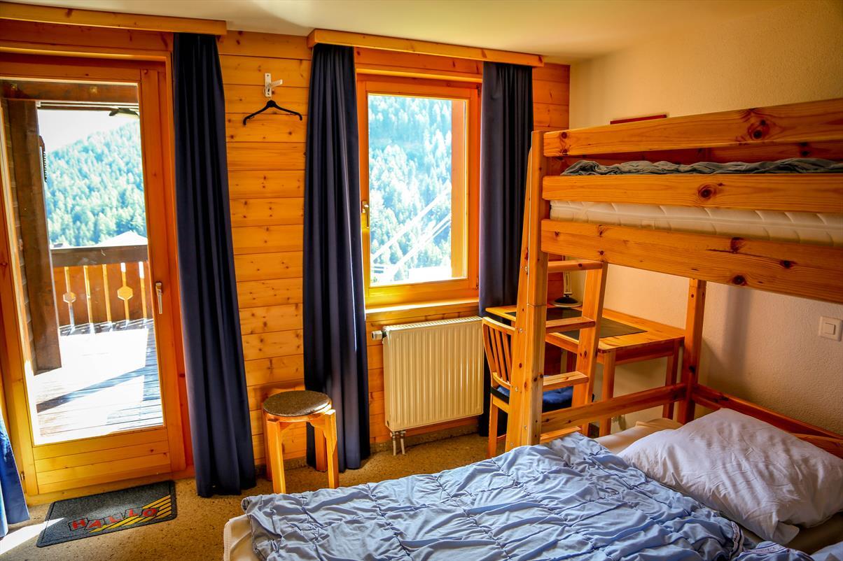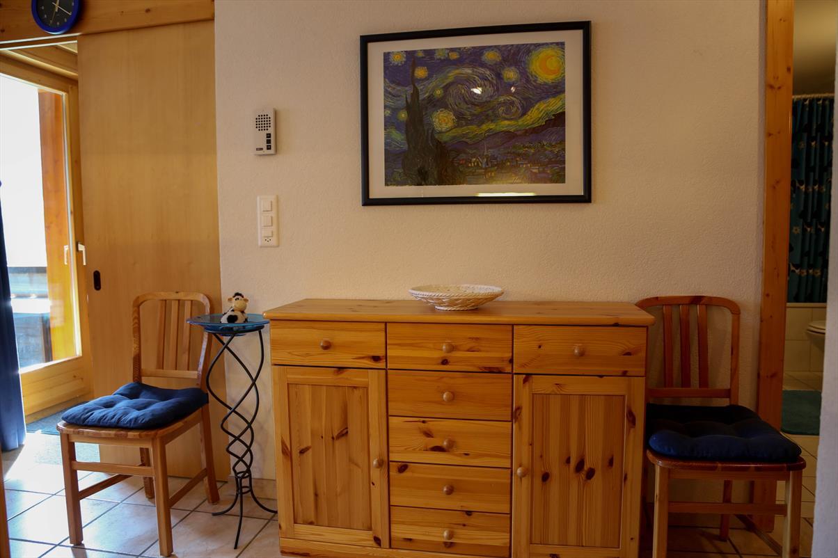 2-Zimmerwohnung für 2-4 Personen : Wohnraum mit Doppelsofabett (1.40x2.00) - Küche mit Geschirrspüler und Nespressokaffemaschine- 1 Zimmer mit 2 Betten und 1 Etagenbett - Bad / WC - Süd + Ostbalkon - TV - DVD - kostenloser Internetanschluss WIFI - Zugang zum Waschraum - Aussenparkplatz - Tiere nicht erlaubt - Nichtraucher