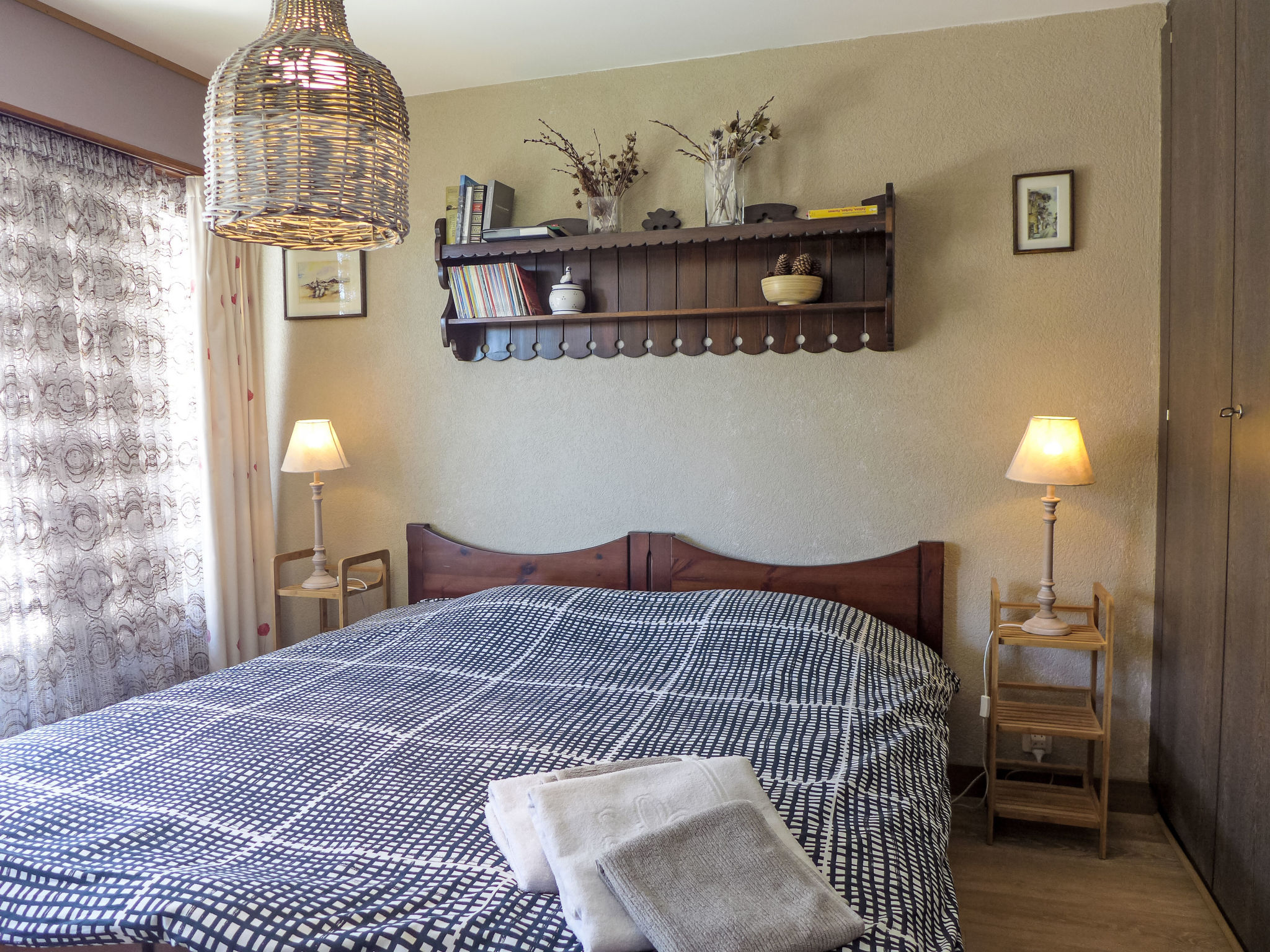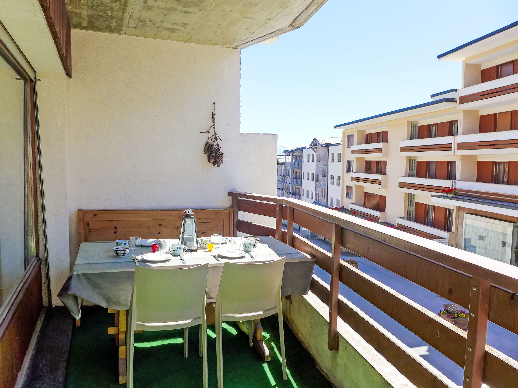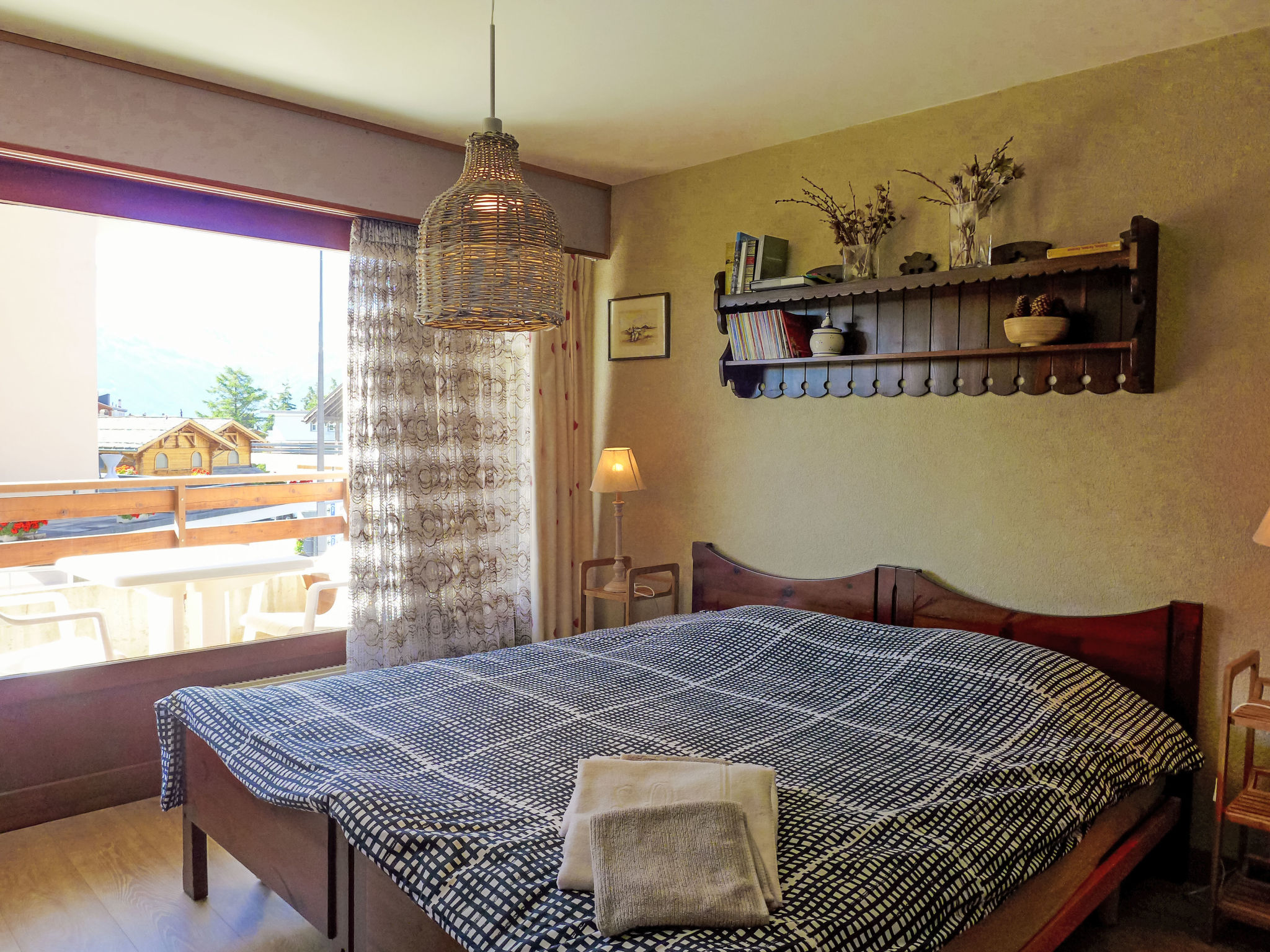 "Immeuble Rond-Point Apt. 11", 2-Zimmer-Wohnung 46 m2 im 1. Stock, Südlage. Wohn-/Esszimmer, Richtung Süden mit 1 Doppeldiwanbett (160 cm, Länge 190 cm), Essecke und Kabel-TV. Ausgang zum Balkon. 1 Zimmer, Richtung Süden mit 2 Betten (90 cm, Länge 200 cm). Ausgang zum Balkon. Offene Küche (3 Kochplatten, Backofen, Mikrowelle, elektrische Kaffeemaschine, Racletteofen, Fondue Set (Käse)) mit Esstisch. Bad/Bidet/WC. Ölheizung. Balkon 8 m2, Südlage. Balkonmöbel. Seitliche Sicht auf die Berge und die Ortschaft. Zur Verfügung: Internet (Wireless LAN). Garage Nr. 11. Bitte beachten: Nichtraucher-Unterkunft.