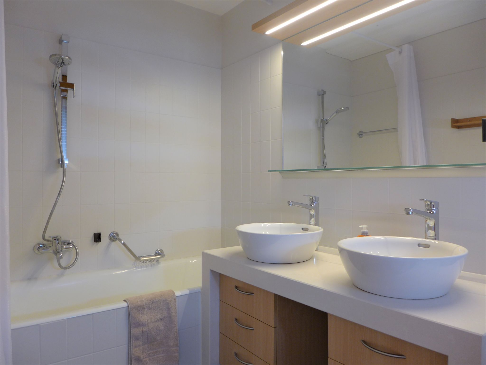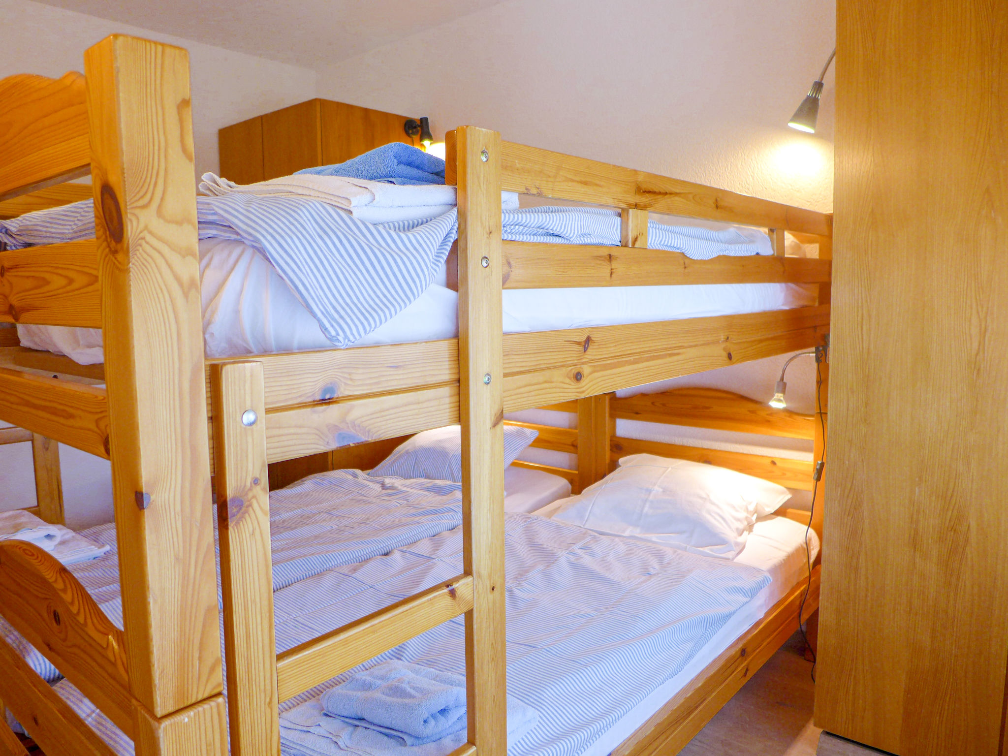 "Victoria C 8", 3-Zimmer-Wohnung 72 m2 im 3. Stock. Komfortabel und gemütlich eingerichtet: abgeschrägtes Wohn-/Esszimmer mit Kabel-TV und Flachbildschirm. Ausgang zum Balkon. 1 Zimmer mit 2 Betten (90 cm, Länge 200 cm), Bad/WC. 1 Zimmer mit 2 x 2 Etagenbetten (80 cm, Länge 190 cm). Ausgang zum Balkon, Richtung Osten. Kochnische (Backofen, Geschirrspüler, 4 Glaskeramikplatten, Toaster, Wasserkocher, Mikrowelle, elektrische Kaffeemaschine, Kapseln für die Kaffeemaschine (NESPRESSO) extra, Racletteofen, Fondue Set (Käse)) mit Esstisch. Dusche/WC. Balkon, Südwestlage. Balkonmöbel. Sicht auf die Berge. Zur Verfügung: Bügeleisen, Haartrockner. Internet (WLAN, gratis). Garage Nr. 8, Höhe 200 cm, Breite 220 cm. Bitte beachten: Nichtraucher-Unterkunft.