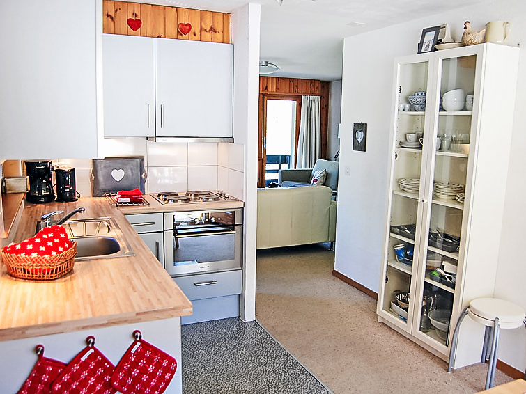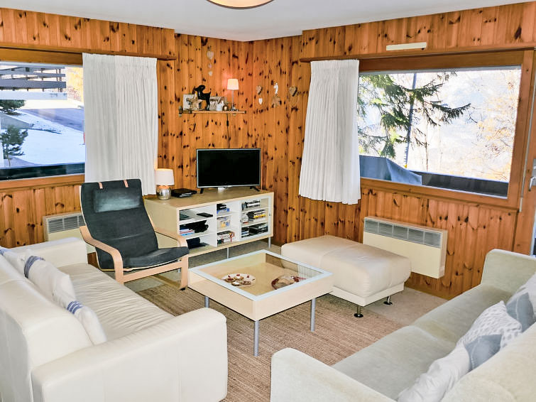 "Prachalier I No6", 3-Zimmer-Wohnung 68 m2 im 1. Stock. Komfortabel eingerichtet: Wohnzimmer mit Kabel-TV und DVD. Ausgang zum Balkon. 1 Zimmer mit 1 franz. Bett (180 cm, Länge 200 cm). 1 kleines Zimmer mit 1 Doppelbett (160 cm, Länge 200 cm). Küche (4 Kochplatten, Backofen, Geschirrspüler, Toaster, Wasserkocher, elektrische Kaffeemaschine, Kombinationsmikrowelle, Fondue Set (Käse)) mit Essecke. Ausgang zum Balkon. Bad/WC. Balkon, Südlage Balkon, Westlage und Nordlage. Schöne Sicht auf die Berge, das Tal und die Ortschaft. Zur Verfügung: Babybett, Haartrockner. Internet (Wireless LAN, gratis). Bitte beachten: Nichtraucher-Haus.