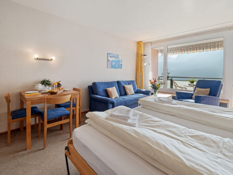 1-Zimmer-Wohnung 28 m2 im 3. Stock. Gemütlich eingerichtet: Wohn-/Esszimmer mit 2 Wandschrankbetten, Sat-TV und Radio. Ausgang zum Balkon. Kochnische (3 Kochplatten, Backofen). Sitzbad/WC. Balkon, Ostlage. Balkonmöbel. Schöne Sicht auf die Berge, die Landschaft und die Ortschaft. Zur Verfügung: Internet (Wireless LAN, gratis). Bitte beachten: Nichtraucher-Unterkunft.