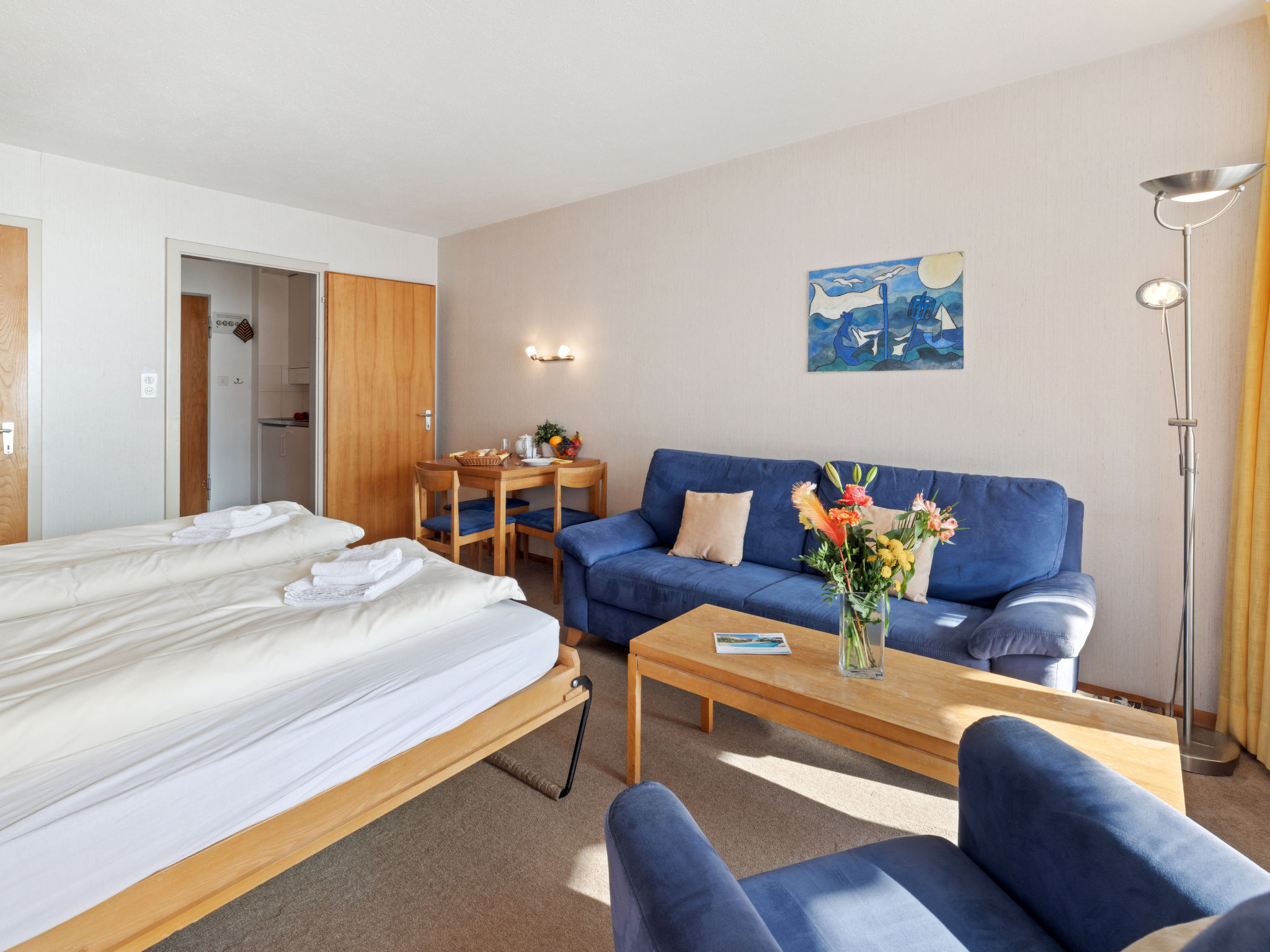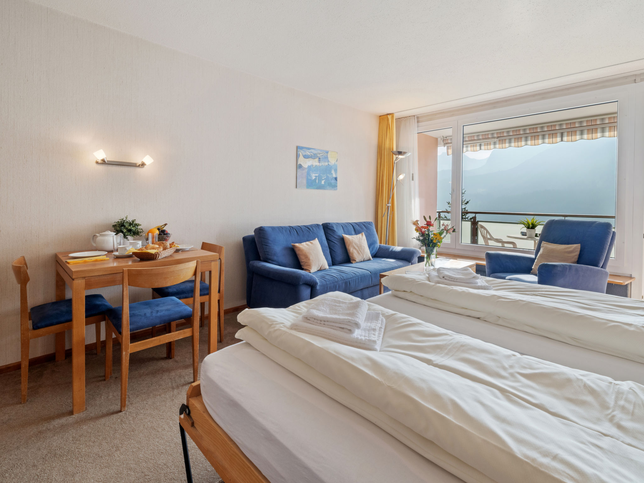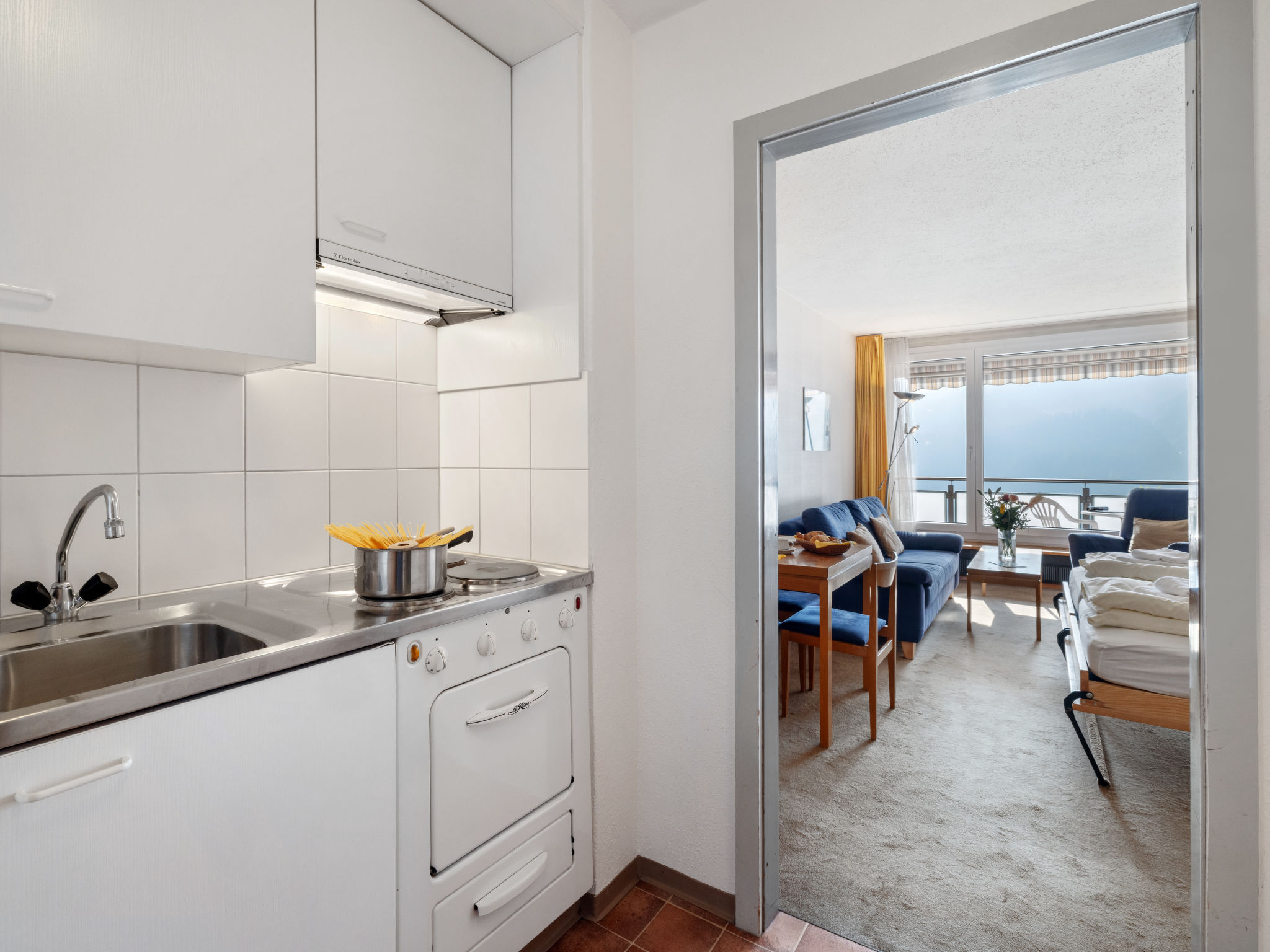 "Promenade Apt 306", 1-Zimmer-Wohnung 28 m2 im 3. Stock. Gemütlich eingerichtet: Wohn-/Esszimmer mit 2 Wandschrankbetten, Sat-TV und Radio. Ausgang zum Balkon. Kochnische (3 Kochplatten, Backofen). Sitzbad/WC. Balkon, Ostlage. Balkonmöbel. Schöne Sicht auf die Berge, die Landschaft und die Ortschaft. Zur Verfügung: Internet (WLAN, gratis). Bitte beachten: Nichtraucher-Unterkunft.