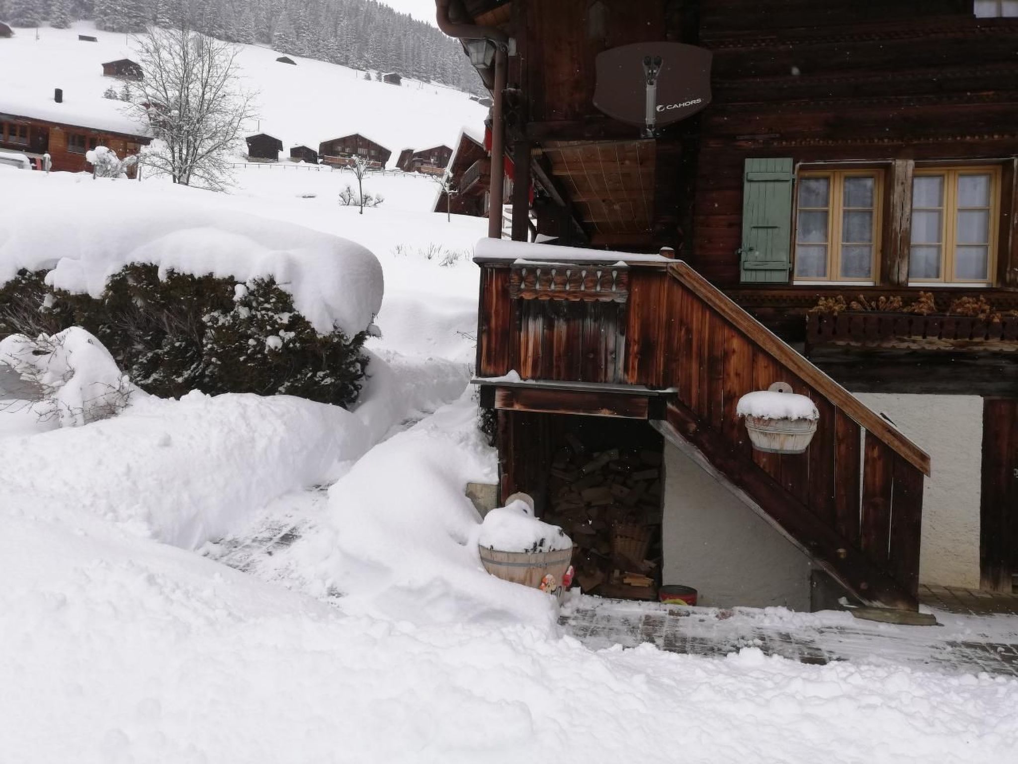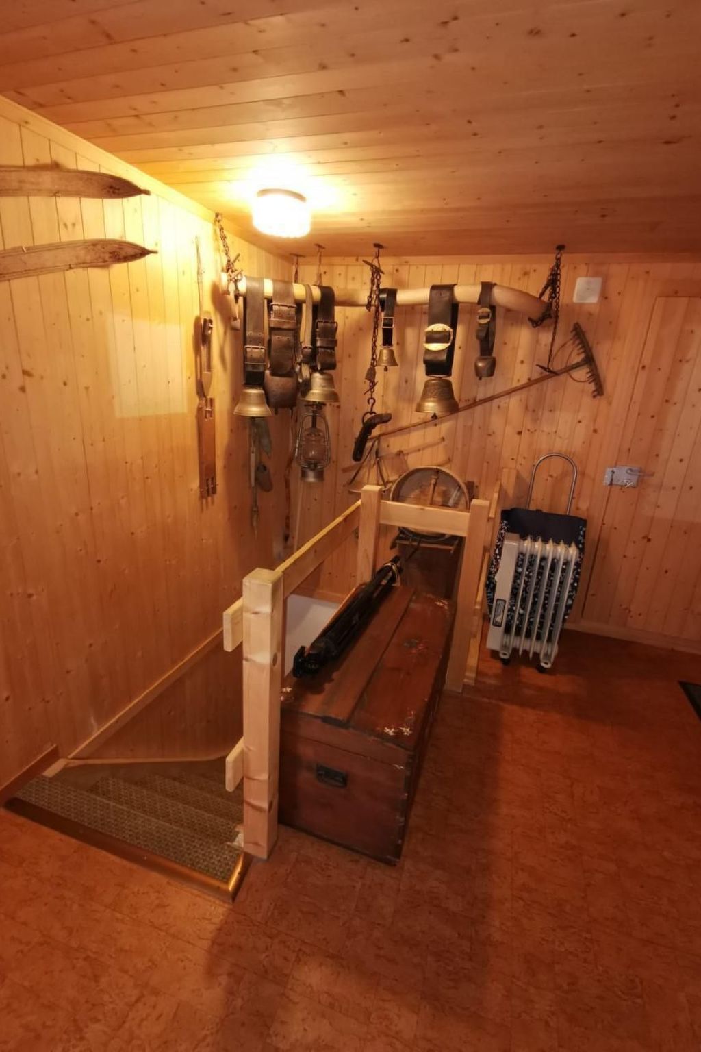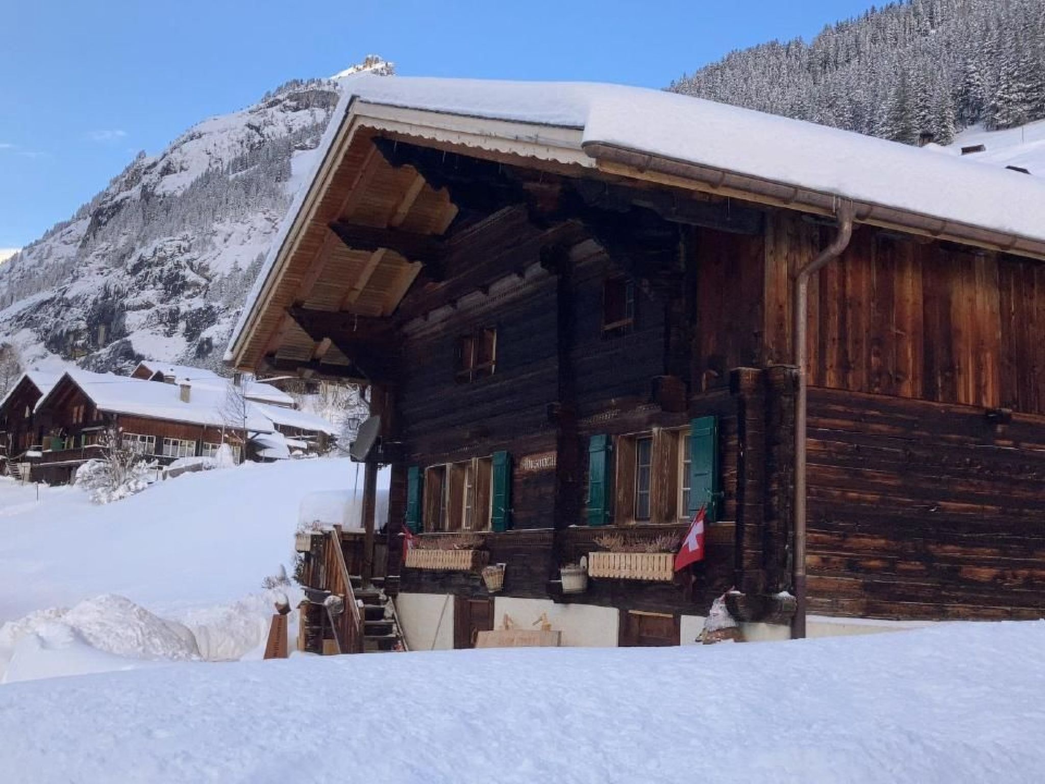 Ab Wintersaison '24 sorgt der Handlauf im Treppenaufstieg für mehr Sicherheit im Haus. Für kurzweilige Apéros oder Schlummerbecher lädt die original Gimmelwalder Gartenbar ein.