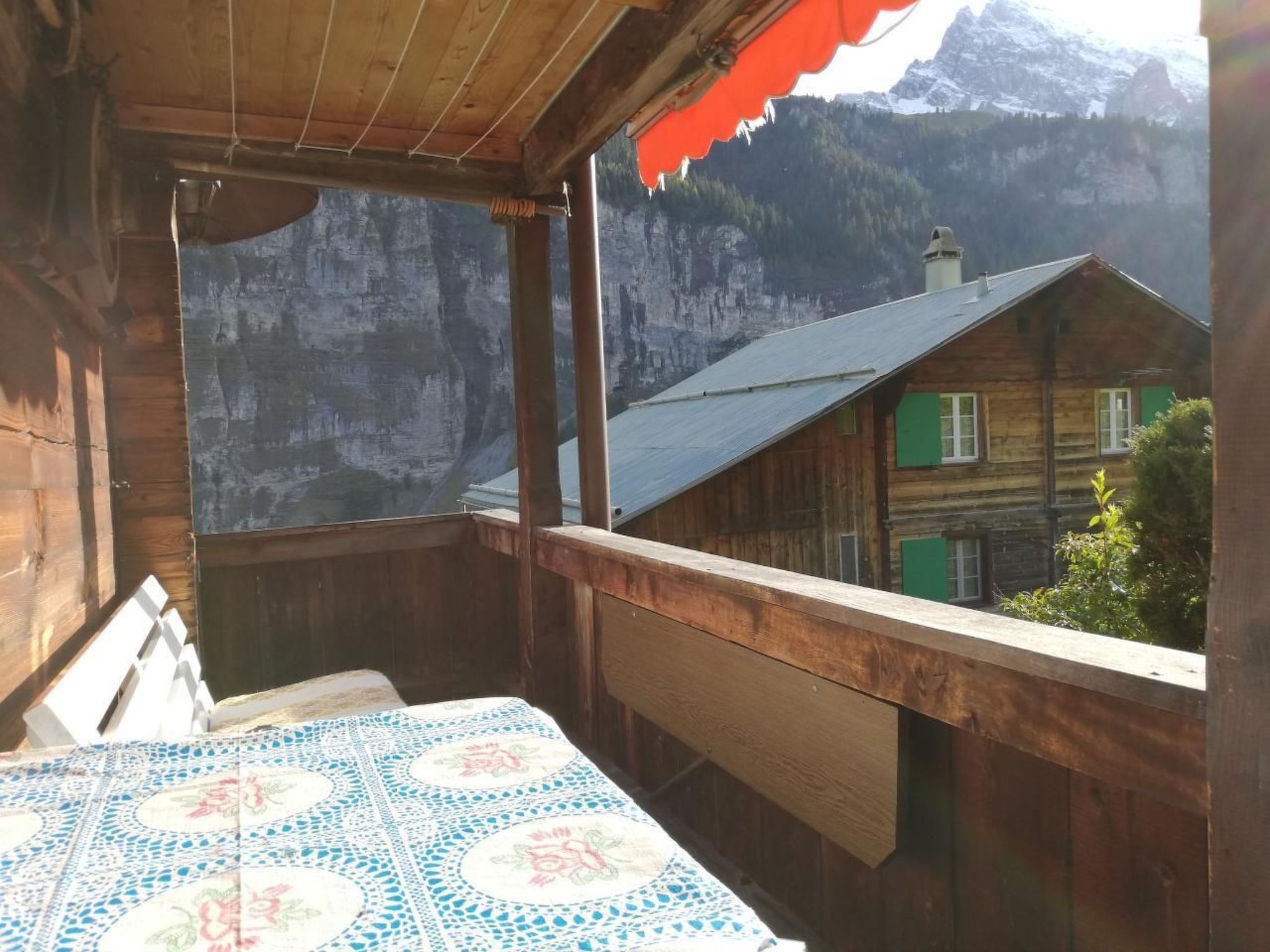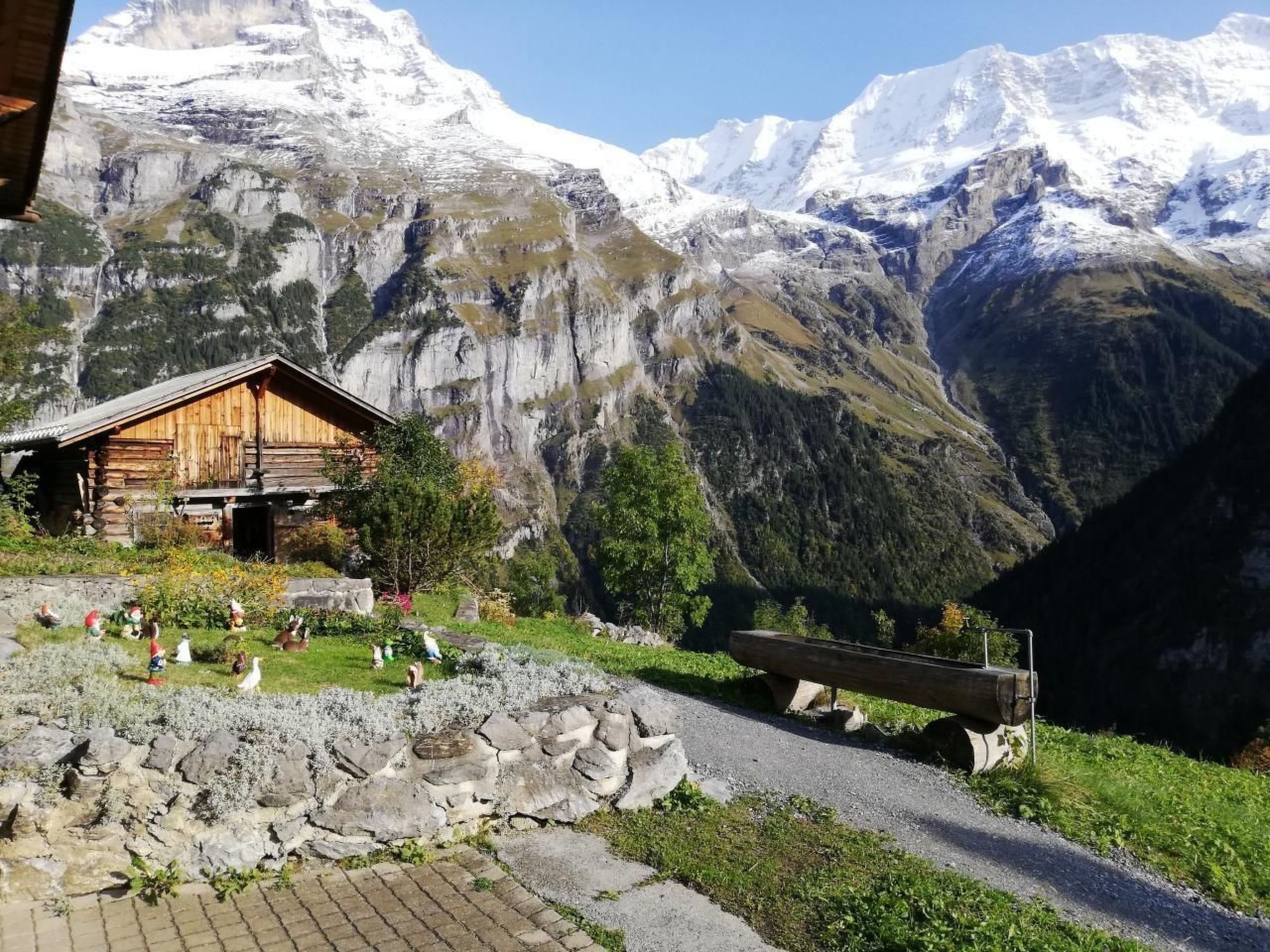 Aussenplatz mit Gartencheminée oder die geschützte Laube laden zum Verweilen ein. Der neuplatzierte Aussensitzplatz vor dem Haus mit grossem Tisch bietet einen wunderbaren Ausblick auf die Berge: Mönch, Jungfrau, Breithorn, Tschingelhorn, Spitzhorn, Grosshorn, Gespaltenhorn und Büttlassen und Sefinenfurke, welche die Verbindung ins Kiental herstellt.