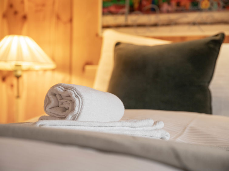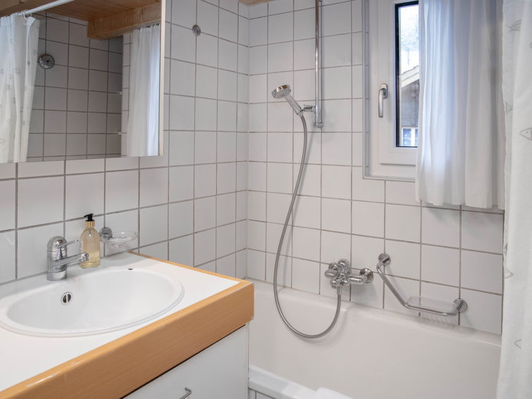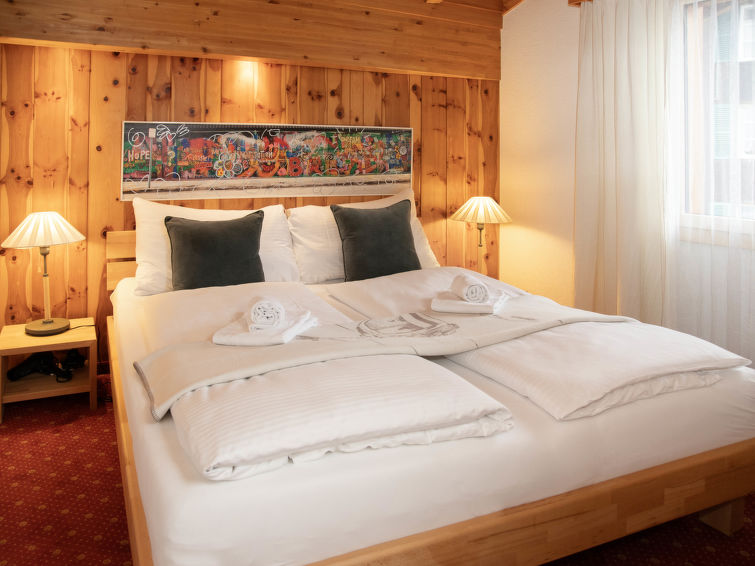 2-Zimmer-Wohnung 56 m2 auf 2 Stockwerken, im Dachgeschoss, Nordostlage. Teilweise abgeschrägt, komfortabel und geschmackvoll eingerichtet: Wohn-/Esszimmer mit Dachfenster mit offenem Kamin und Kabel-TV (Flachbildschirm). Ausgang zum Balkon, Richtung Norden. 1 Zimmer mit 1 Doppelbett (2 x 90 cm, Länge 200 cm). Abgeschrägte, offene Galerie, - 160 cm. Küche (4 Kochplatten, Backofen, Geschirrspüler, 4 Glaskeramikplatten, Toaster, Wasserkocher, elektrische Kaffeemaschine). Bad, sep. WC. Balkon, Nordlage. Terrassenmöbel. Sicht auf den Garten. Zur Verfügung: Babybett, Haartrockner. Internet (Wireless LAN, gratis). Garage (extra). Bitte beachten: Nichtraucher-Unterkunft. Maximal 1 Haustier/Hund erlaubt. Ein Fondue Set (Fleisch oder Käse) sowie ein Raclette Ofen kann an der Rezeption ausgeliehen werden. Originelle Grundrisskonzeption mit Galerie. Für Gehbehinderte nicht geeignet. Zutritt zur Wohnung mit Aufzug und Treppe rauf.