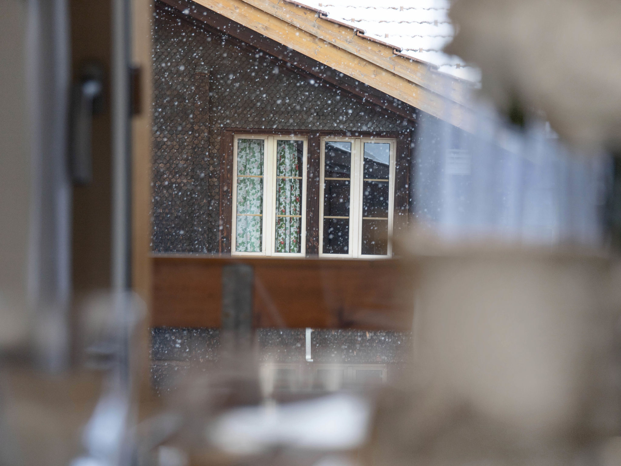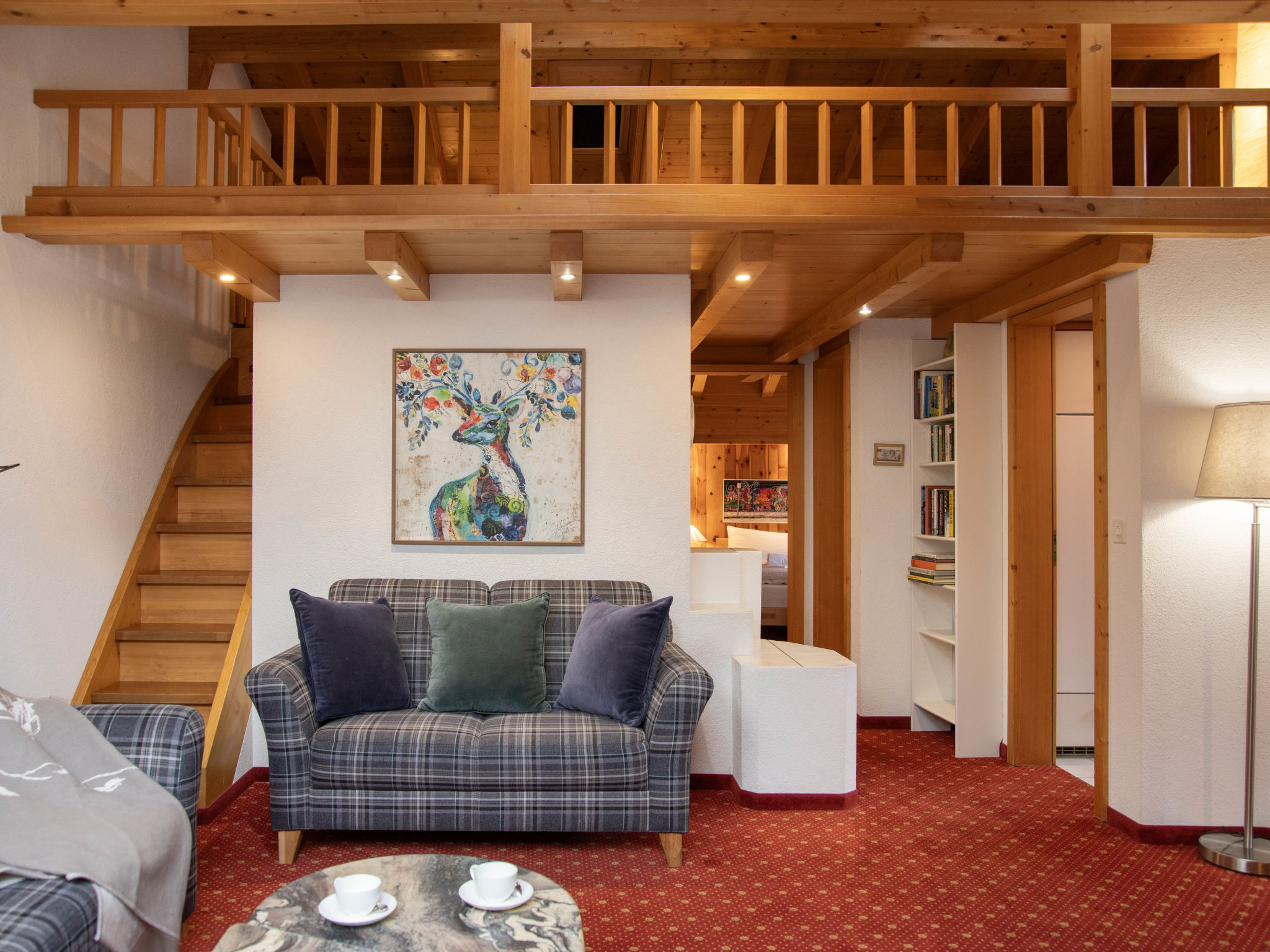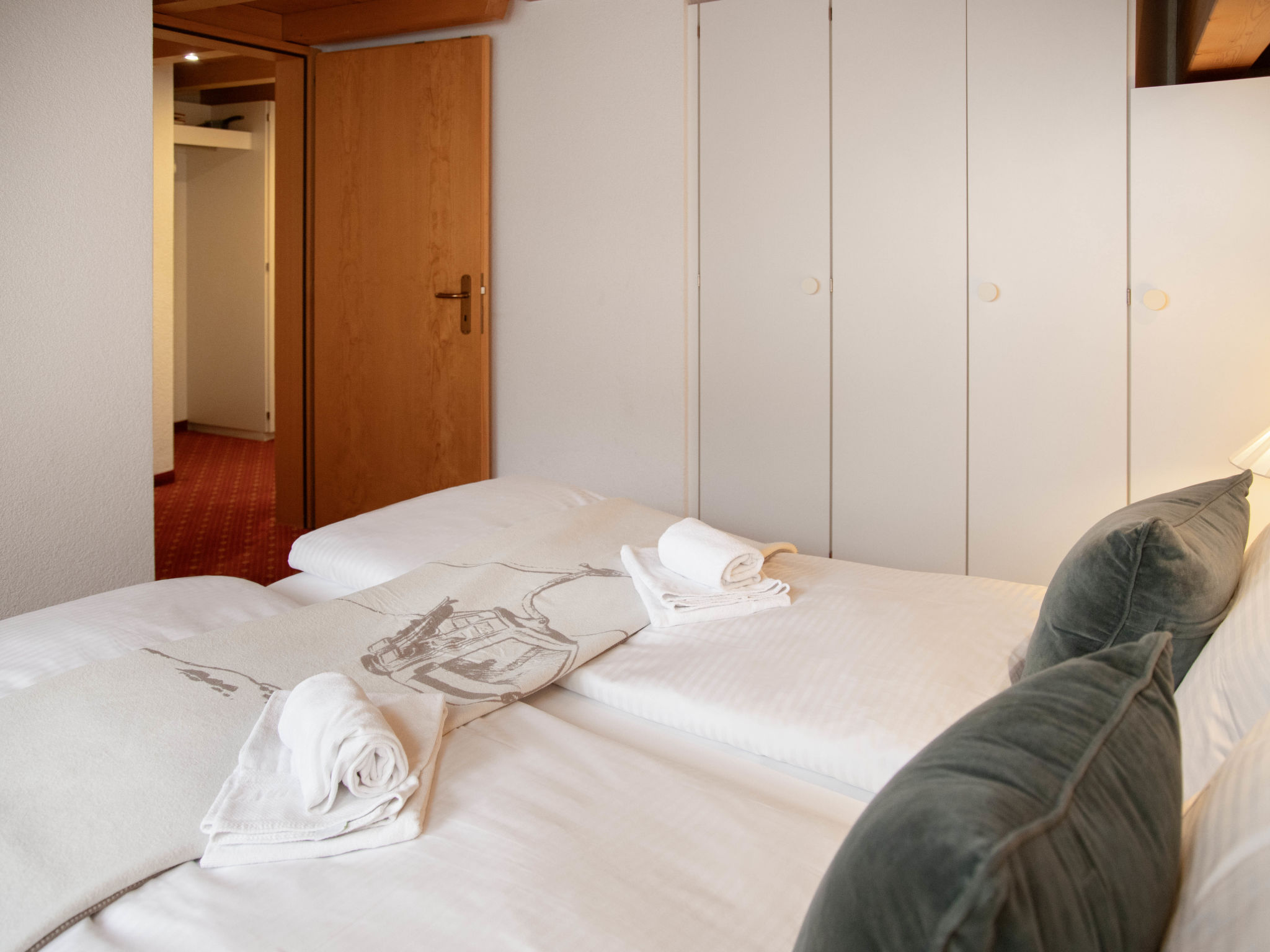 2-Zimmer-Wohnung 56 m2 auf 2 Stockwerken, im Dachgeschoss, Nordostlage. Teilweise abgeschrägt, komfortabel und geschmackvoll eingerichtet: Wohn-/Esszimmer mit Dachfenster mit offenem Kamin und Kabel-TV (Flachbildschirm). Ausgang zum Balkon, Richtung Norden. 1 Zimmer mit 1 Doppelbett (2 x 90 cm, Länge 200 cm). Abgeschrägte, offene Galerie, - 160 cm. Küche (4 Kochplatten, Backofen, Geschirrspüler, 4 Glaskeramikplatten, Toaster, Wasserkocher, elektrische Kaffeemaschine, Kapseln für die Kaffeemaschine (Nespresso) extra). Bad, sep. WC. Balkon, Nordlage. Terrassenmöbel. Sicht auf den Garten. Zur Verfügung: Babybett, Haartrockner. Internet (WLAN, gratis). Garage (extra). Bitte beachten: Nichtraucher-Unterkunft. Maximal 1 Haustier/Hund erlaubt. Ein Fondue Set (Fleisch oder Käse) sowie ein Raclette Ofen kann an der Rezeption ausgeliehen werden. Originelle Grundrisskonzeption mit Galerie. Für Gehbehinderte nicht geeignet. Zutritt zur Wohnung mit Aufzug und Treppe rauf.