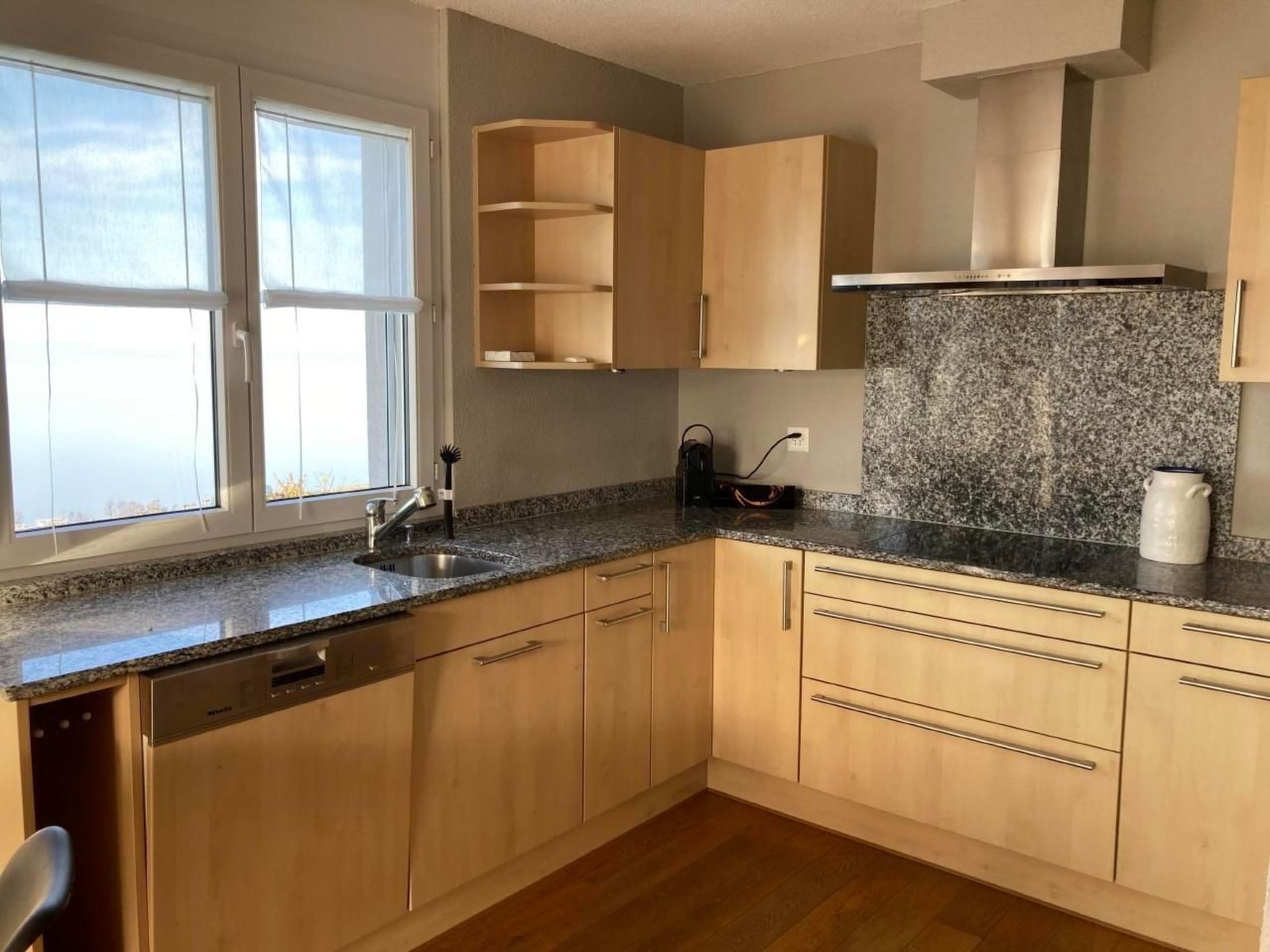 Die Küche ist voll ausgestattet; Geschirrspüler, Mikrowelle, Wasserkocher, Toaster, Backofen mit Steamerfunktion, Nespresso-Kaffeemaschine, Glaskeramikherd, Kühlschrank mit Tiefkühlfach, diverses Geschirr, Pfannen etc. vorhanden