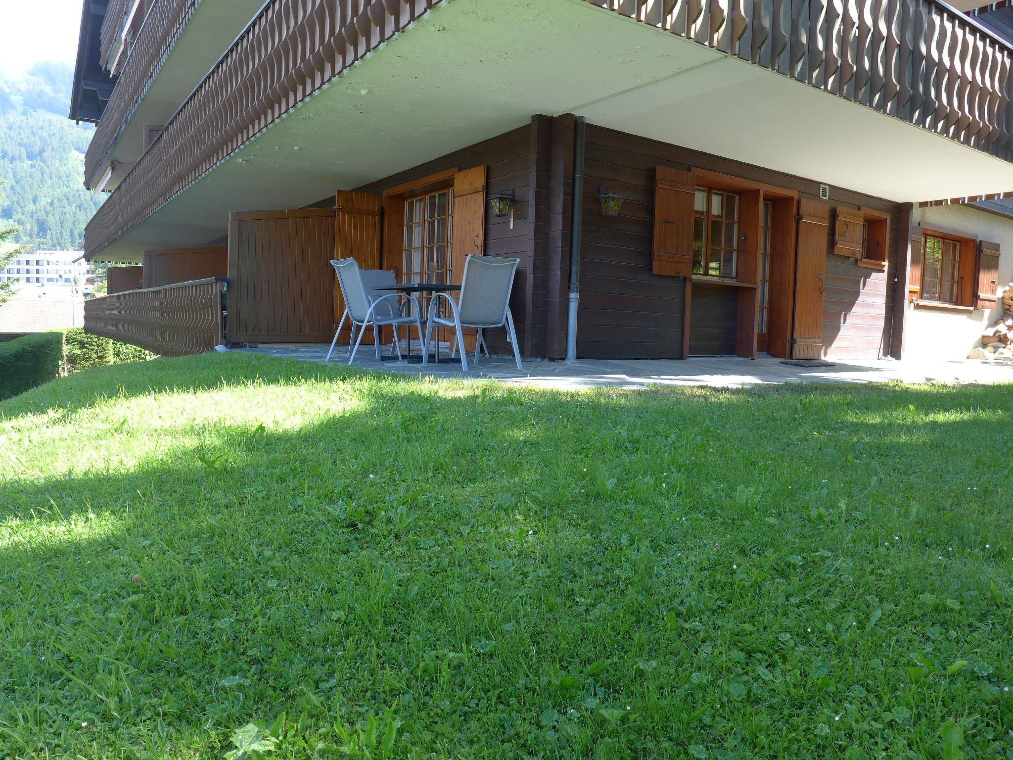 "Le Brévent 4", 2-Zimmer-Wohnung 45 m2, im ebenerdigen Untergeschoss, Südlage. Zweckmässig eingerichtet: Wohn-/Esszimmer mit 1 Diwanbett und TV. Ausgang zur Terrasse. 1 Zimmer mit 2 x 2 Etagenbetten. Kochnische (3 Kochplatten, Backofen, Geschirrspüler, Toaster, Wasserkocher, elektrische Kaffeemaschine, Racletteofen, Fondue Set (Käse)). Bad/WC. Terrasse, Südlage. Terrassenmöbel. Sicht auf die Landschaft. Zur Verfügung: Bügeleisen, Haartrockner. Bitte beachten: kein Parkplatz. Kein Fahrstuhl.