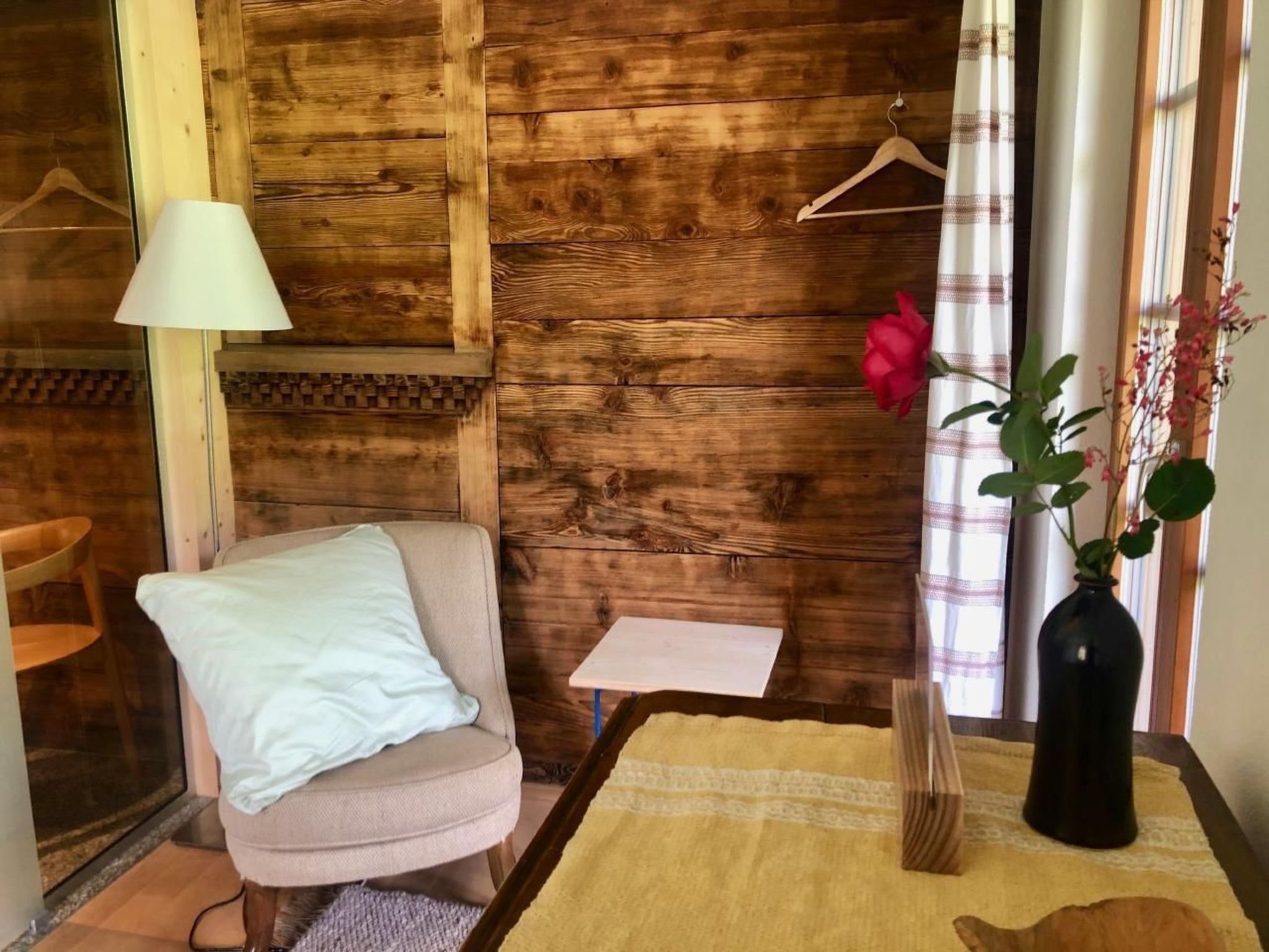 Sonstige Wohnzimmerausstattung (Wohnzimmer1): Das Wohnzimmer ist mit einem bequemen Sofas, 2 Sesseln, einem originellem Salontisch mit Schachbrett, einem Esstisch mit Eckbank, einem Sideboard, TV und einem Schwedenofen ausgestattet.