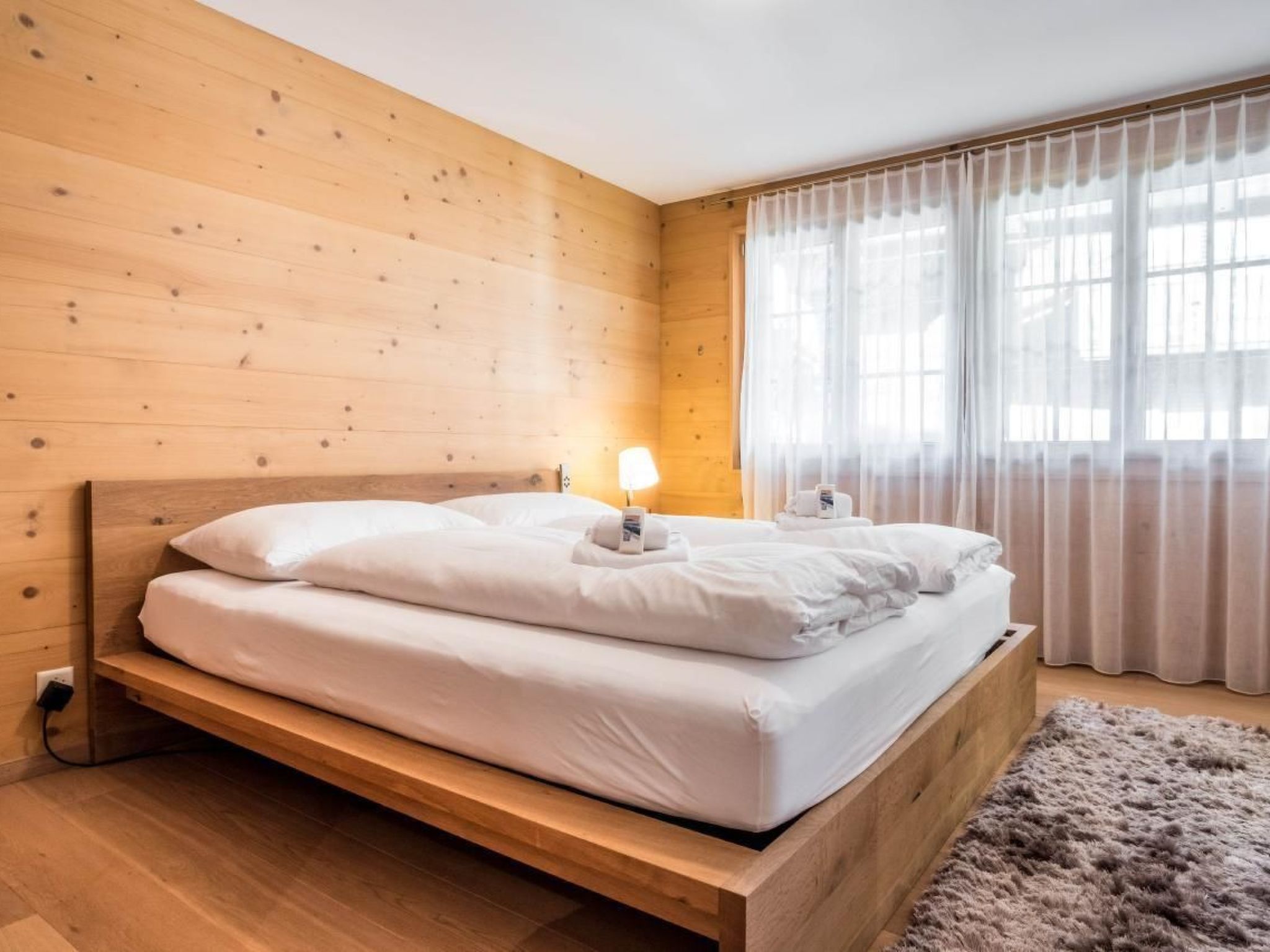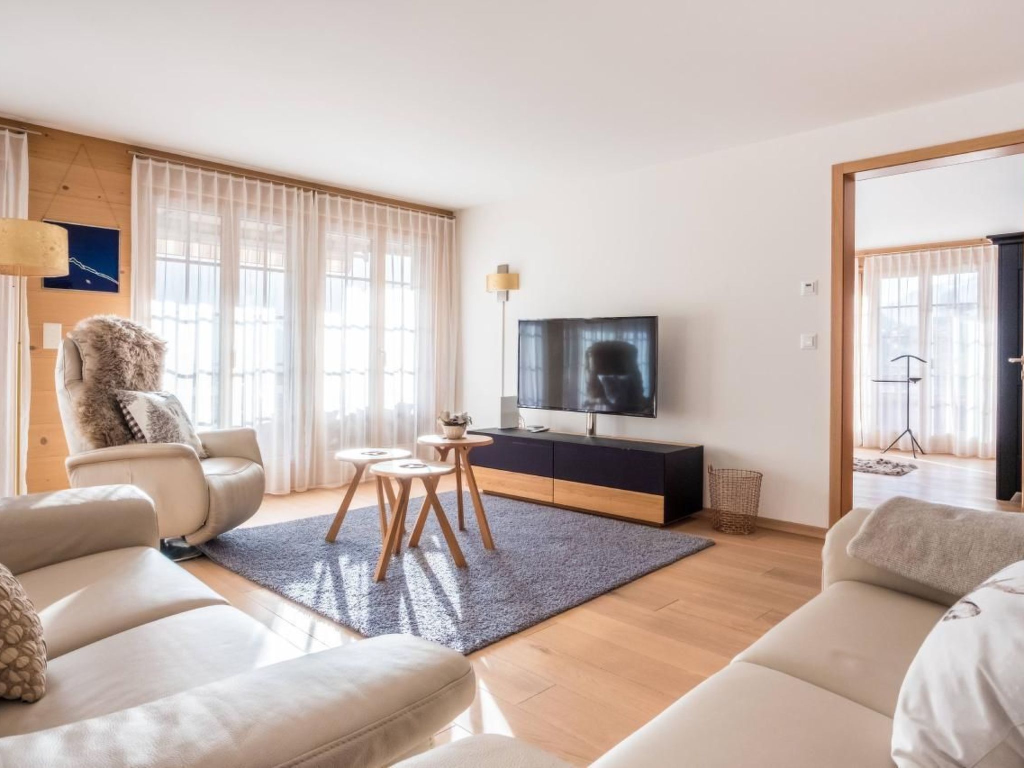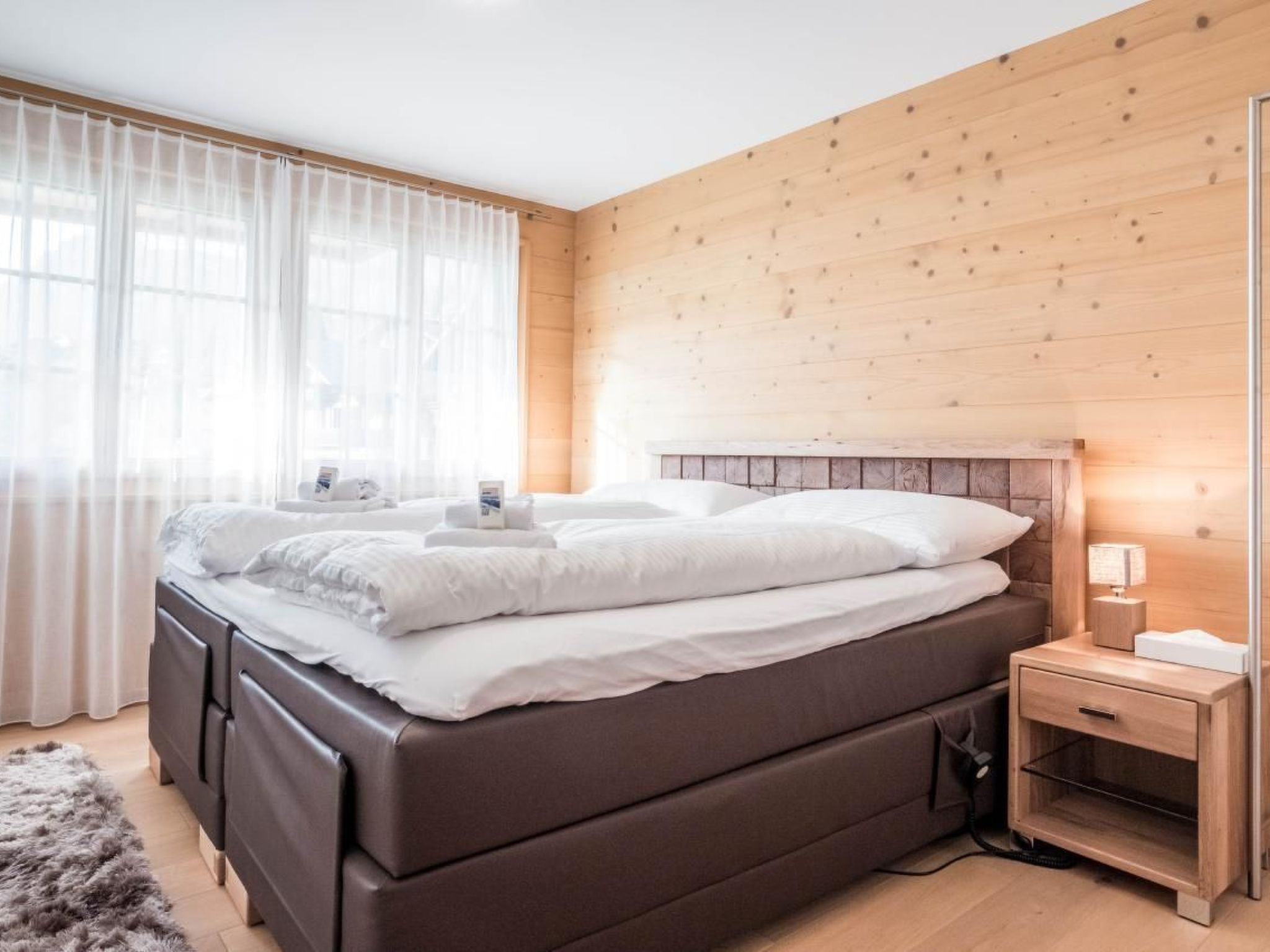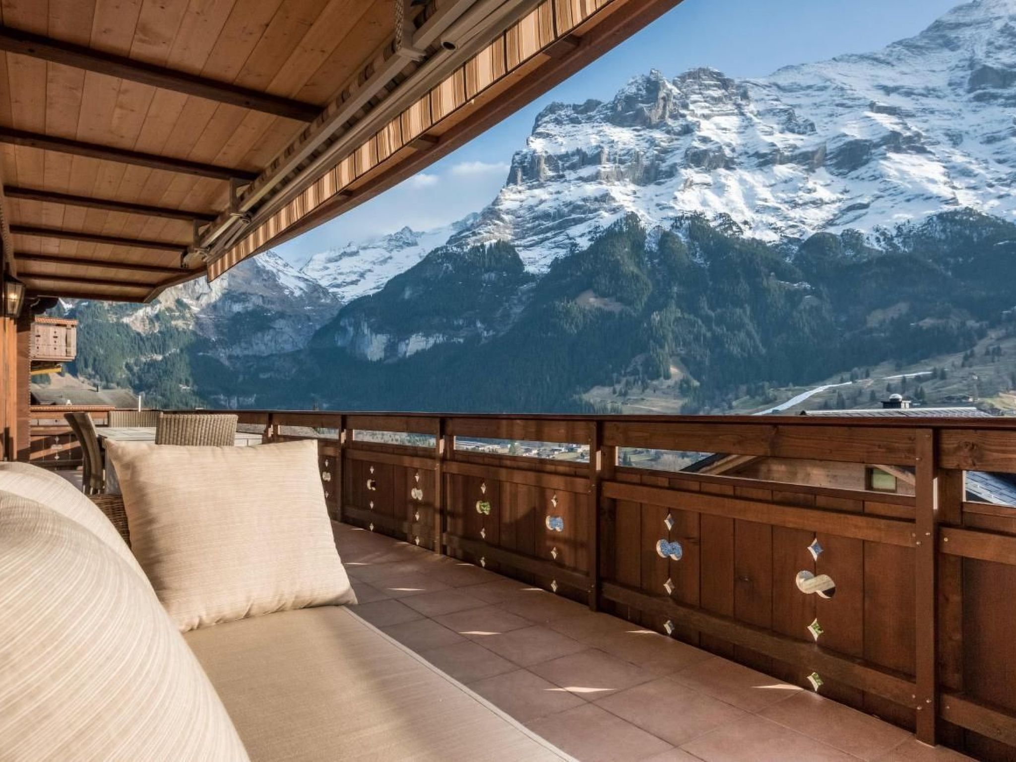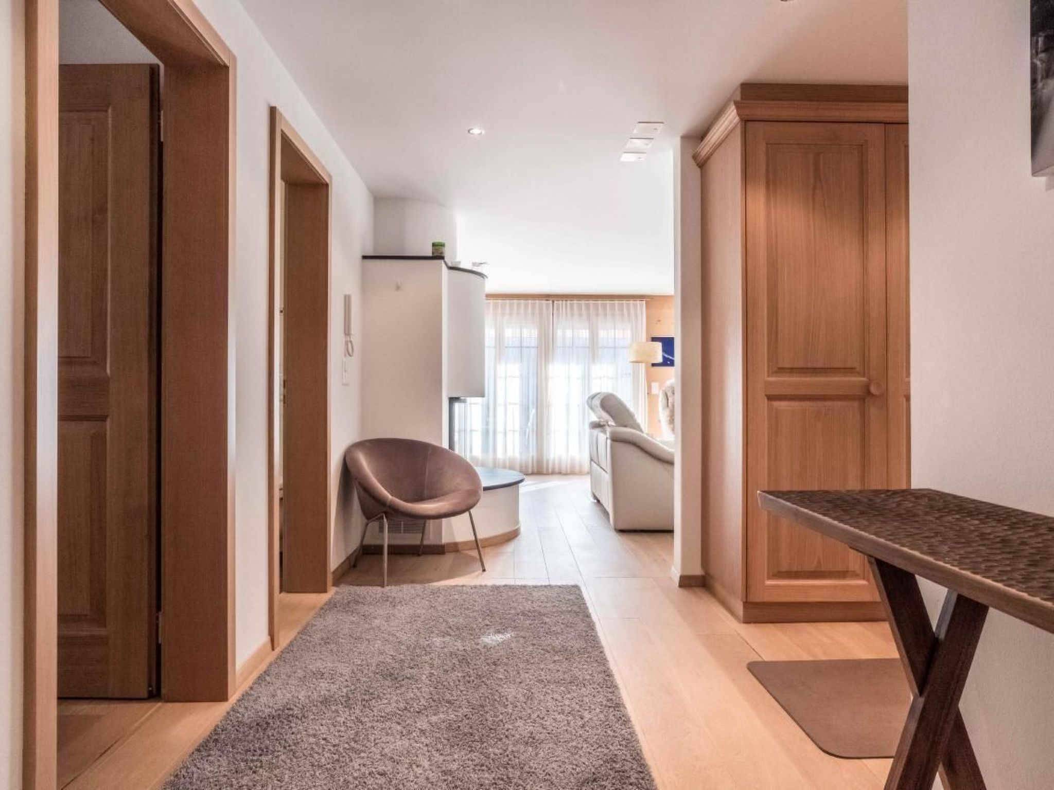 Die luxuriöse 4.5-Zimmerwohnung im Obergeschoss verfügt über 3 Schlafzimmer mit Doppelbett, 2 Badezimmer mit Bad/WC sowie 1 Badezimmer mit Dusche/WC. Die Wohnung hat eine moderne Küche und einen hellen Wohn- und Essbereich mit Cheminée. Der grosse Balkon bietet eine schöne Aussicht auf das Bergpanorama.