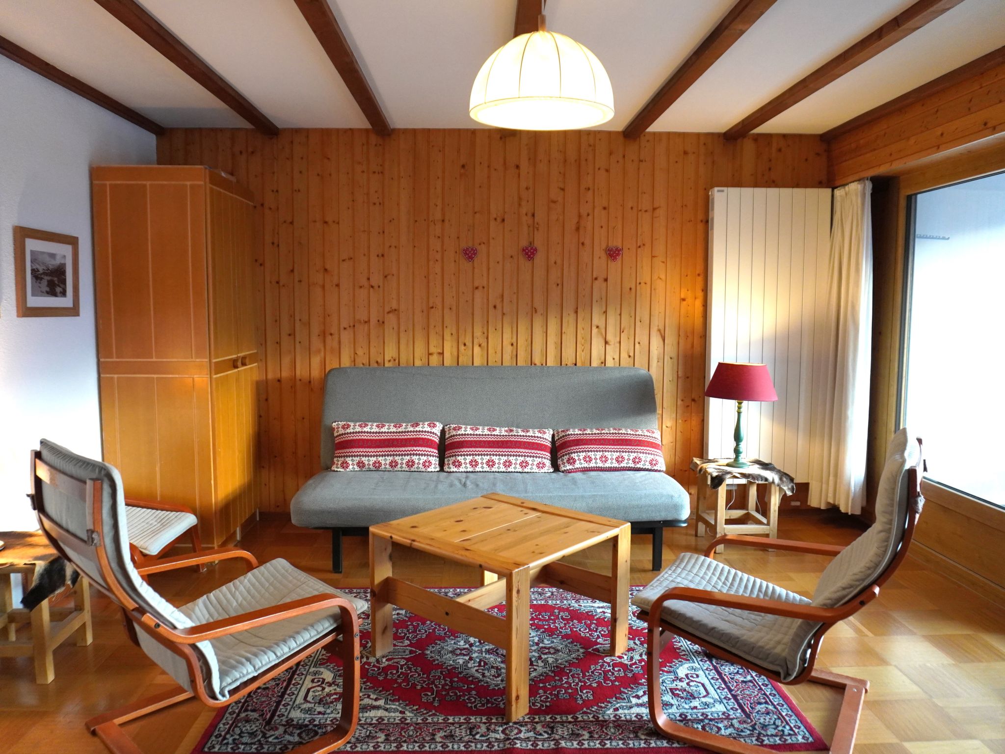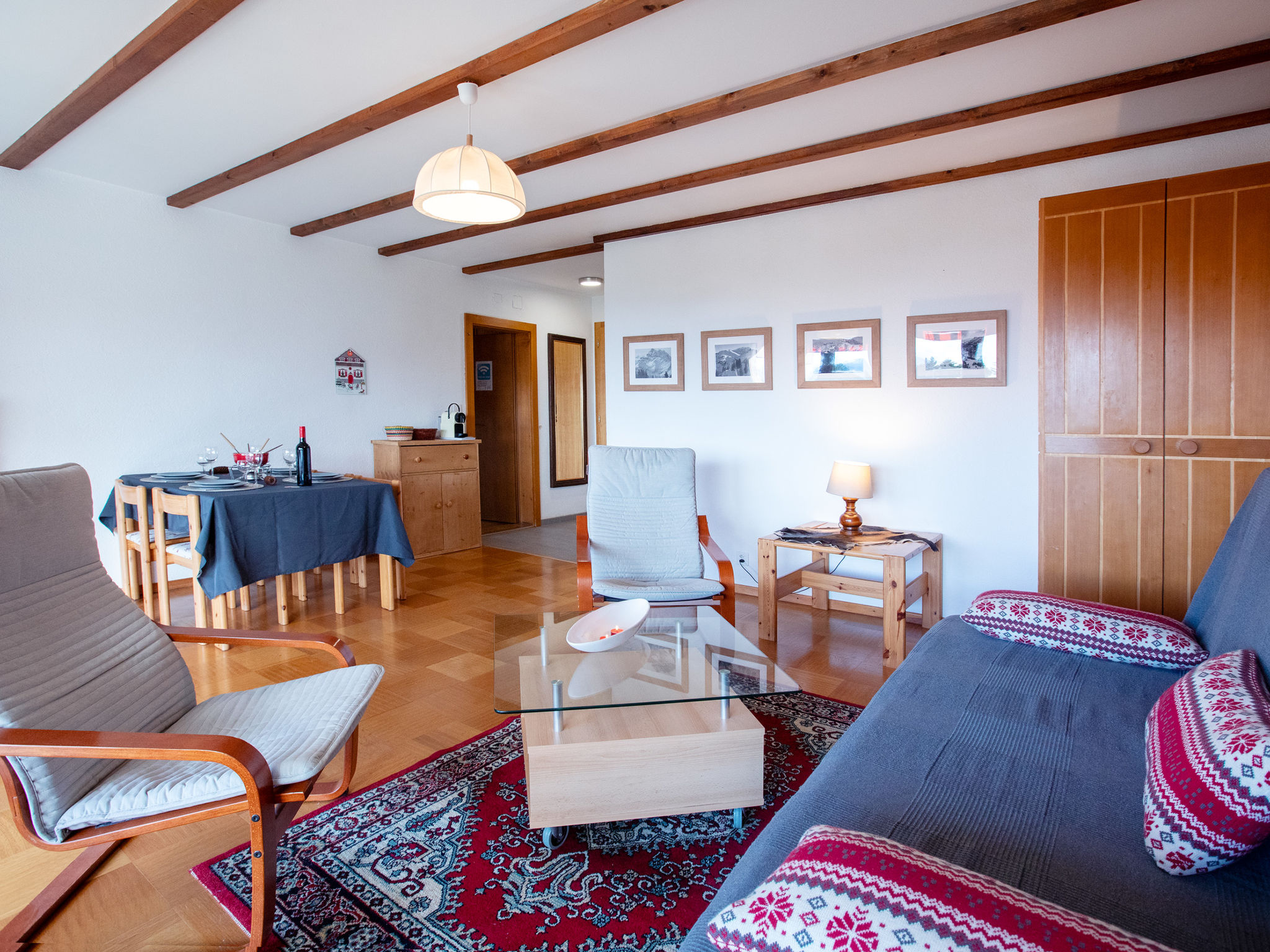 "Diamant 39", 2-Zimmer-Attikawohnung 60 m2, Südlage. Teilweise renoviert im Jahre 2018, einfach und zweckmässig eingerichtet: Wohn-/Esszimmer mit 1 Diwanbett (140 cm, Länge 200 cm), Esstisch, Küchenblock und Bad/WC. Ausgang zum Balkon, Richtung Süden. 1 abgeschrägtes grosses Zimmer mit 2 Betten (90 cm, Länge 200 cm), Bad/WC. Offene Küche (Backofen, Geschirrspüler, 4 Induktionskochplatten, Toaster, Wasserkocher, Tiefkühler, elektrische Kaffeemaschine, Kapseln für die Kaffeemaschine (Nespresso) extra, Racletteofen, Fondue Set (Käse)). Balkon 10 m2, Südlage. Balkonmöbel. Sehr schöne Panoramasicht auf die Berge. Zur Verfügung: Haartrockner. Internet (Wireless LAN, gratis). Parkplatz Nr. 39A. Bitte beachten: Nichtraucher-Unterkunft.