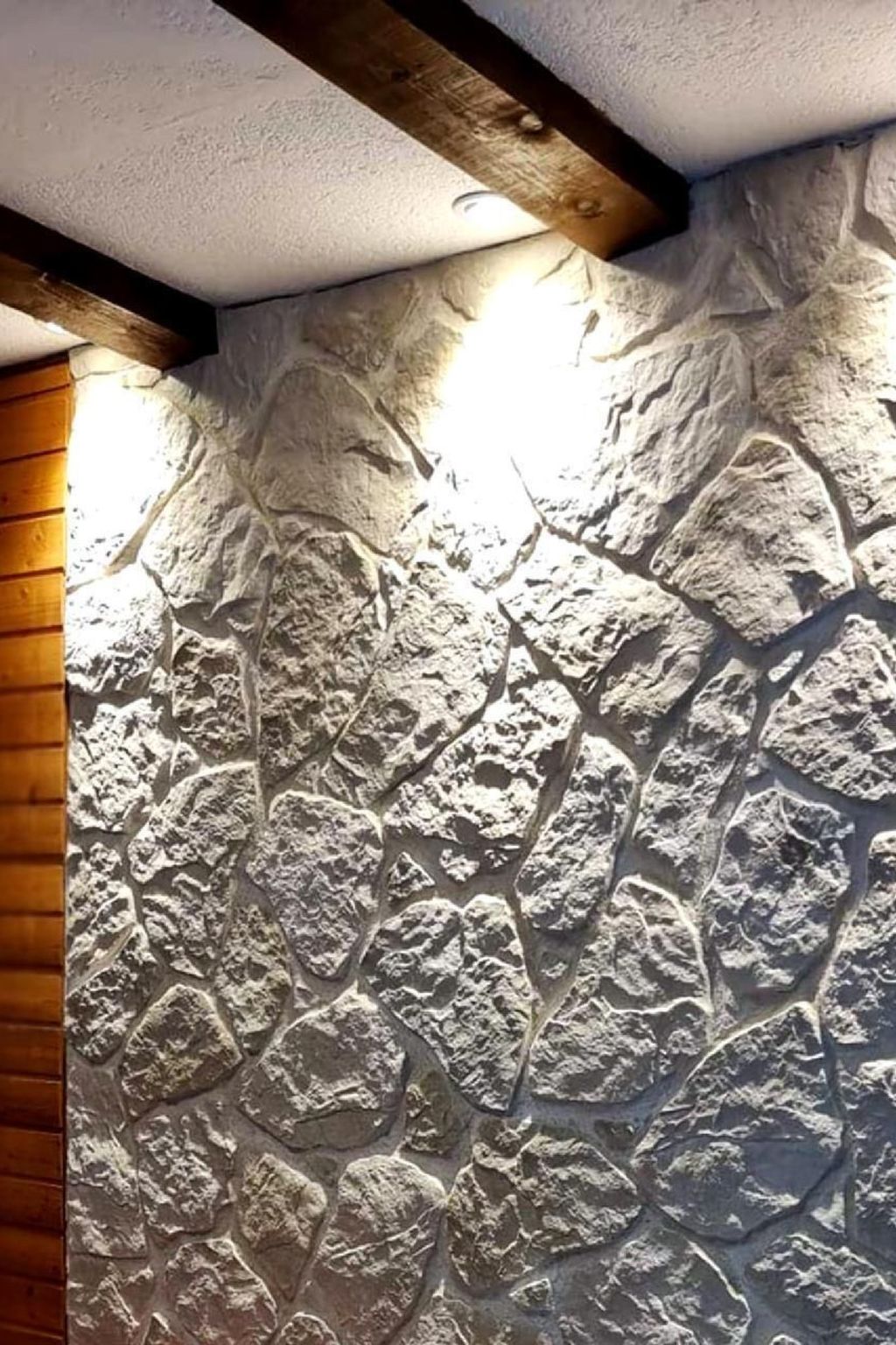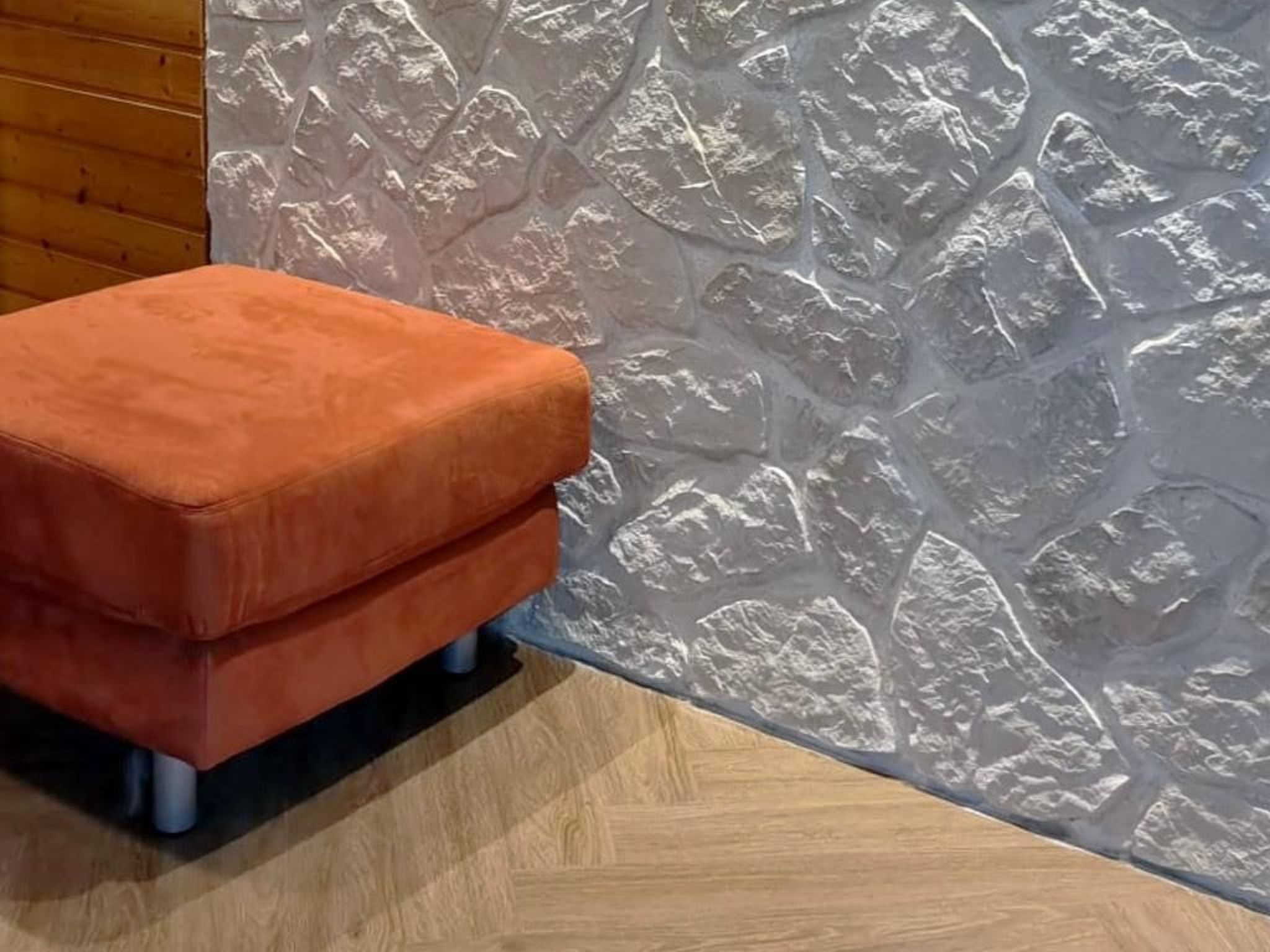 • Wände und Möbel aus exklusivem Massivholz, Bruchsteinwand aus inovativen Wärmedämmsteinen