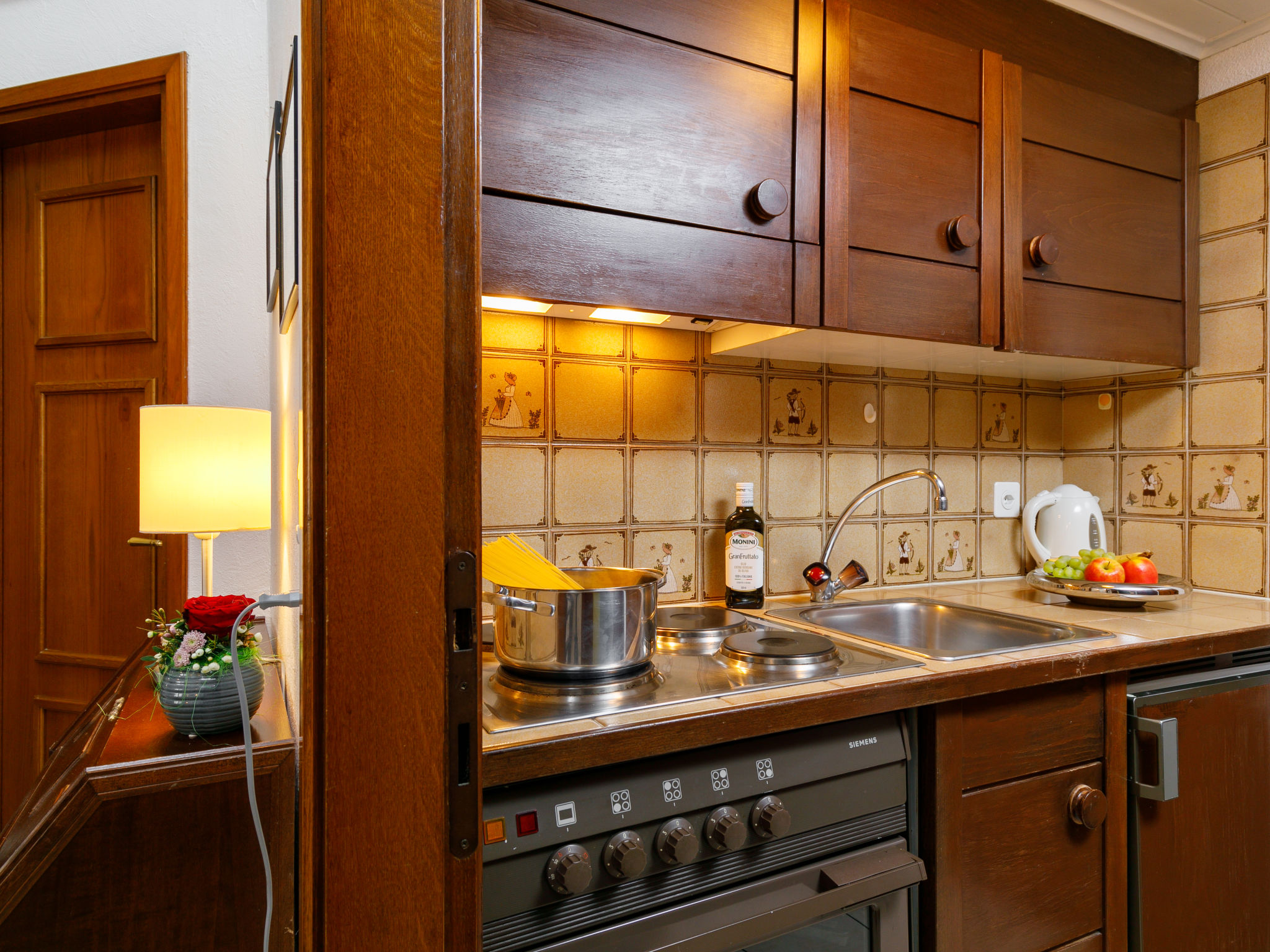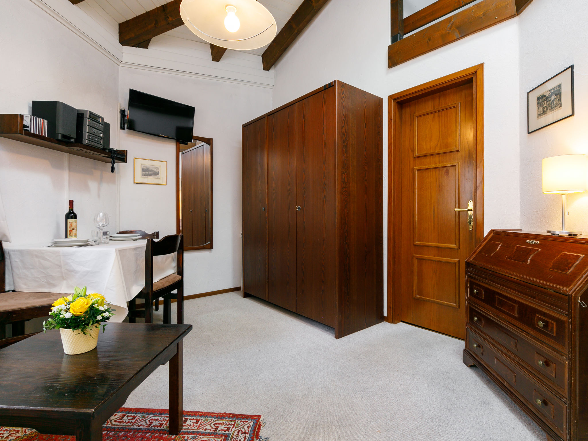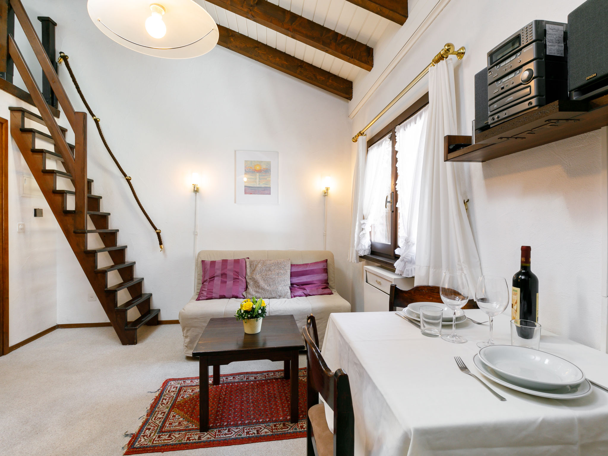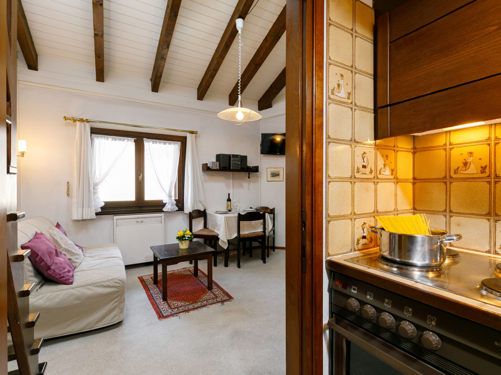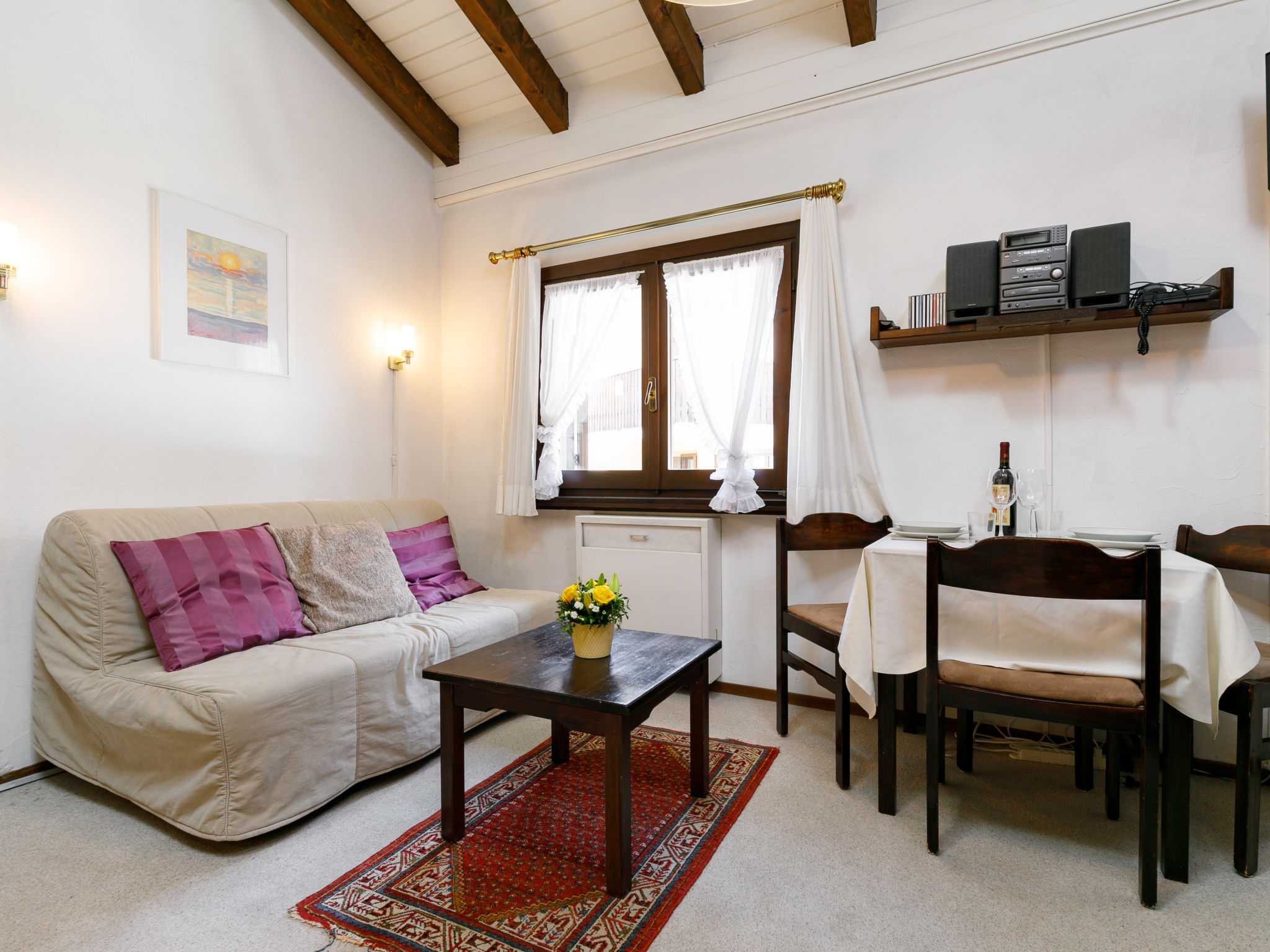"Residenza Chesa Margun 15-1", 1-Zimmer-Wohnung 33 m2 auf 2 Stockwerken, Nordlage. Zweckmässig eingerichtet: kleines Wohn-/Esszimmer mit 1 Diwanbett (160 cm, Länge 180 cm), Digital-TV und Radio. Kleine Küche im Eingang (Backofen). Dusche/WC, Bidet. E-Heizung. Obergeschoss: (steile Treppe) abgeschrägte, offene Galerie, Deckenhöhe 120 - 150 cm mit 2 Betten. Garage. Bitte beachten: für Kleinkinder nicht geeignet Wohnung auf Hofseite. Nichtraucher-Unterkunft. Anstelle eines abgeschlossenen Schlafzimmers befinden sich manche Schlafplätze in einem offenen Bereich (Galerie, Nische etc.).