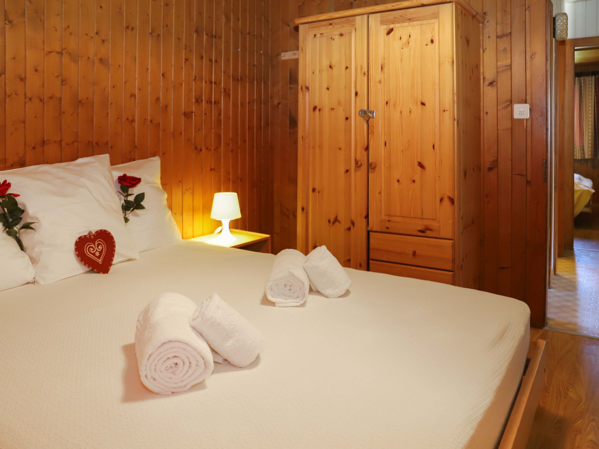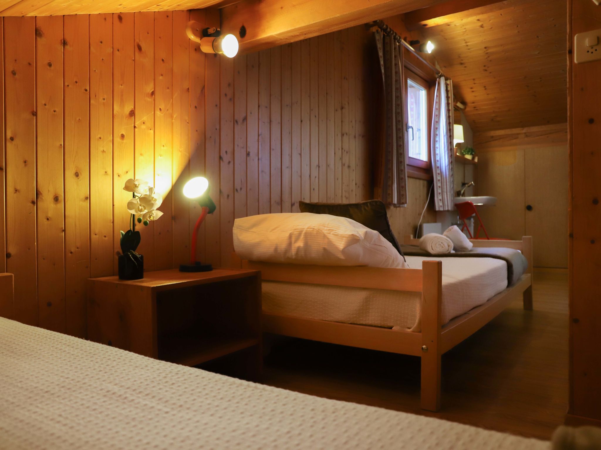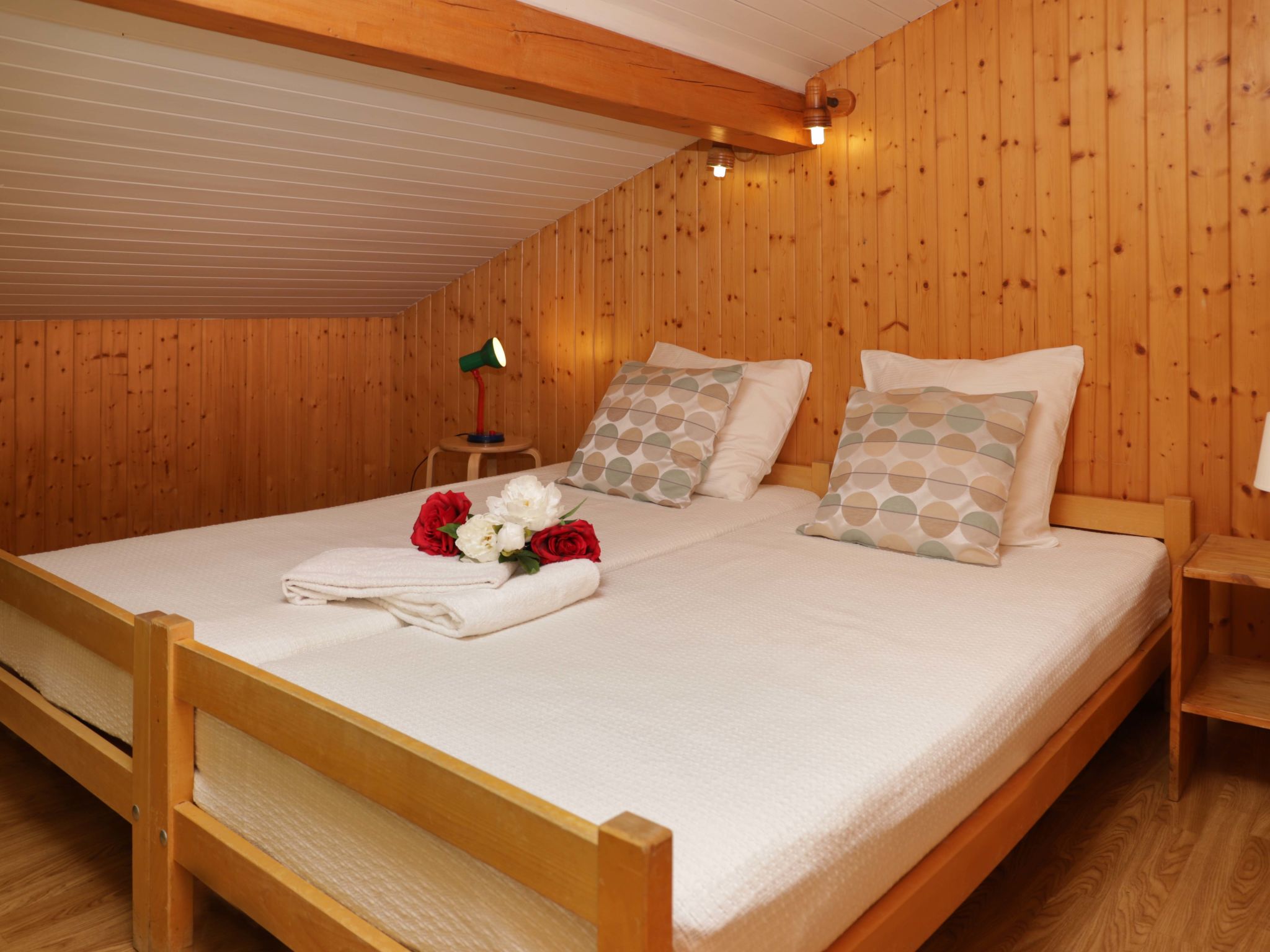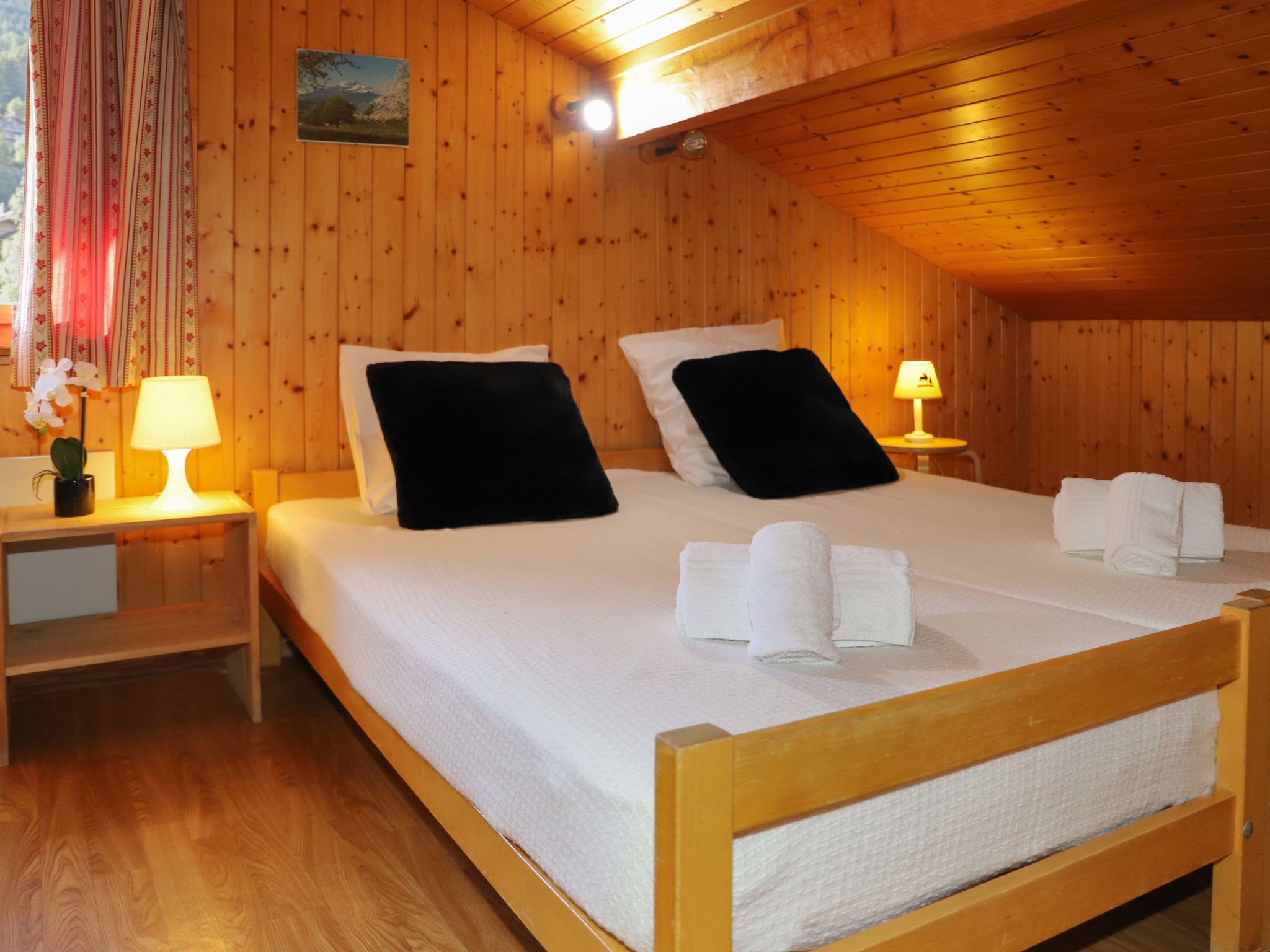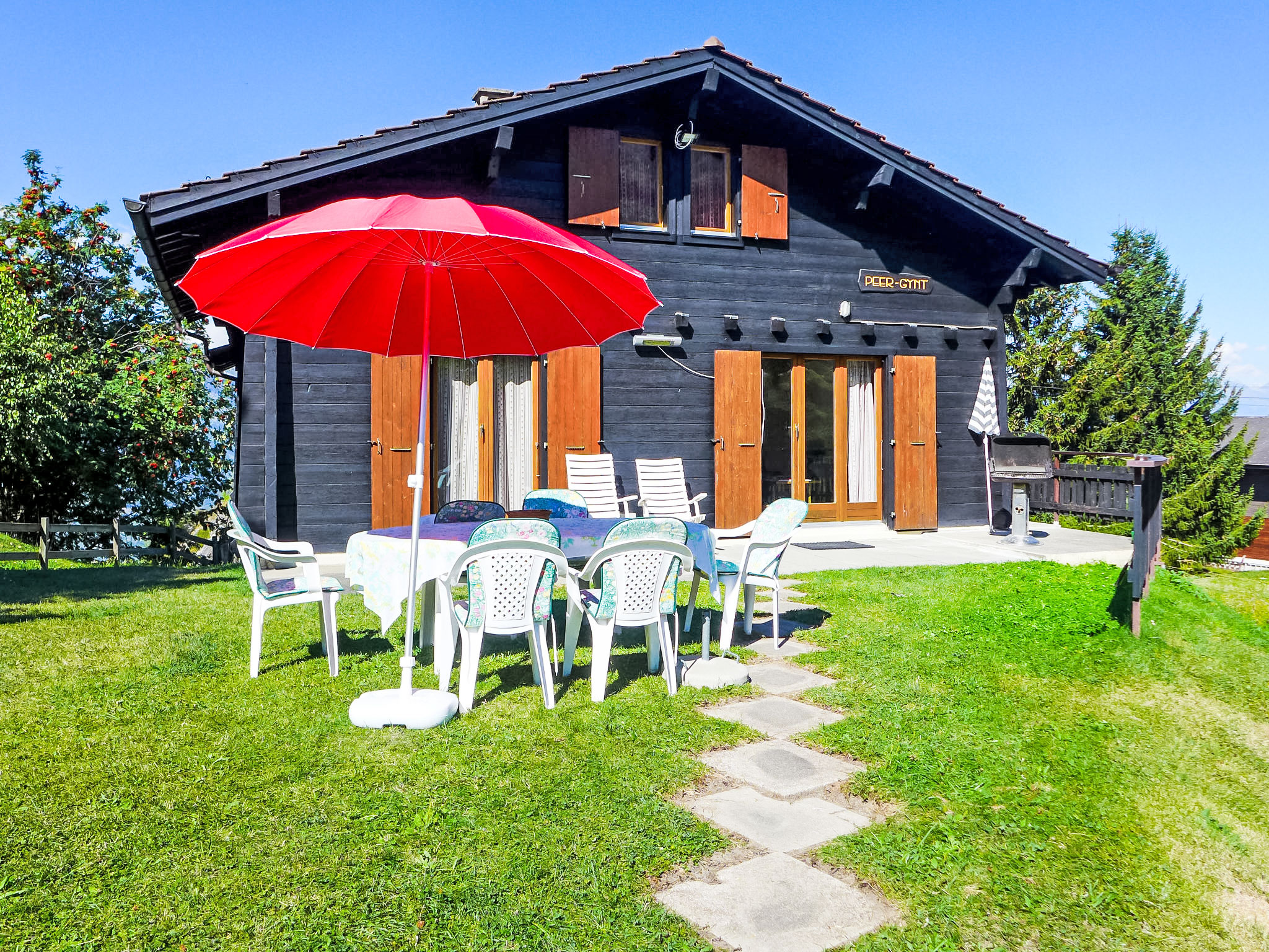 "Peer Gynt", 6-Zimmer-Chalet 145 m2 auf 2 Stockwerken. Zweckmässig eingerichtet: Wohn-/Esszimmer mit offenem Kamin und Kabel-TV. 2 Zimmer, jedes Zimmer mit 1 franz. Bett (160 cm, Länge 200 cm), Waschbecken. Offene Küche (Backofen, Geschirrspüler, Toaster, Wasserkocher, Mikrowelle, elektrische Kaffeemaschine, Racletteofen, Fondue Set (Chinoise, Käse)). Dusche, sep. WC. E-Heizung. Obergeschoss: 3 abgeschrägte Zimmer, jedes Zimmer mit 2 Betten (90 cm, Länge 190 cm), Waschbecken. Dusche/WC. Balkon, Terrasse 18 m2, Südlage. Terrassenmöbel, Gartengrill, Abstellkammer. Sehr schöne Sicht auf die Berge und das Tal. Zur Verfügung: Internet (Wireless LAN, gratis). Parkplatz (3 Autos), Garage. Bitte beachten: Nichtraucher-Haus.