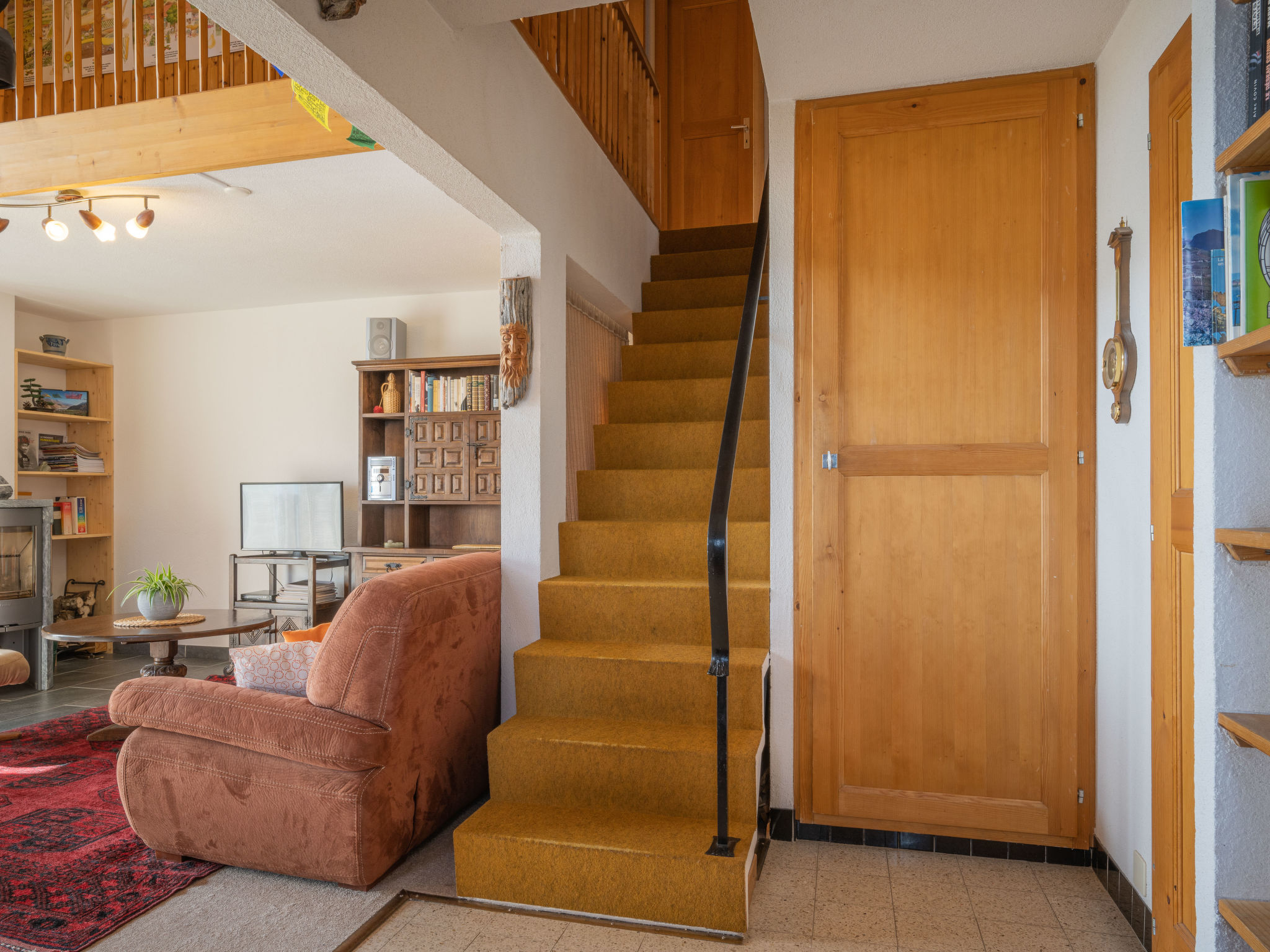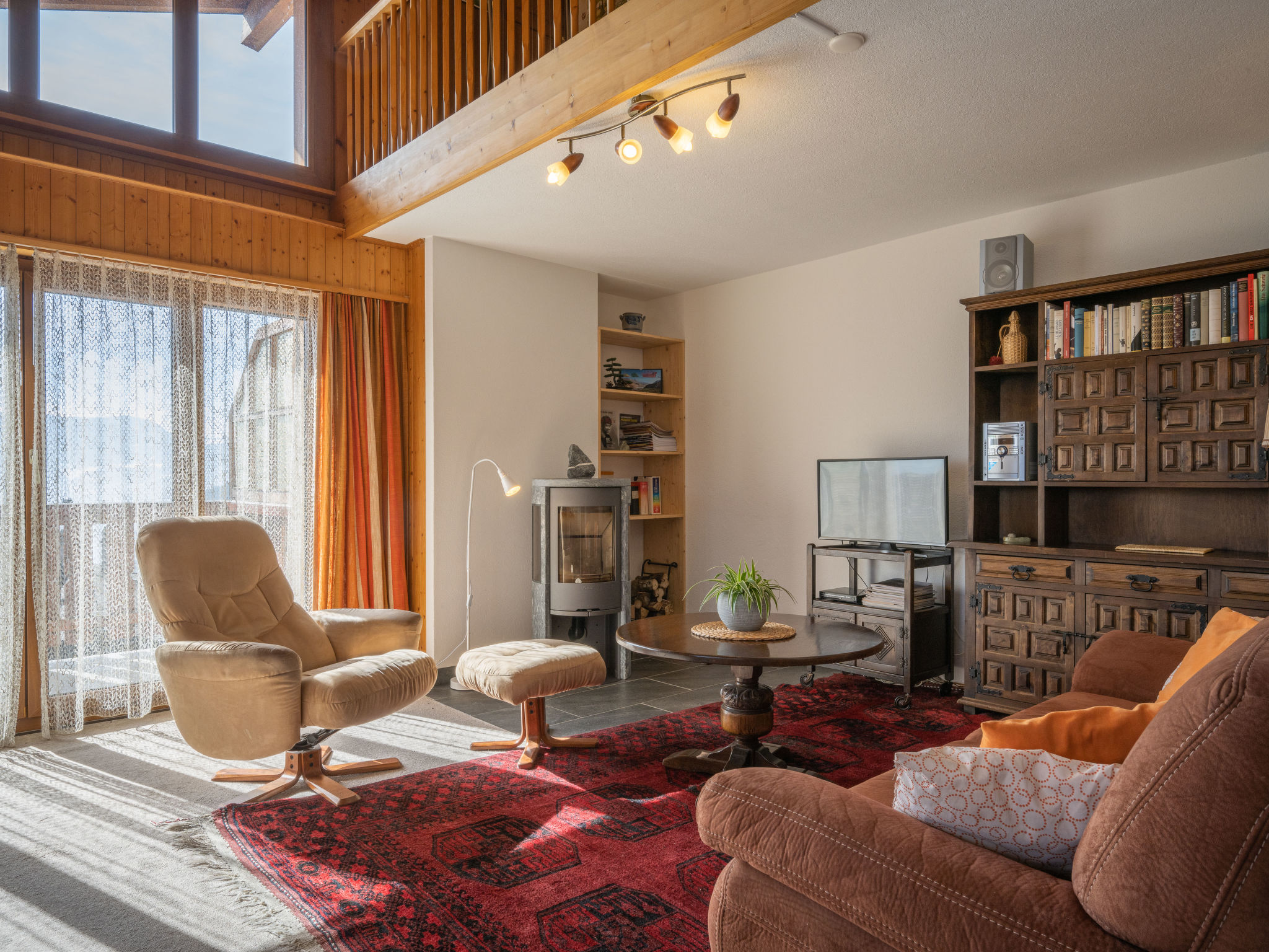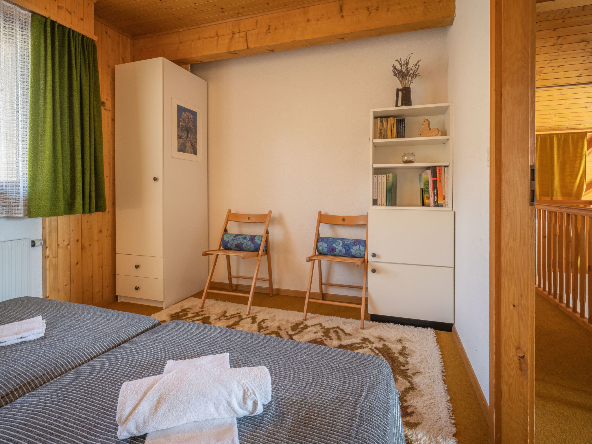 "Plein Soleil A 10", 4-Zimmer-Wohnung 90 m2 auf 2 Stockwerken, Südostlage. Komfortabel und schön eingerichtet: Wohn-/Esszimmer mit Essecke, Kabel-TV, Stereoanlage, DVD und Holzofen. Ausgang zum Balkon. Küche (Backofen, Geschirrspüler, 4 Induktionskochplatten, Mikrowelle, elektrische Kaffeemaschine, Kapseln für die Kaffeemaschine (Delizio) extra, Racletteofen, Fondue Set (Chinoise, Käse)). Bad/WC. Obergeschoss: 1 Zimmer mit 1 franz. Bett (160 cm, Länge 200 cm). Ausgang zum Balkon. 1 Zimmer mit 2 Betten (90 cm, Länge 200 cm). 1 abgeschrägtes Zimmer mit 2 Ausziehbetten (2 Pers. 2 x 90 cm, Länge 200 cm). Galerie. Dusche/WC. Balkon 15 m2, Südostlage, 2 kleine Balkone, Südlage und Nordlage. Terrassenmöbel, Liegestühle (5). Sehr schöne Sicht auf die Berge und das Tal. Zur Verfügung: Bügeleisen, Haartrockner. Internet (WLAN, gratis). Parkplatz Nr. 10 (1 Auto) in 30 m. Bitte beachten: Nichtraucher-Unterkunft. Maximal 1 Haustier/Hund erlaubt.