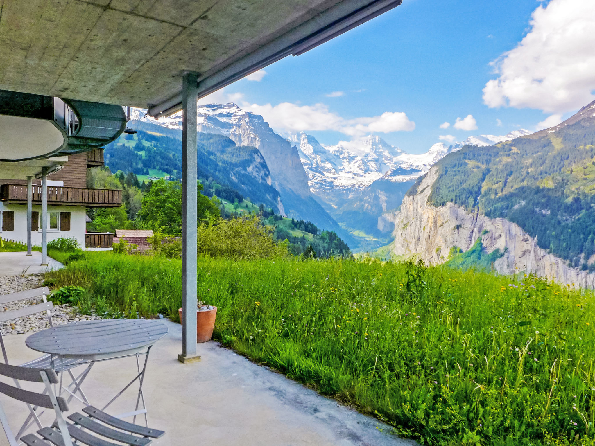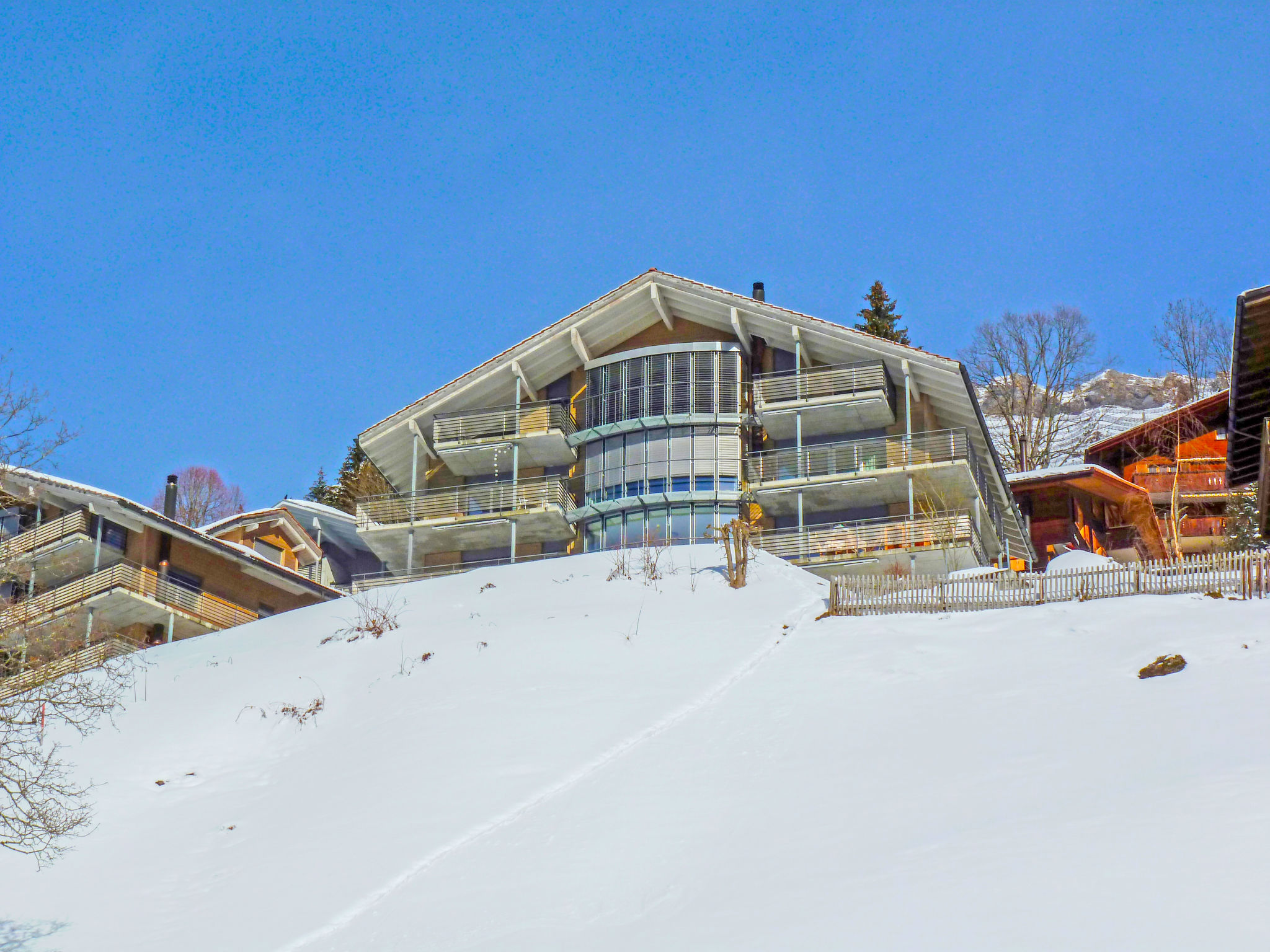 Chalet "Silence". Unterhalb von Zentrum Wengen, 800 m vom Zentrum, ruhige, sonnige Lage am Hang. Im Hause: Zentralheizung. Einkaufsservice vor Anreise möglich. 100 m lange steile Zufahrt bis zum Haus. Lebensmittelgeschäft 800 m, Restaurant 500 m, Bäckerei 800 m, Zentrum zu Fuss in 10 Minuten erreichbar, Bushaltestelle "Lauterbrunnen (by train)" 3.8 km, Bahnstation "Wengen" 800 m. Luftseilbahn, Skisportanlagen 800 m, Kinderspielplatz 500 m. Bekannte Seen in der Umgebung sind gut erreichbar: Thunersee 13 km, Brienzersee 13 km. Bitte beachten: autofreie Ferienanlage. Die Anreise erfolgt mit der Bergbahn. Die Anreise ist nur mit dem Zug ab Lauterbrunnen möglich – 14 Min. Fahrzeit.