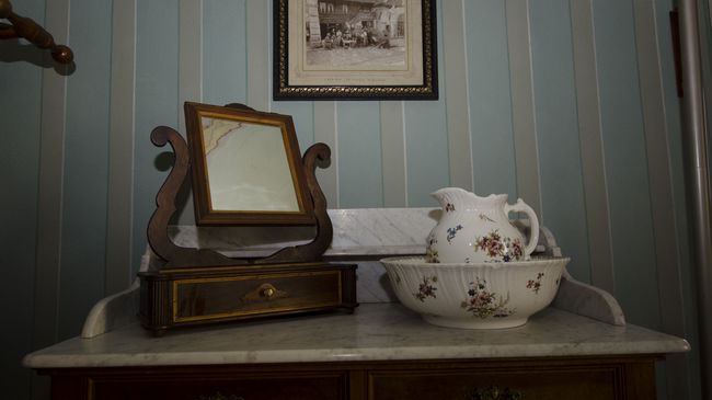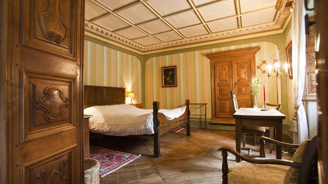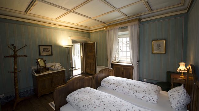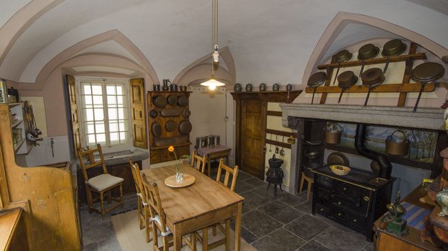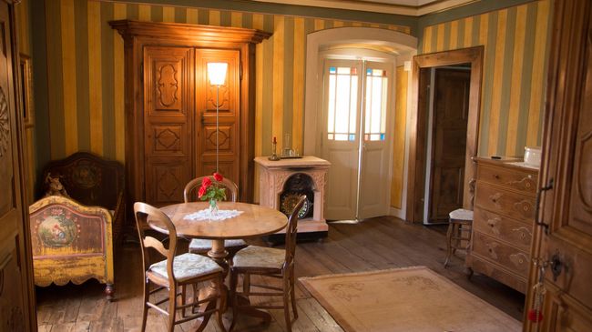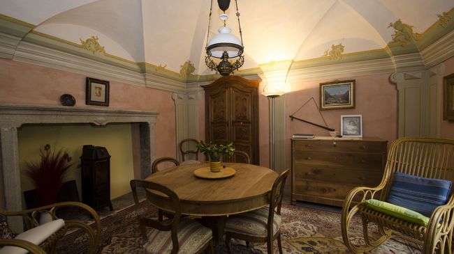 Im historischen Teil verströmen die zwei Zimmer , die Küche und die Wohnzimmer mit ihren Nussbaum-Schränken, die Fresken, sowie die Einrichtung , den Geist von damals.