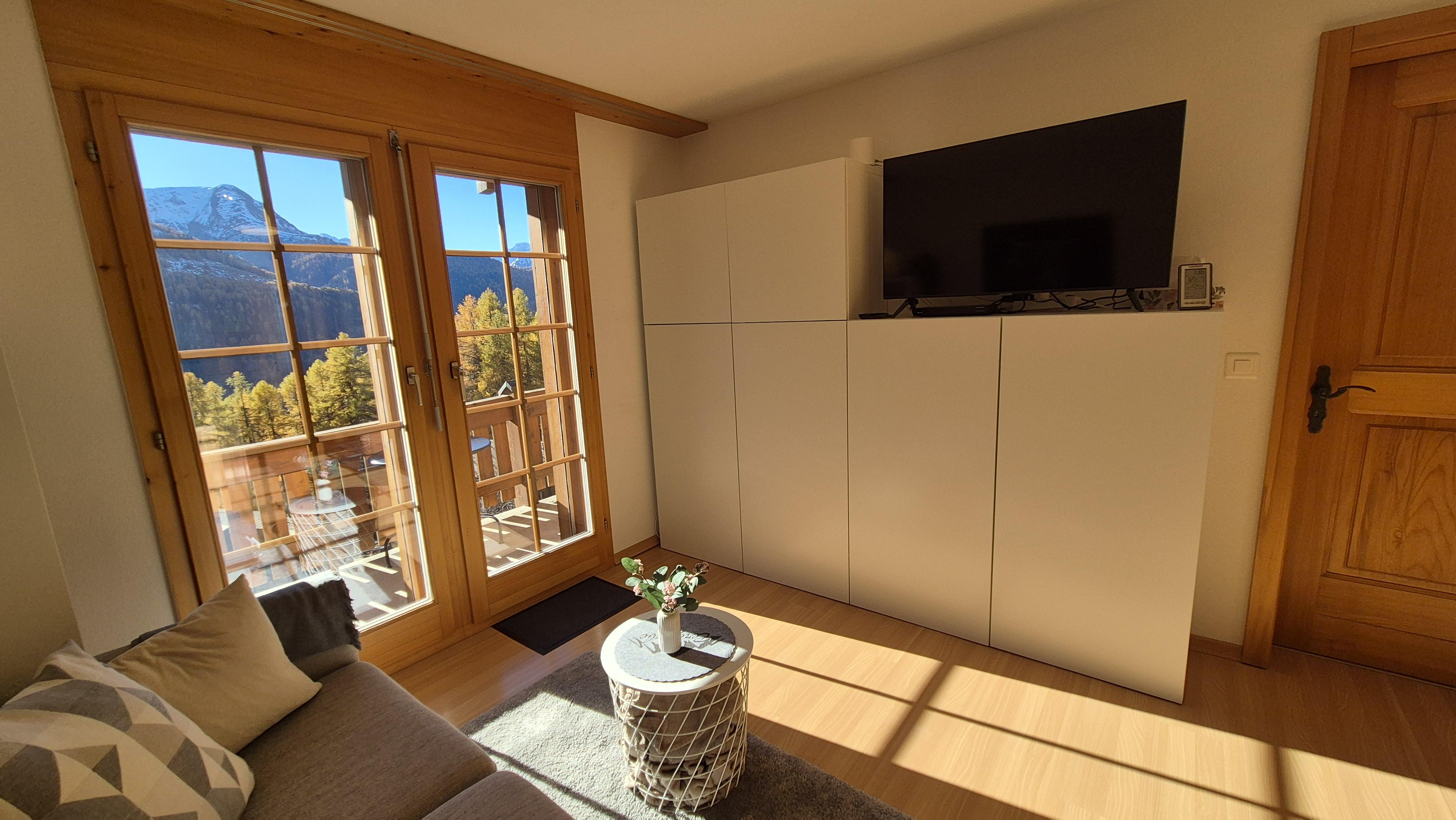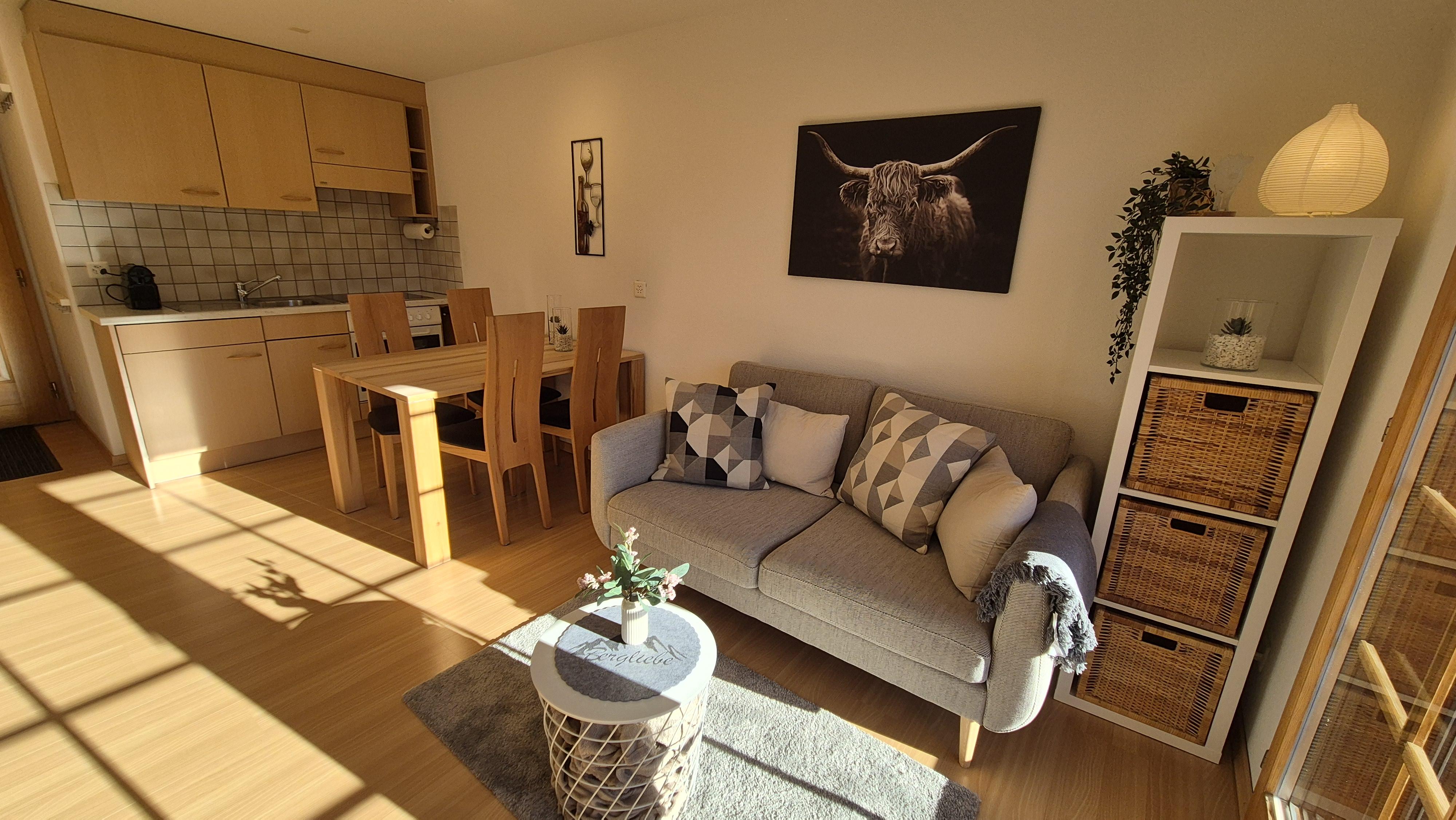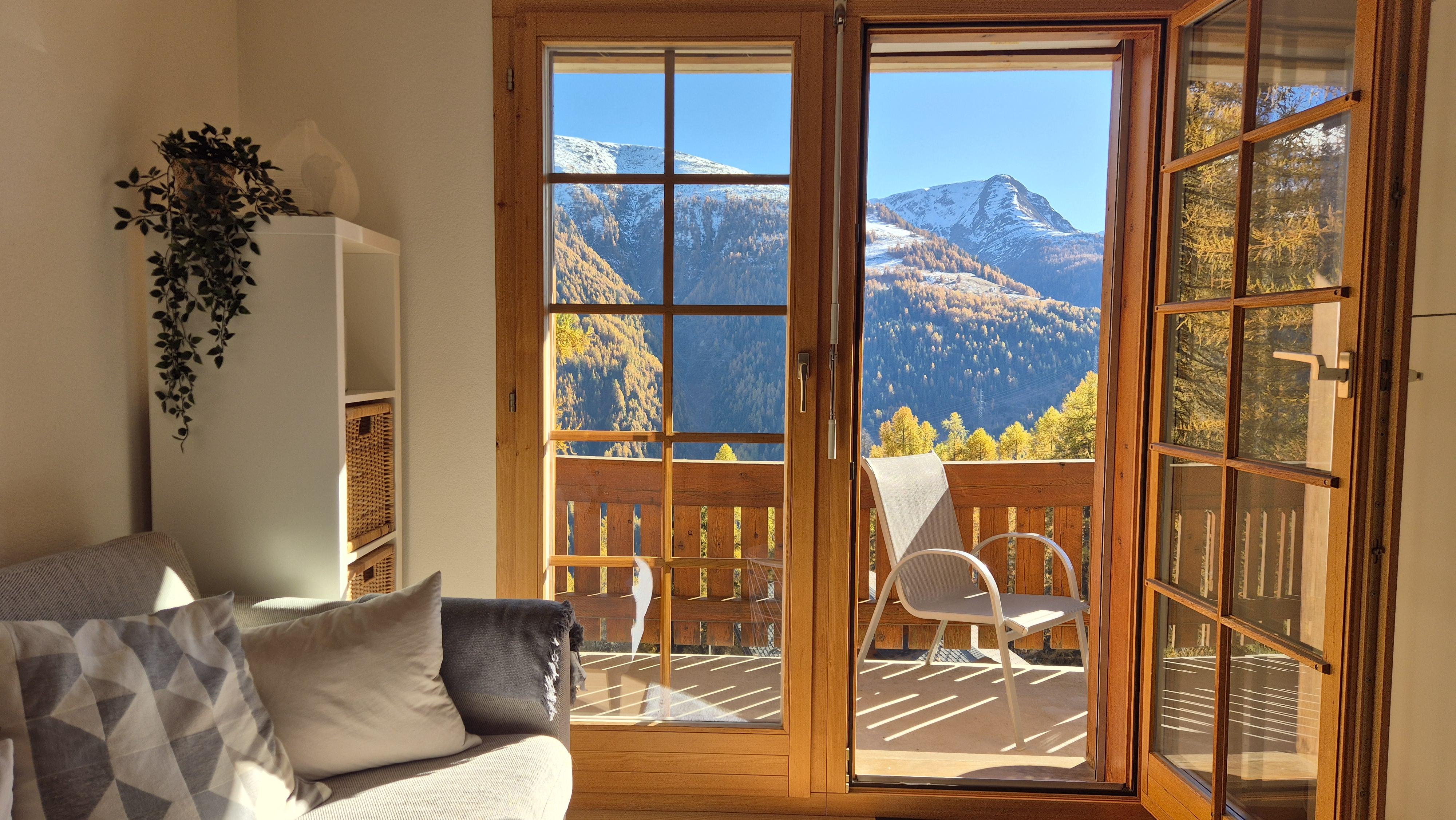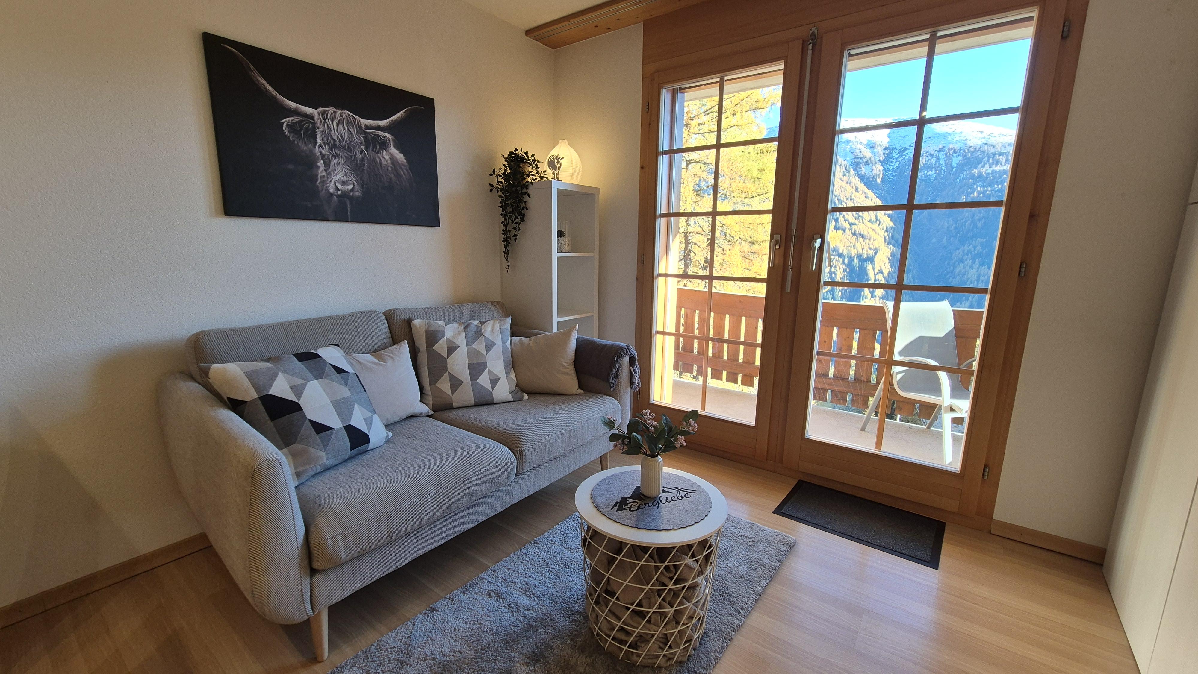 Der Wohnbereich ist freundlich und zugleich gemütlich. Der schöne Balkon bietet eine herrliche Bergsicht.