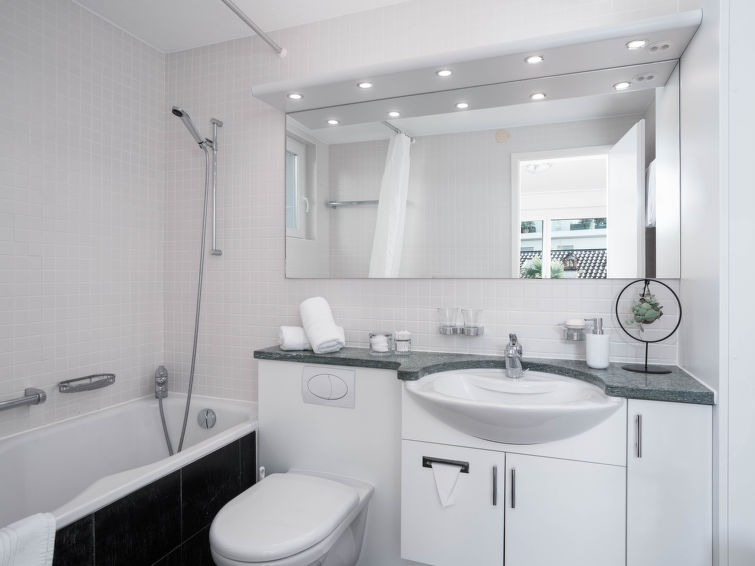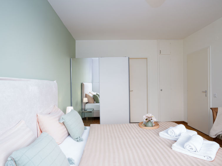 "Junior Suite Classic", 2-Zimmer-Wohnung 60 m2 im 3. Stock, Westlage. Wohn-/Schlafzimmer mit 1 Doppeldiwanbett (1 x 160 cm, Länge 200 cm), Sat-TV und Radio. 1 Zimmer mit 1 Doppelbett (1 x 200 cm, Länge 200 cm). Offene Küche (Backofen, elektrische Kaffeemaschine, Kapseln für die Kaffeemaschine (Nespresso) extra). Bad/WC. Ölheizung. Balkon. Eingeschränkte Sicht auf den See. Zur Verfügung: Internet (Wireless LAN, gratis). Bitte beachten: Nichtraucher-Unterkunft, Nichtraucher-Haus. Maximal 1 Haustier/Hund erlaubt. NL-00004957