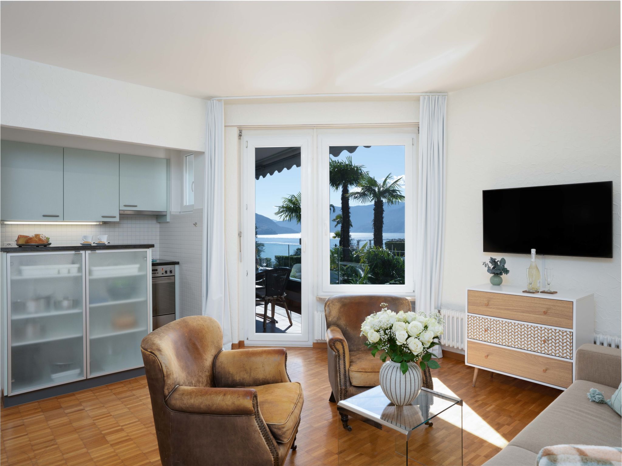 "Junior Suite Classic - Isole di Brissago", 2-Zimmer-Wohnung 60 m2 im 3. Stock, Westlage. Wohn-/Schlafzimmer mit 1 Doppeldiwanbett (1 x 160 cm, Länge 200 cm), Sat-TV und Radio. 1 Zimmer mit 1 Doppelbett (1 x 200 cm, Länge 200 cm). Offene Küche (Backofen, elektrische Kaffeemaschine, Kapseln für die Kaffeemaschine (Nespresso) extra). Bad/WC. Ölheizung. Balkon. Eingeschränkte Sicht auf den See. Zur Verfügung: Internet (WLAN, gratis). Bitte beachten: Nichtraucher-Unterkunft, Nichtraucher-Haus. Maximal 1 Haustier/Hund erlaubt. NL-00004957