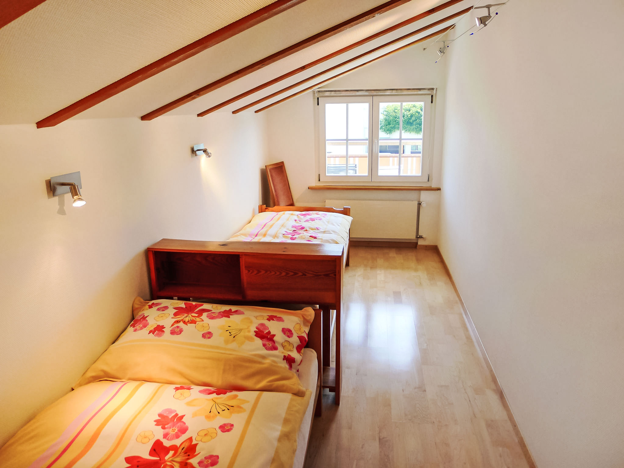 4-Zimmer-Wohnung 65 m2 im 2. Stock. Zweckmässig und gemütlich eingerichtet: Wohn-/Esszimmer 15 m2 mit Sat-TV (Flachbildschirm), Radio und CD. Ausgang zum Balkon. 1 Doppelzimmer 15 m2. 1 abgeschrägtes Zimmer 7 m2 mit 2 Betten. 1 Zimmer 12 m2 mit 1 Bett. Küche (Backofen, Geschirrspüler, 4 Glaskeramikplatten, Mikrowelle, Tiefkühler) mit Esstisch. Bad/WC. 2 Balkone. Schöne Sicht auf den See, die Berge und die Ortschaft. Zur Verfügung: Internet (Wireless LAN, gratis). Parkplatz beim Haus. Bitte beachten: Nichtraucher-Unterkunft.