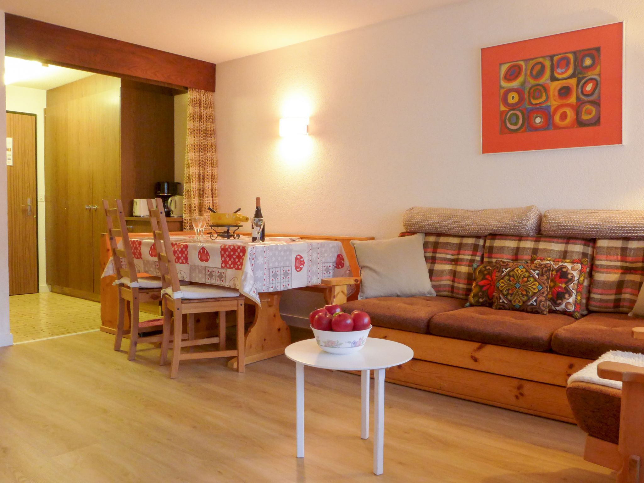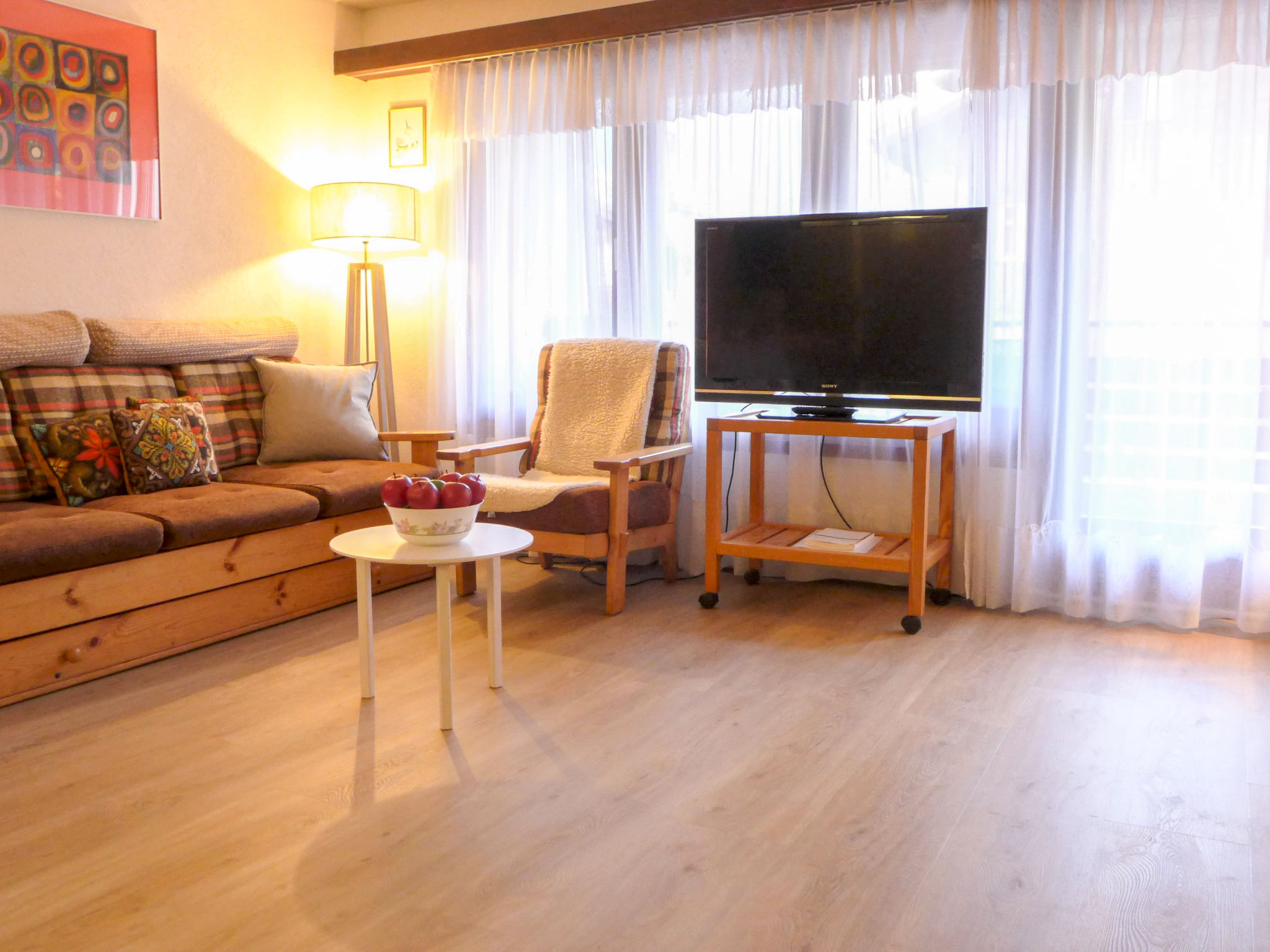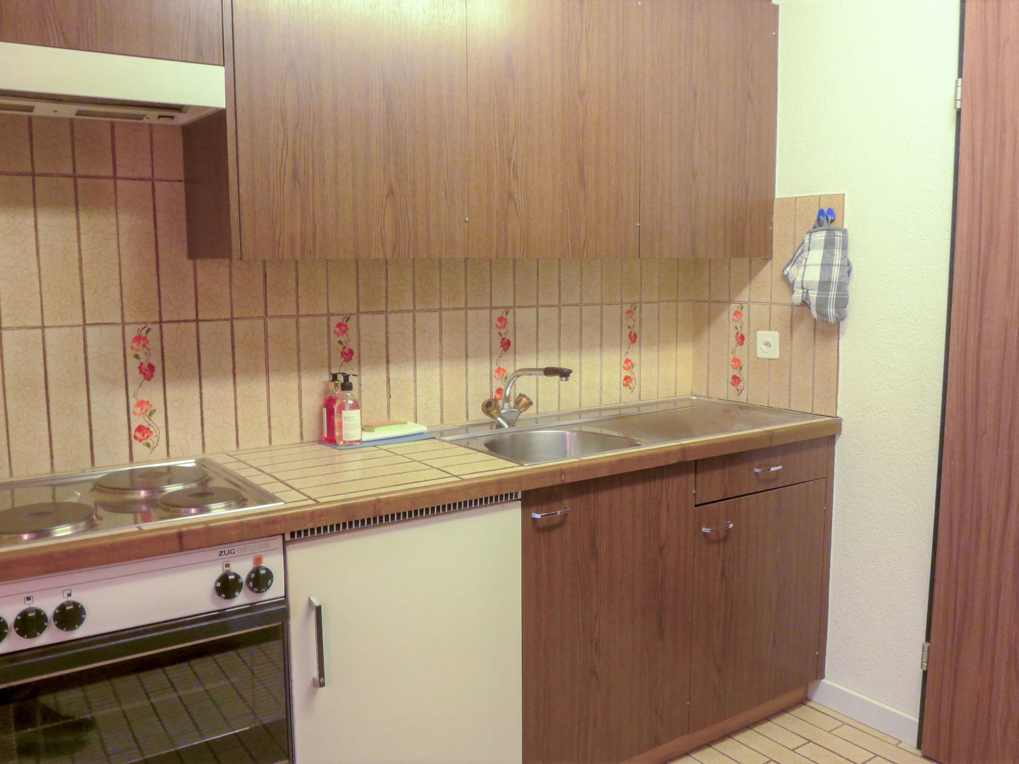 1-Zimmer-Wohnung 25 m2 im 3. Stock. Einfach und zweckmässig eingerichtet: Wohn-/Schlafzimmer mit 3 Wandschrankbetten (90 cm, Länge 200 cm), Esstisch und TV. Ausgang zum Balkon. Kleine Küche im Eingang (3 Kochplatten, Backofen, Toaster, Wasserkocher, Tiefkühler, elektrische Kaffeemaschine). Bad/WC. Balkon 8 m2. Balkonmöbel. Sehr schöne Sicht auf Matterhorn. Zur Verfügung: Haartrockner. Internet (Wireless LAN, gratis). Bitte beachten: Nichtraucher-Unterkunft. Maximal 1 Haustier/Hund erlaubt.