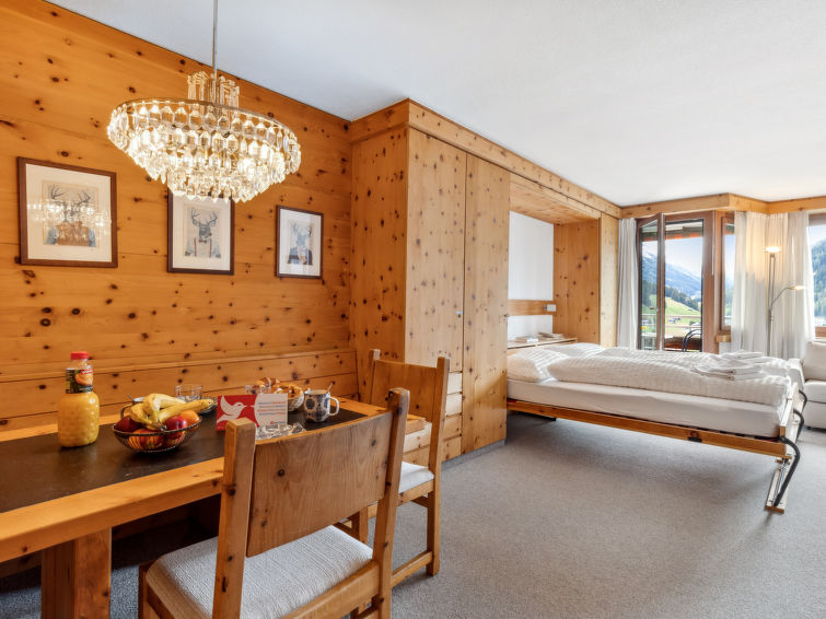 1-Zimmer-Wohnung 50 m2 im 1. Stock. Komfortabel und rustikal eingerichtet: Wohn-/Esszimmer mit 2 Wandschrankbetten und Kabel-TV (Flachbildschirm), Radio. Ausgang zum Balkon. Schlafnische mit Vorhang mit 2 Betten. Küche (4 Kochplatten, Backofen). Bad/WC. Balkon 7 m2, Südlage. Schöne Sicht auf die Berge, die Landschaft und die Ortschaft. Zur Verfügung: Internet (WLAN, gratis). Parkplatz. Bitte beachten: Nichtraucher-Unterkunft. Anstelle eines abgeschlossenen Schlafzimmers befinden sich manche Schlafplätze in einem offenen Bereich (Galerie, Nische etc.). 12610