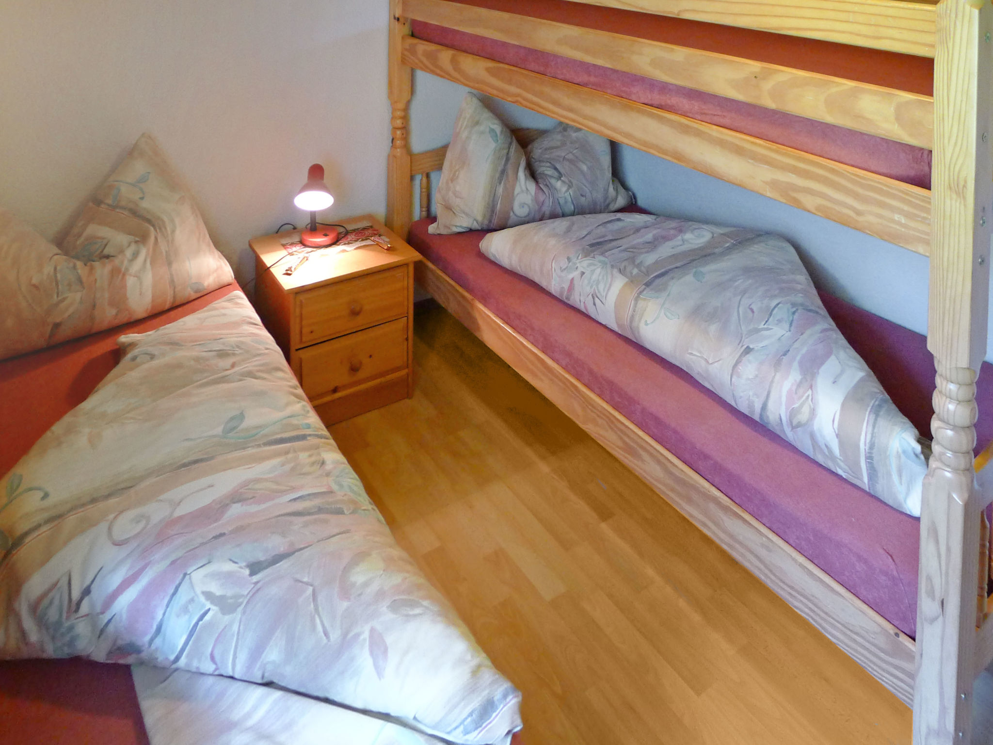 4-Zimmer-Wohnung 90 m2, im Erdgeschoss. Geschmackvoll und gemütlich eingerichtet: Wohn-/Esszimmer mit Esstisch und Sat-TV (Flachbildschirm), Radio und CD. 1 Zimmer 12 m2 mit 1 Bett und 1 x 2 Etagenbetten. 2 Zimmer, jedes Zimmer mit 2 Betten. Offene Küche (3 Kochplatten, Backofen, Geschirrspüler). Dusche/WC. Schöne Sicht auf die Berge und die Landschaft. Zur Verfügung: Internet (Wireless LAN, gratis). Parkplatz. Bitte beachten: Nichtraucher-Unterkunft.