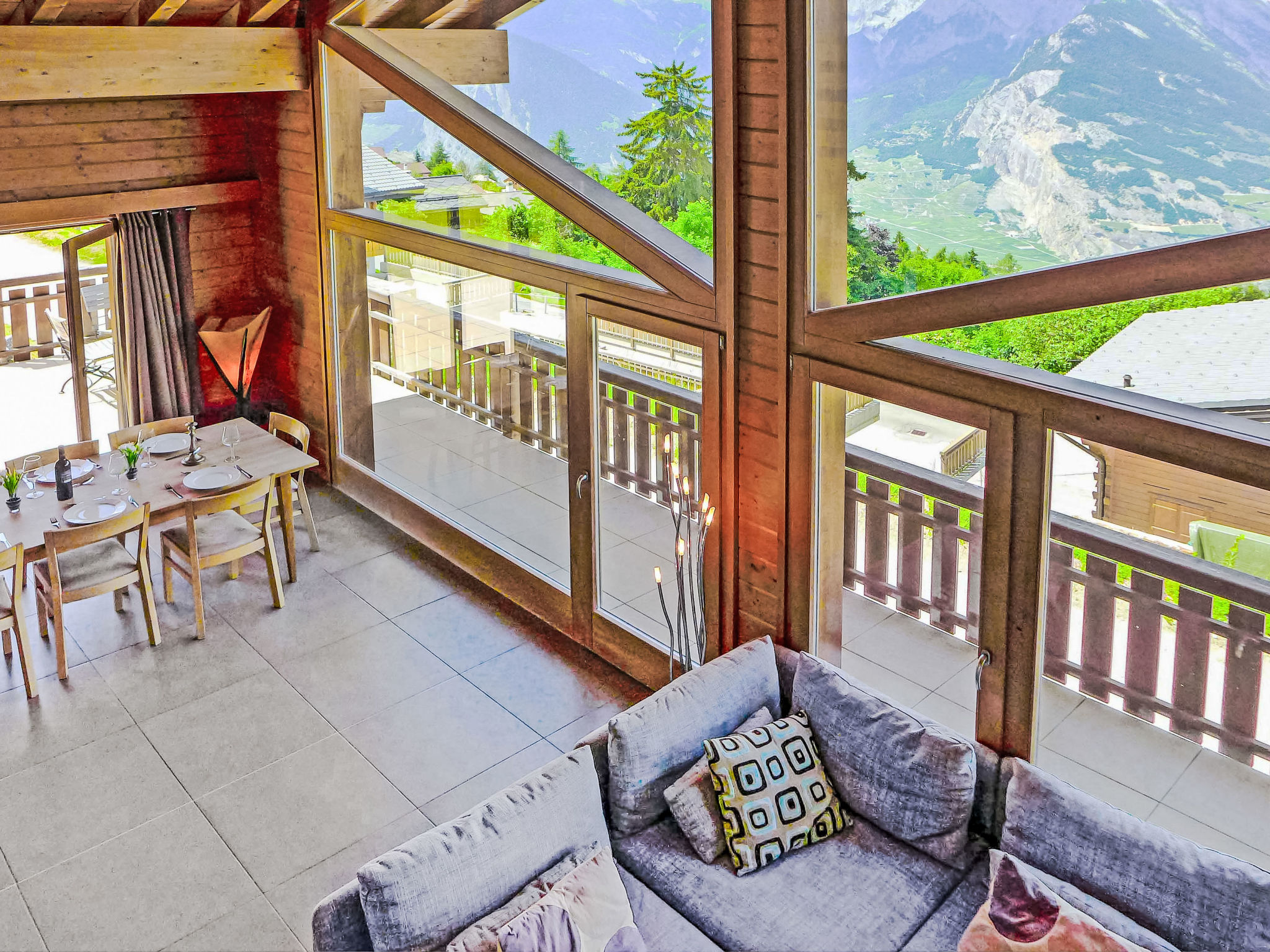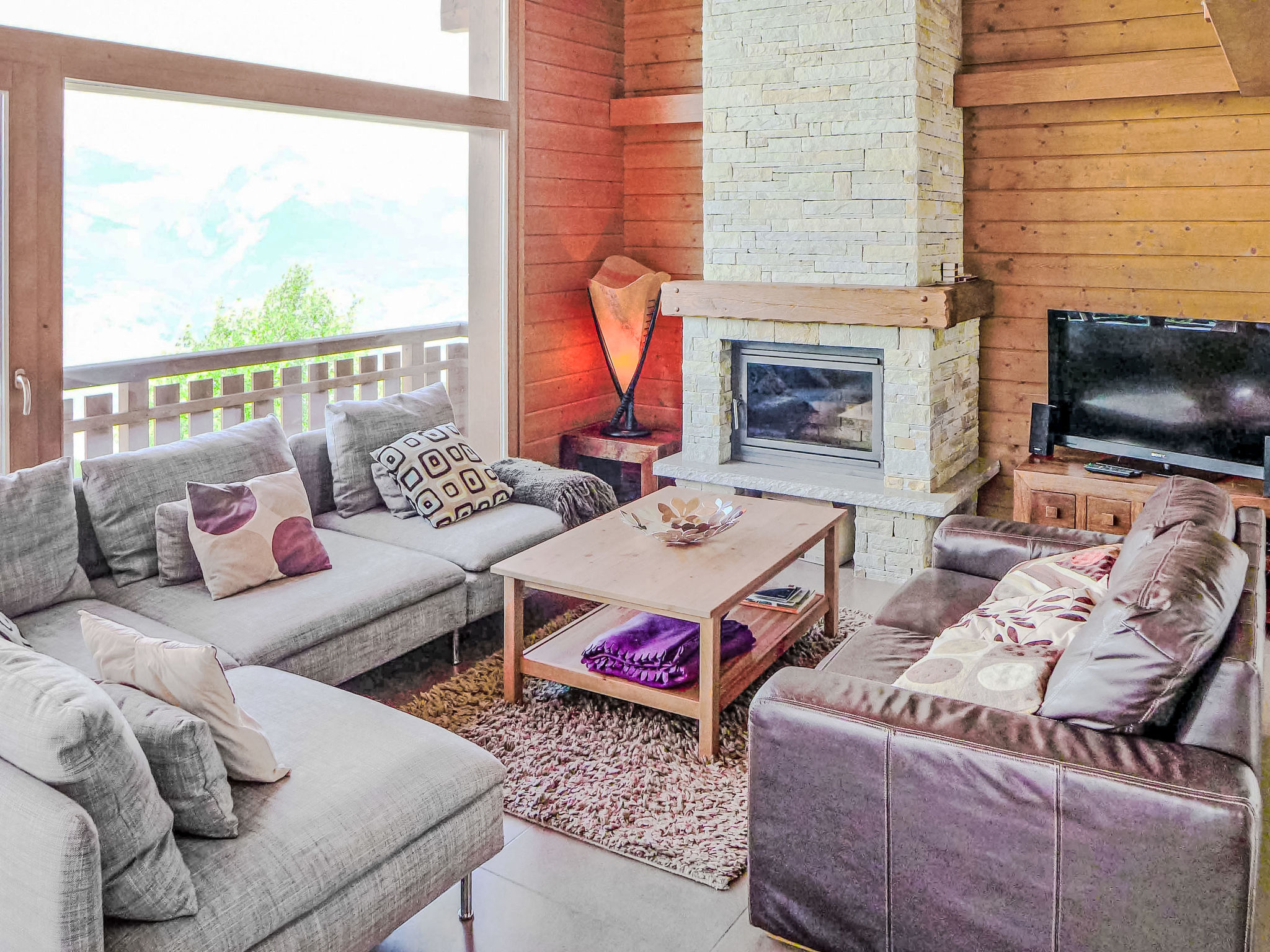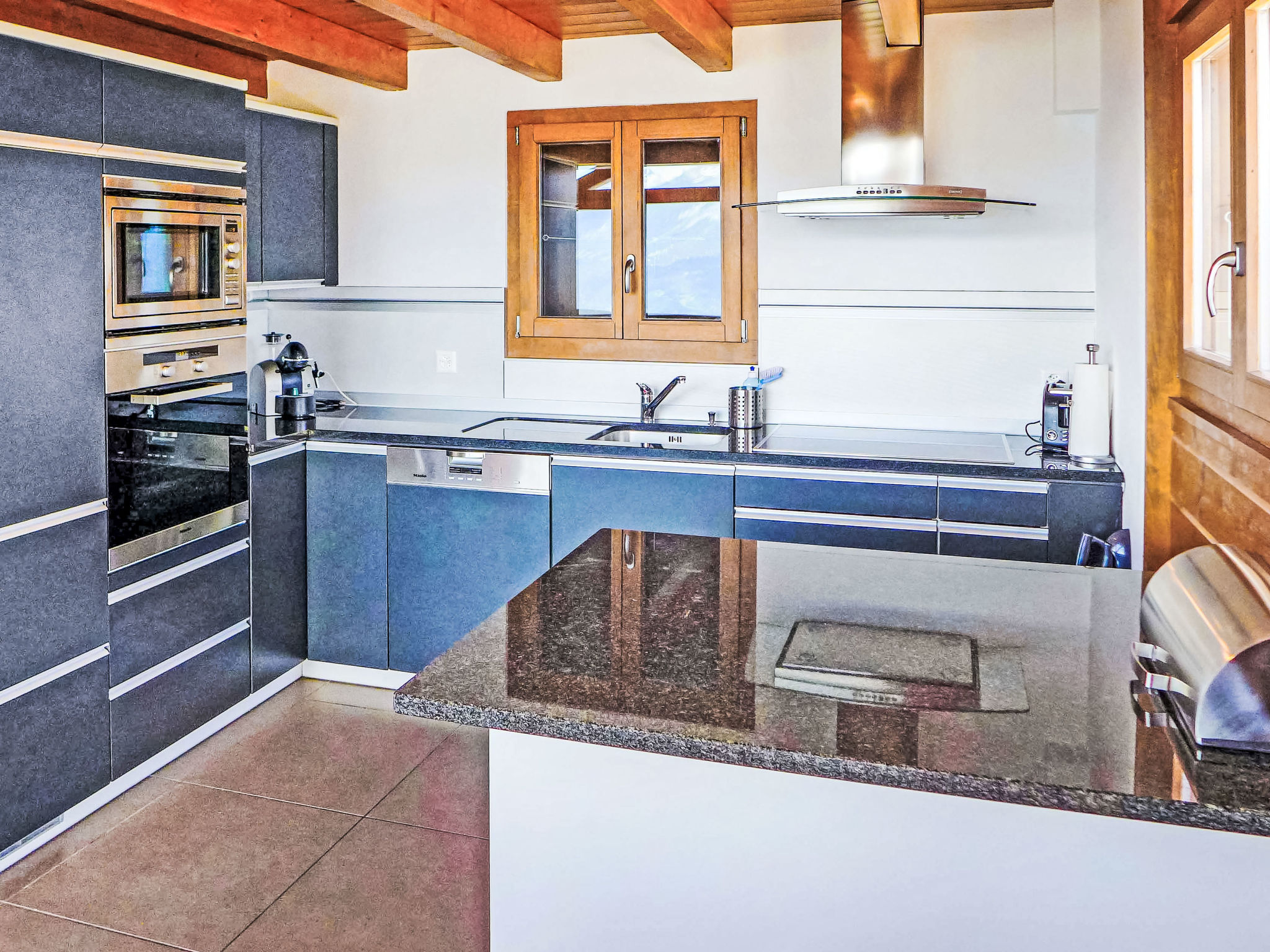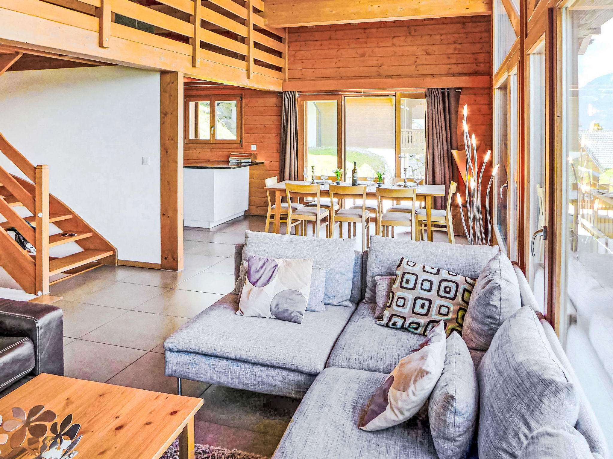 "La Truffe 6", 5-Zimmer-Chalet 120 m2 auf 3 Stockwerken. Geräumig, komfortabel und modern eingerichtet: grosses Wohn-/Esszimmer mit Panoramafenster mit offenem Kamin und Kabel-TV. Ausgang zur Terrasse, Richtung Norden. Offene Küche (Backofen, Geschirrspüler, 4 Glaskeramikplatten, Toaster, Wasserkocher, Mikrowelle, elektrische Kaffeemaschine, Kapseln für die Kaffeemaschine (Nespresso) extra, Racletteofen, Fondue Set (Käse)). Ausgang zum Garten, Richtung Westen. Dusche/WC. E-Heizung. Unteres Geschoss: 2 Zimmer, jedes Zimmer mit 1 franz. Bett (160 cm, Länge 200 cm). 1 Zimmer mit 2 Betten (90 cm, Länge 190 cm). Bad/WC. Obergeschoss: Galerie mit Kabel-TV und DVD. Grosser Balkon, Nordlage, Terrasse, Südwestlage. Terrassenmöbel, Gartengrill (mobil). Sehr schöne Panoramasicht auf die Berge und das Tal. Zur Verfügung: Waschmaschine, Wäschetrockner, Kinderhochstuhl, Babybett, Haartrockner. Internet (WLAN, gratis). Parkplatz (1 Auto), Garage, Höhe 195 cm, Breite 250 cm. Bitte beachten: Nichtraucher-Unterkunft.