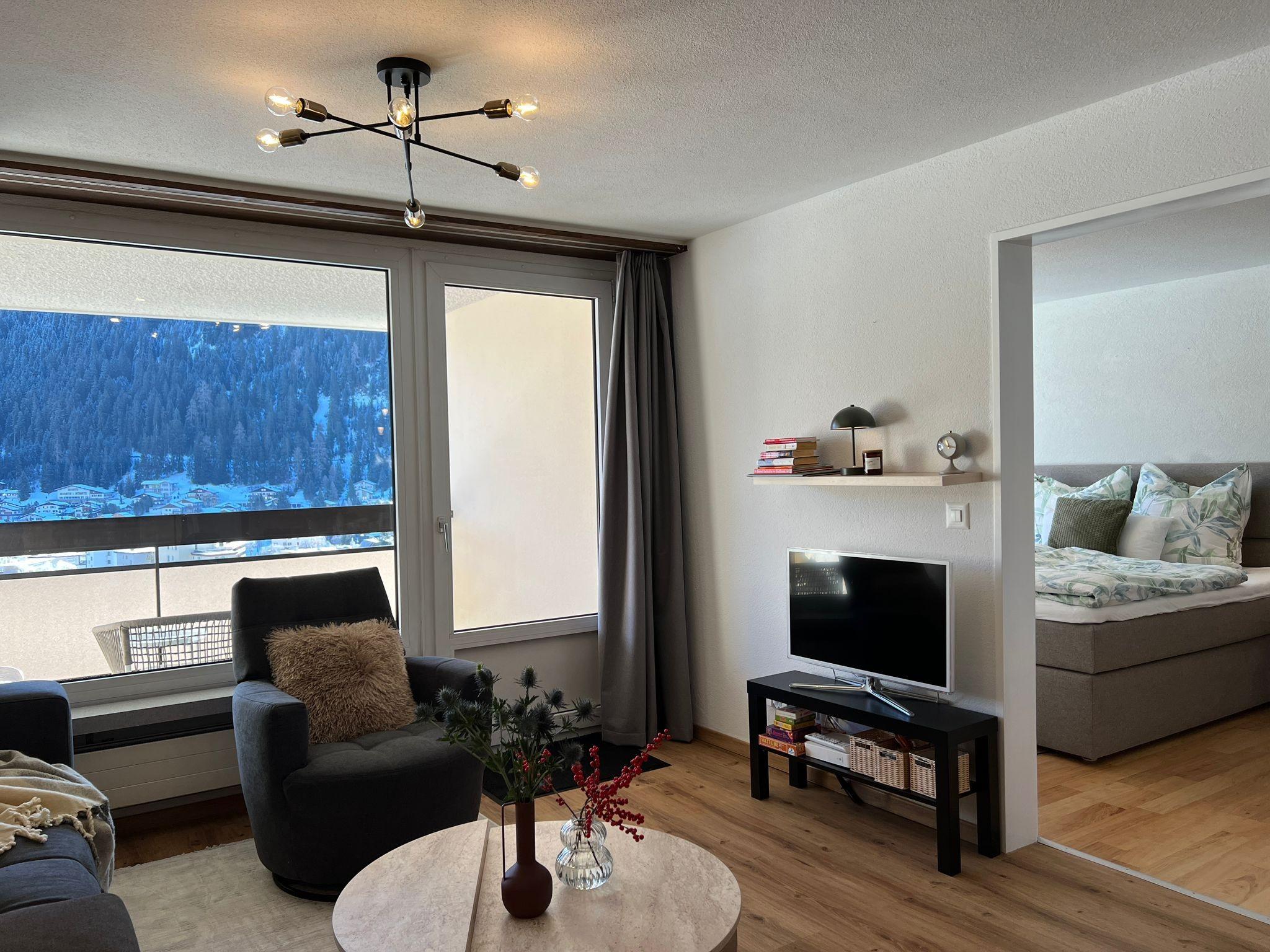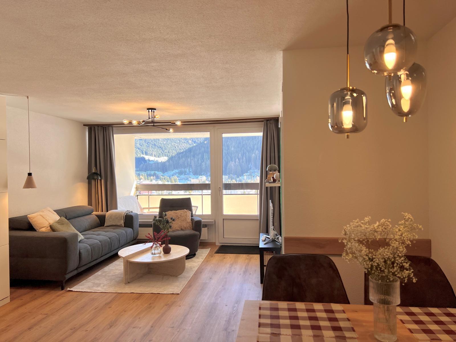 In 2016 renovierte 2-Zimmerwohnung (50 m2) im 5.Stock mit Lift in Hotel Europe integriert - Whg. Nr. 502, wunderschöne Sicht auf den Jakobshorn und auf das ganze Davoser Tal, zentrale Lage mit Bushaltestelle vor dem Hotel für alle Skigebiete; reservierter Abstellplatz in der Auto-Einstellhalle, Mitbenutzung von Hallenbad, Skiraum, Waschmaschine, Trockner und Kinderspielraum; Wohnung mit grossem, gedecktem Balkon, separate Küche mit 3-Kochplattenherd, Backofen, Kühlschrank, Geschirrspülmaschine, Kaffeemaschine, Mikrowelle, Fondue-Set, Eierkocher und Toaster, Abfallsäcke; grosses Schlafzimmer mit 2 Einzelbetten und 1 Bettstuhl, Bad mit WC, zusätzliches, separates WC, Wohnschlafzimmer mit 1 hochwertigen Bettsofa; Bettwäsche, Küchentücher; Radio, LCDTV, DVD, MP3-Player mit USB-Port, Breitband Internetanschluss mit WLAN; Haustiere: nur Hunde!