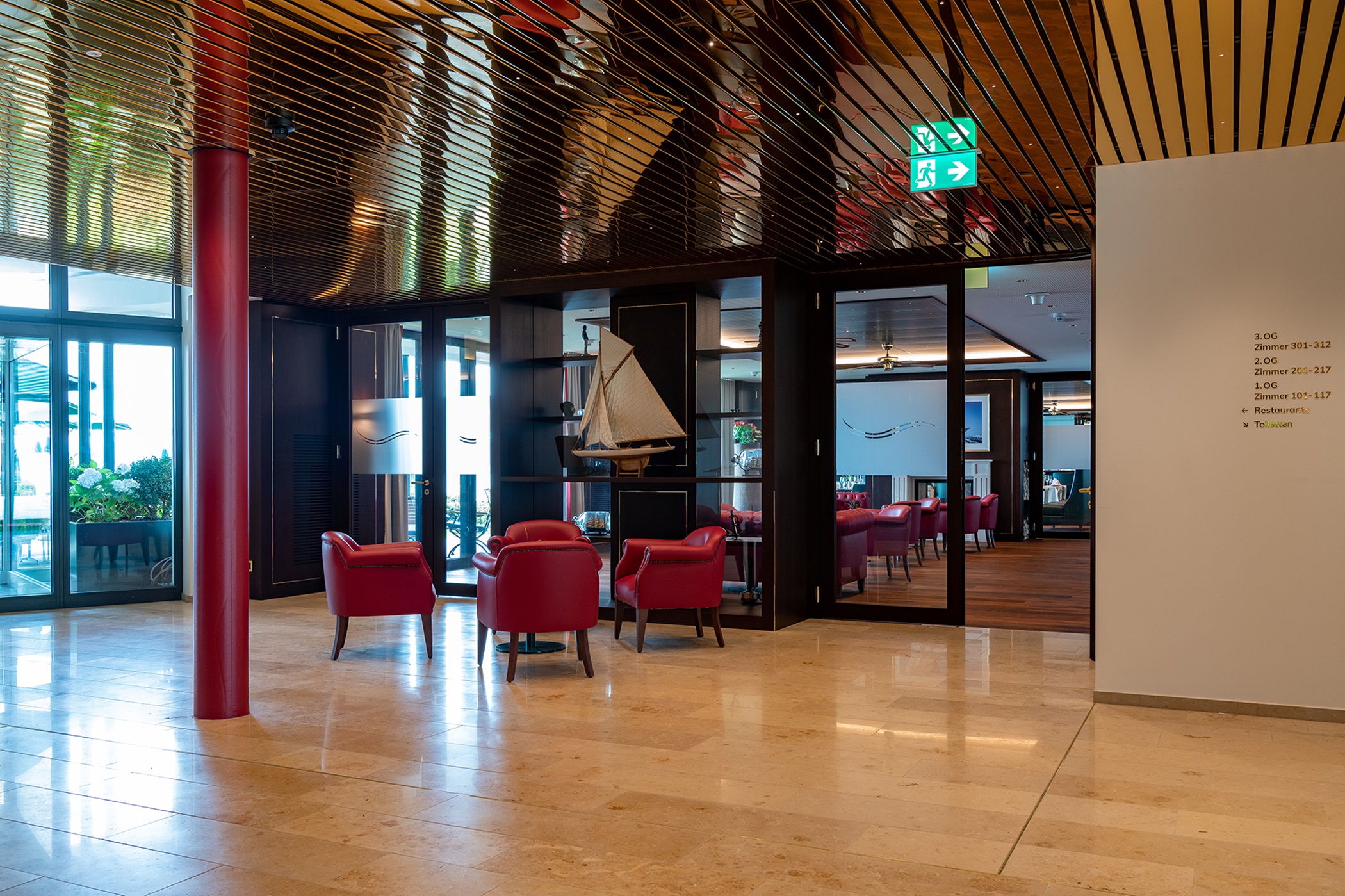Dem Ausbau mit Mahagoniholz und Messing verdanken die 71 Zimmer – grösstenteils zur Seeseite – ihre maritime Atmosphäre.
