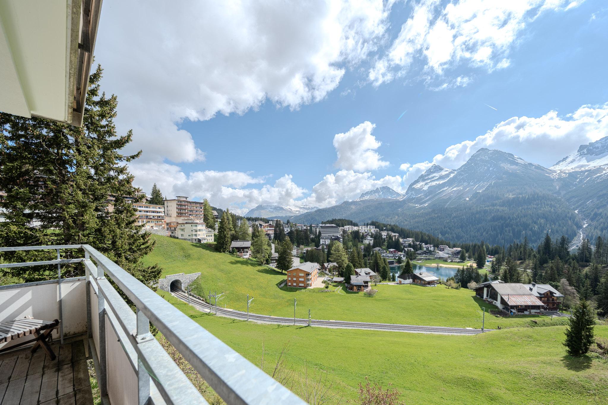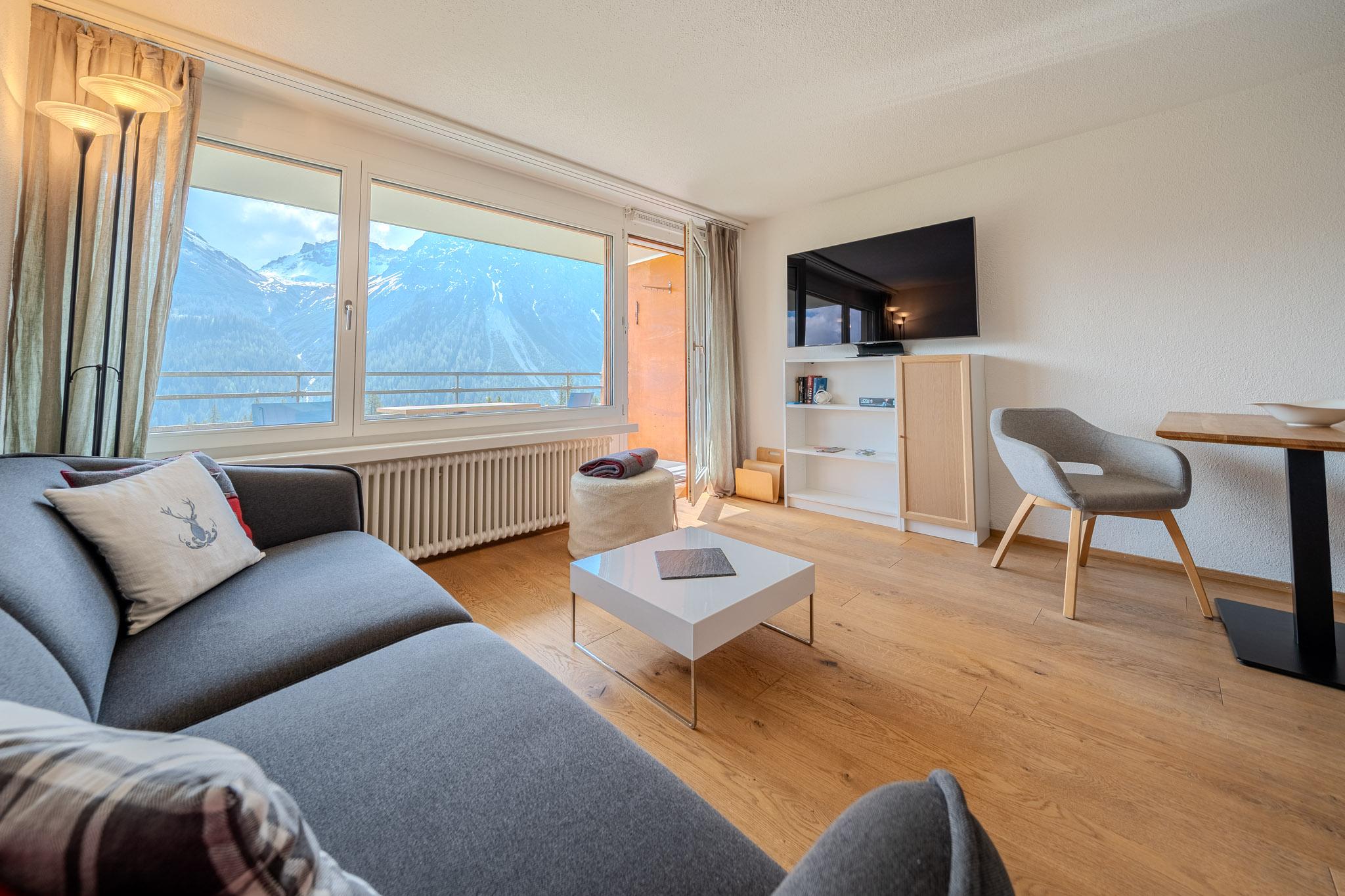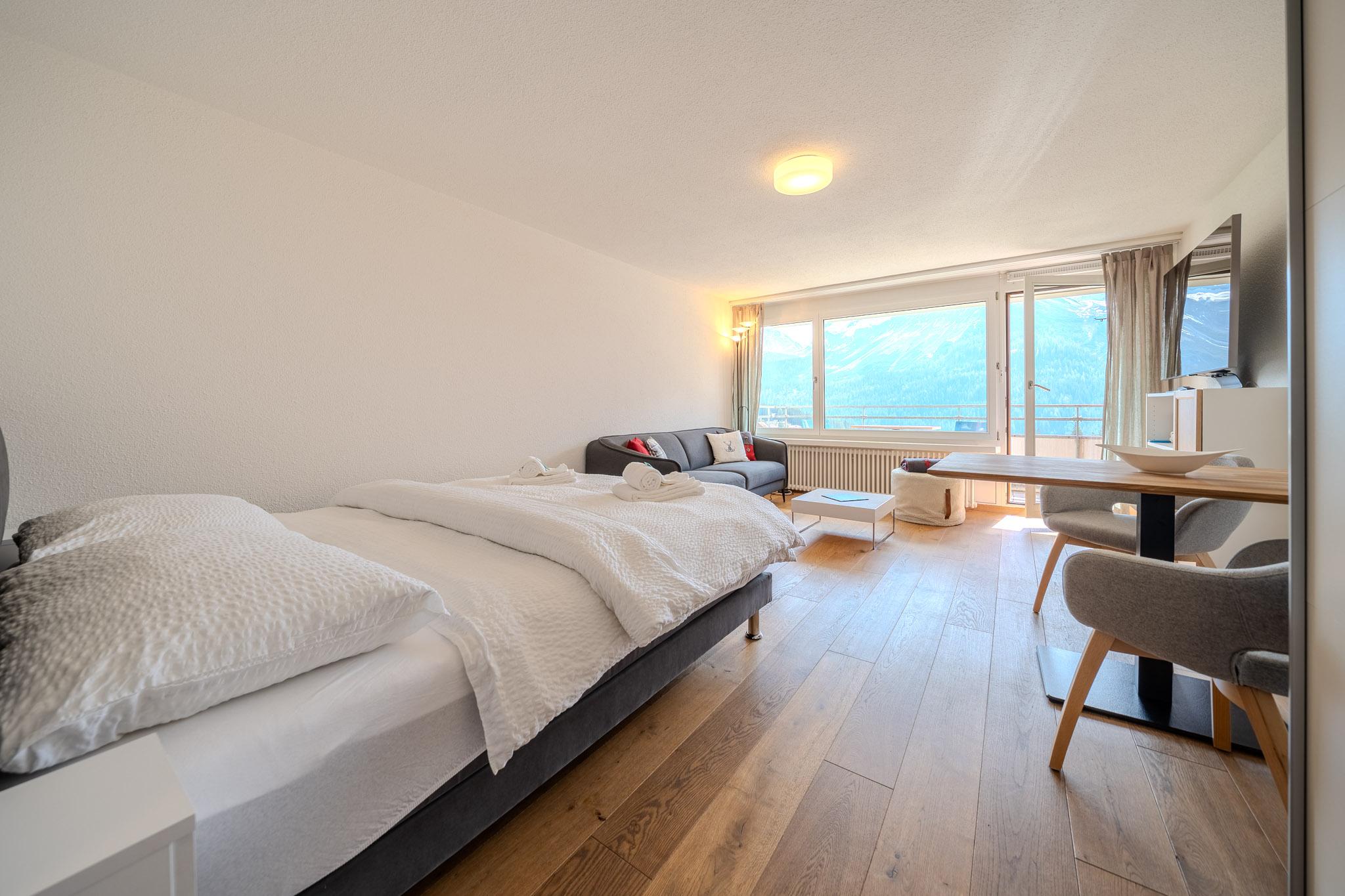 Das 35m³ grosse Studio ist ideal für den Bergurlaub zu Zweit. Super zentral (Orts-/Skibushaltestelle "Zentrum" direkt vor dem Haus, nur 7 Min. zu Fuss zur Weisshornbahn, Skiverleih/Sportgeschäft im Haus, Supermarkt direkt gegenüber) und doch absolut ruhig (dank der Hanglage des Gebäudes 5 Geschosse unterhalb der Ortsstrasse) gelegen, bietet sich vom Balkon und sogar von dem bequemen grossen Doppelbett (Boxspring, Kingsize) aus ein herrlicher Blick über das gesamte Schanfigg bis Hochwang und direkt auf den Untersee und das Schiesshorn.