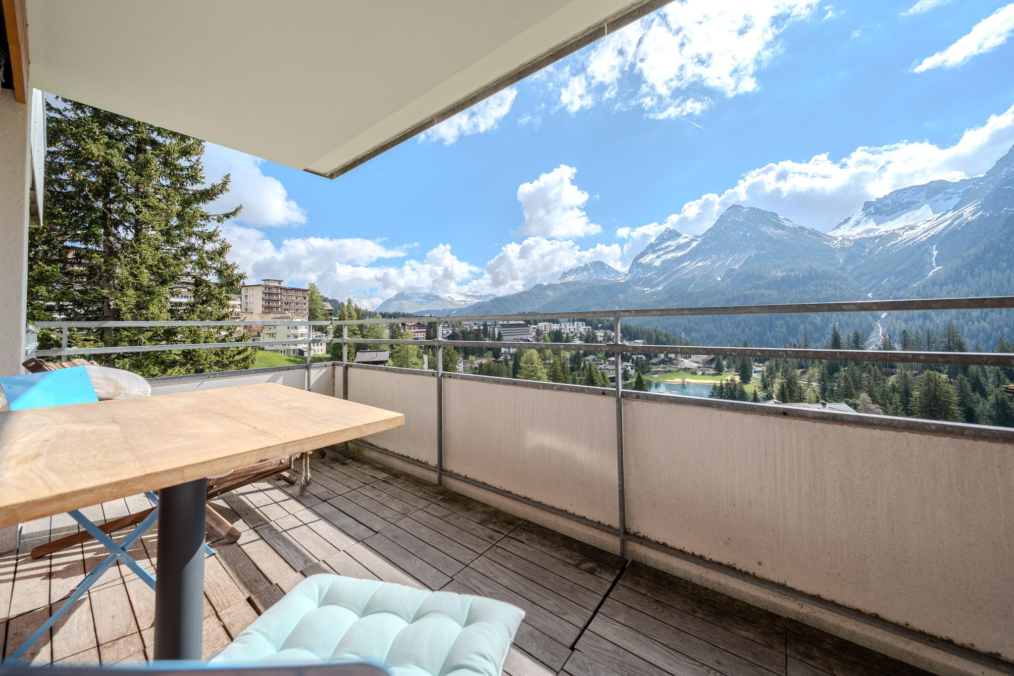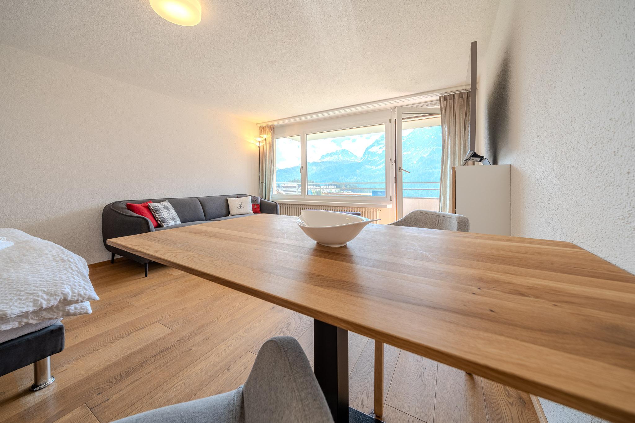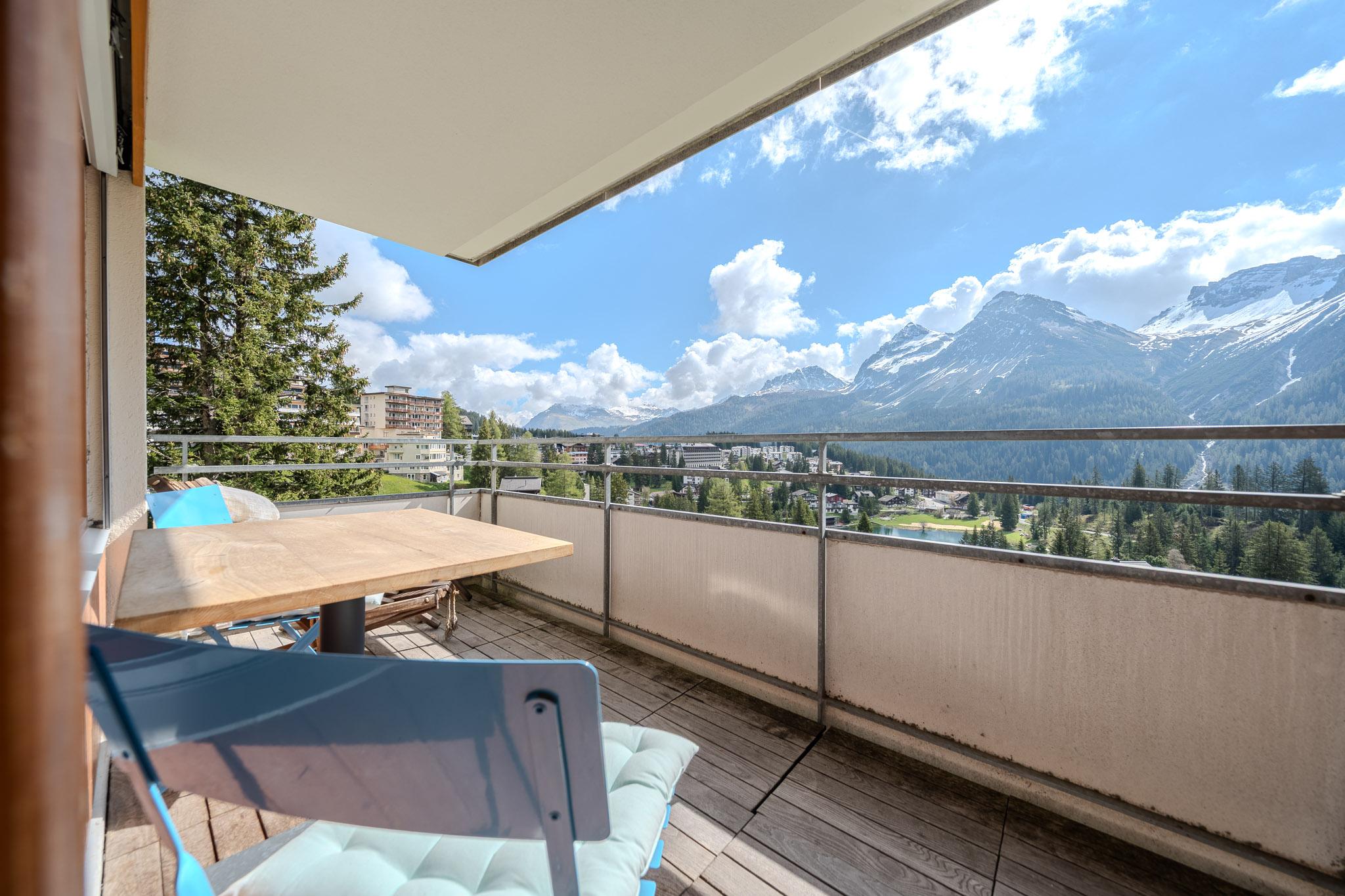 Das 35m³ grosse Studio ist ideal für den Bergurlaub zu Zweit. Super zentral (Orts-/Skibushaltestelle "Zentrum" direkt vor dem Haus, nur 7 Min. zu Fuss zur Weisshornbahn, Skiverleih/Sportgeschäft im Haus, Supermarkt direkt gegenüber) und doch absolut ruhig (dank der Hanglage des Gebäudes 5 Geschosse unterhalb der Ortsstrasse) gelegen, bietet sich vom Balkon und sogar von dem bequemen grossen Doppelbett (Boxspring, Kingsize) aus ein herrlicher Blick über das gesamte Schanfigg bis Hochwang und direkt auf den Untersee und das Schiesshorn.