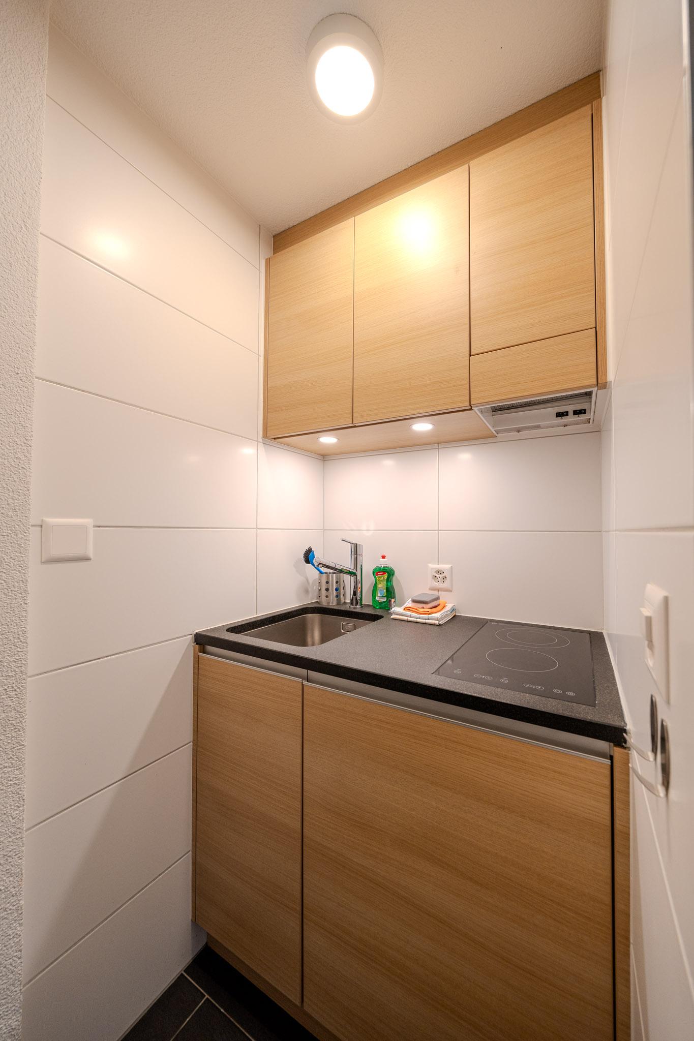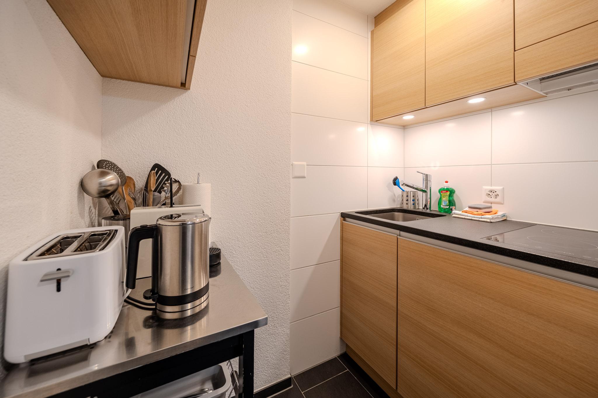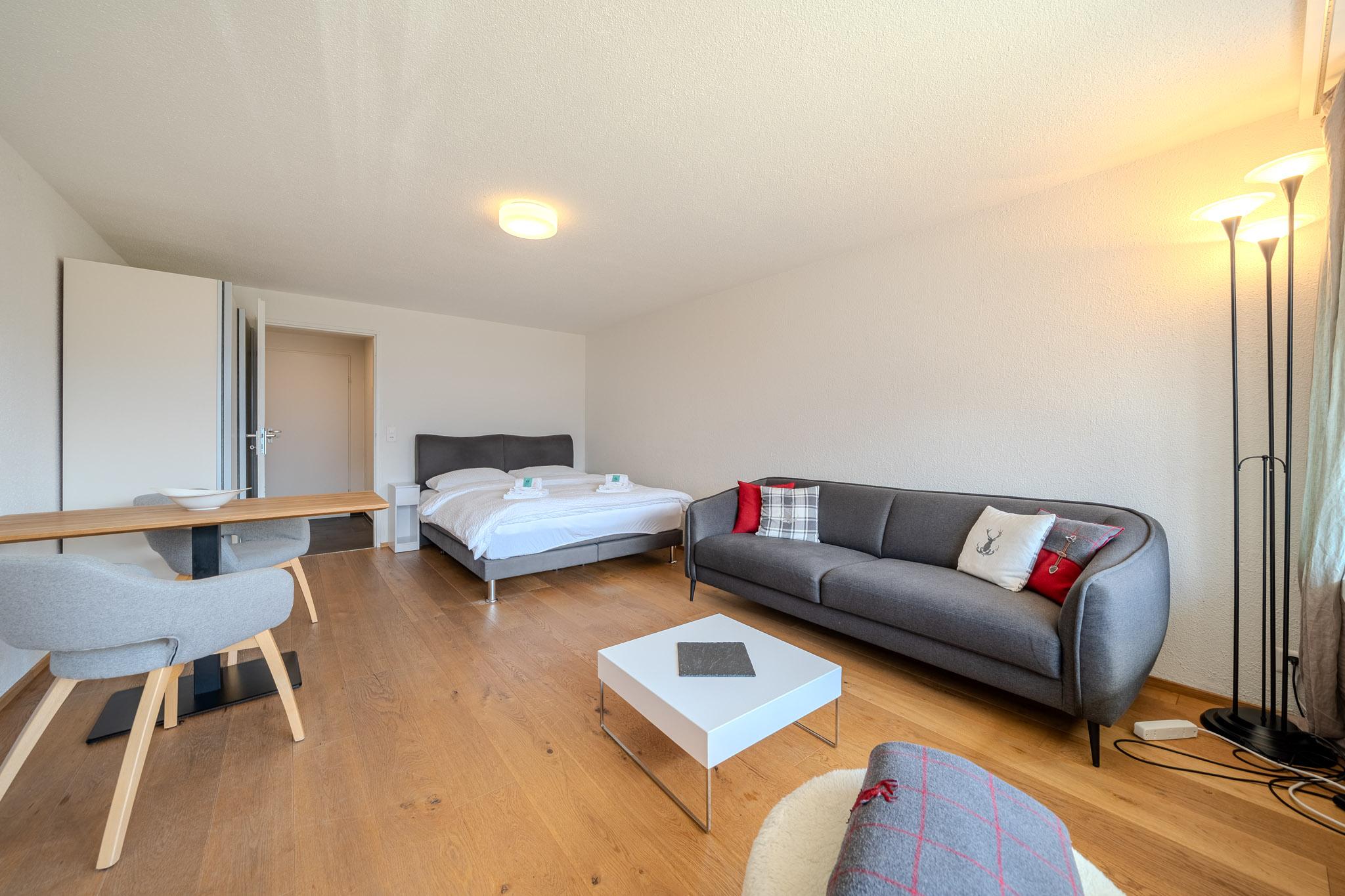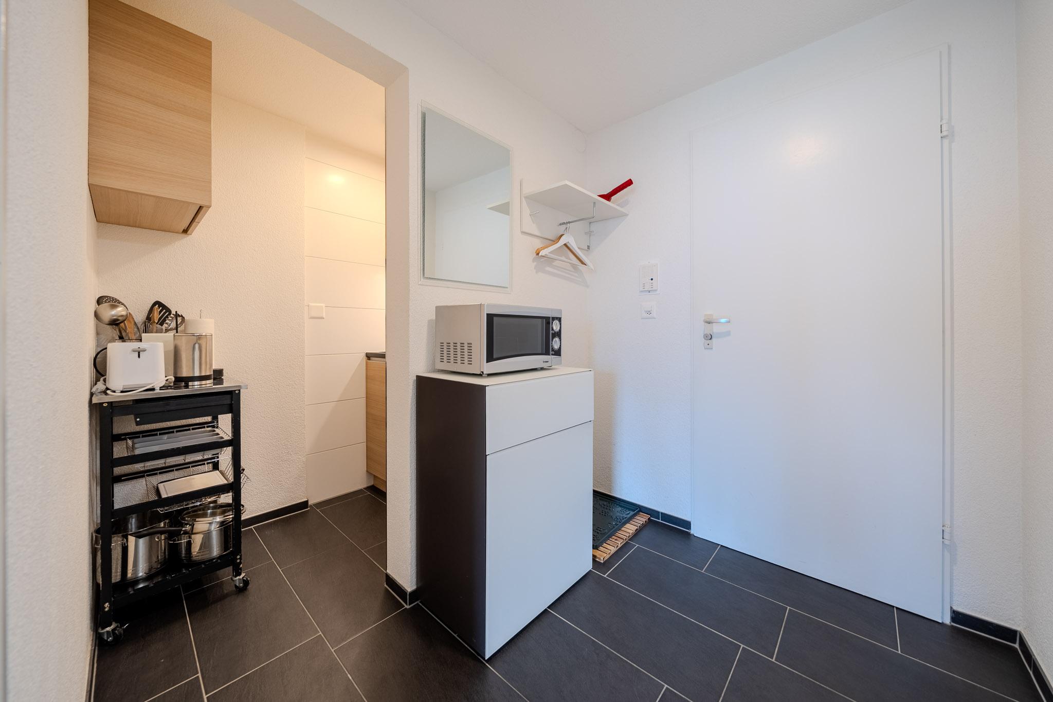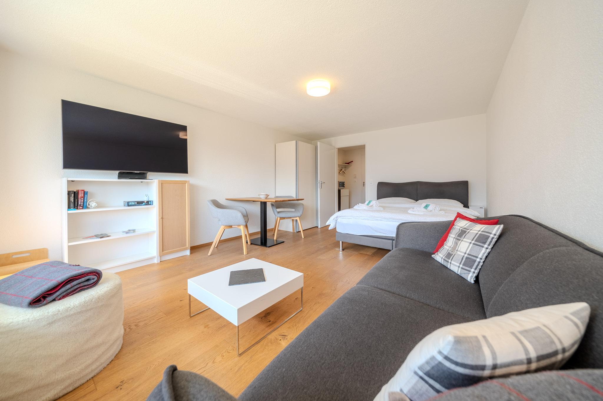 Die helle 1,5-Zimmer-Wohnung verfügt darüber hinaus über schnelles Internet (300 MBit/s), Wifi, Kabel-TV und einen Flachbildfernseher. Die praktische und gut ausgestattet Kitchenette mit Cerankochfeld, Mikrowelle/Grill, Nespresso Kaffeemaschine, Wasserkocher, Toaster, Fondue- und Raclette-Set befindet sich im Eingangsbereich ausserhalb des Wohn- und Schlafraumes. Das moderne Bad mit bodengleicher Regendusche lädt zum Wohlfühlen ein.