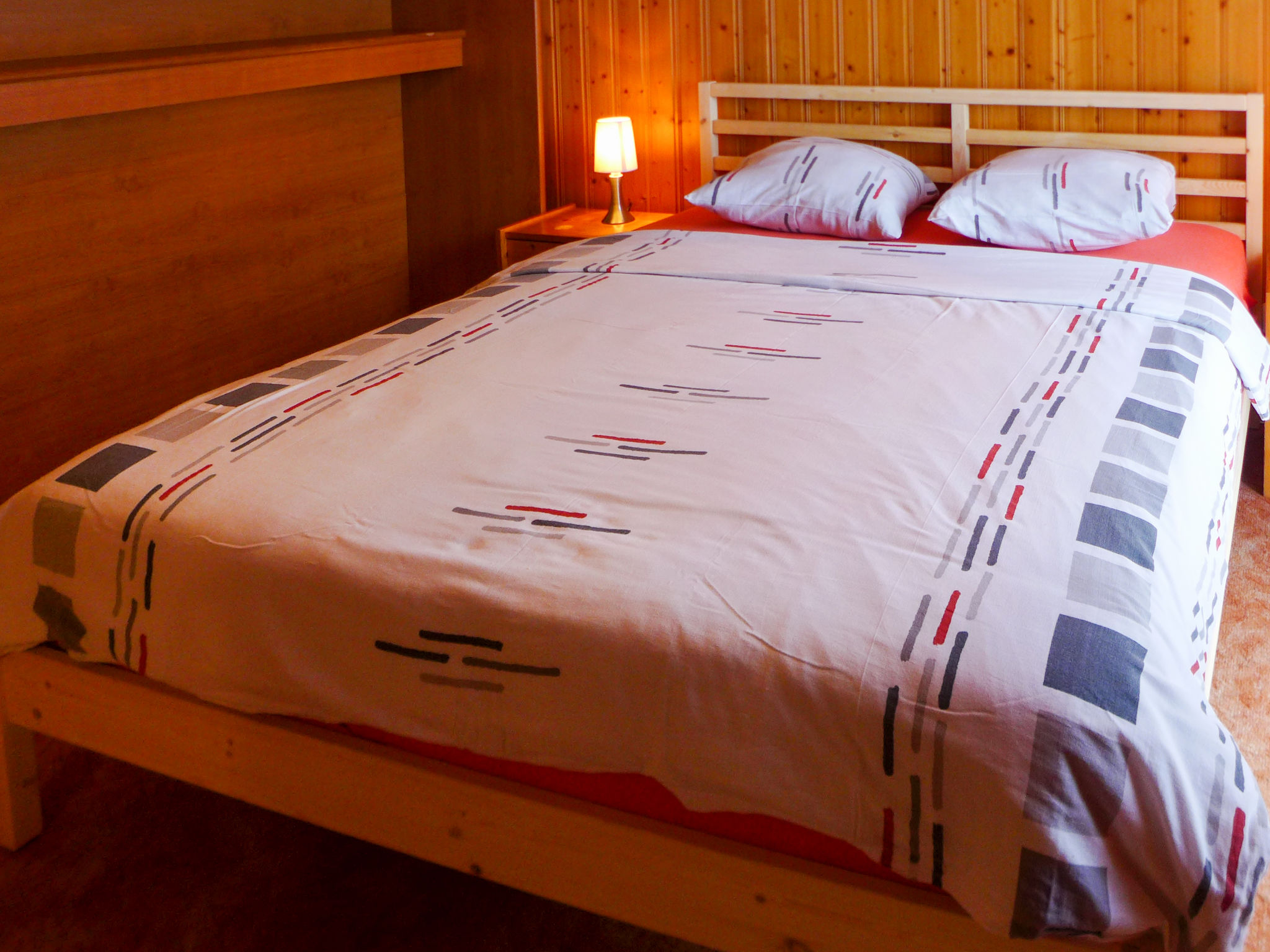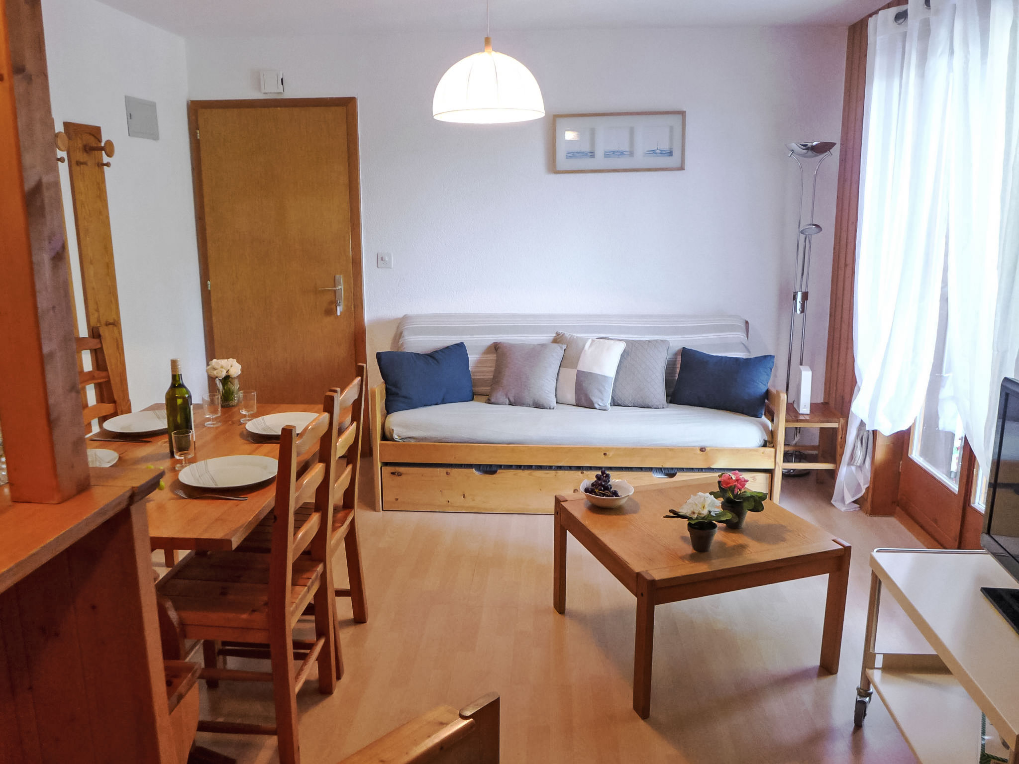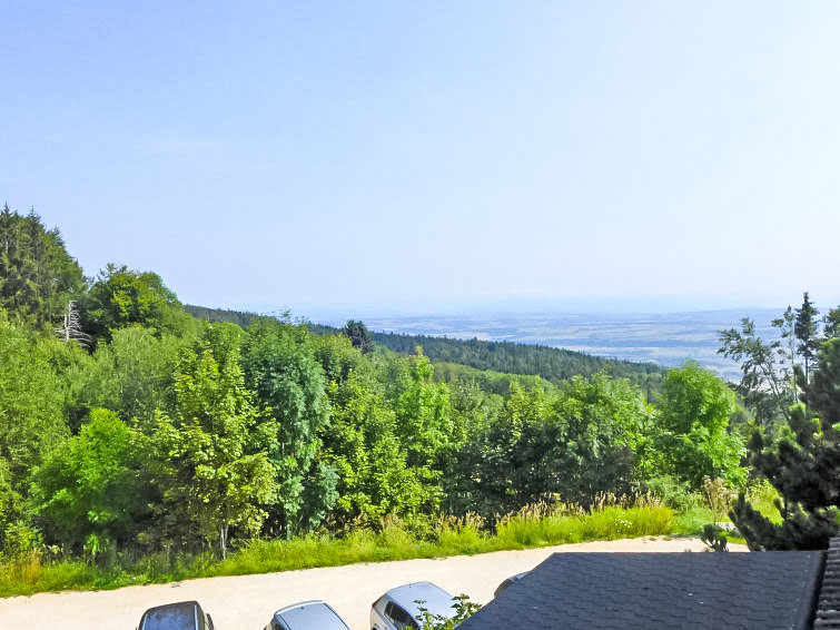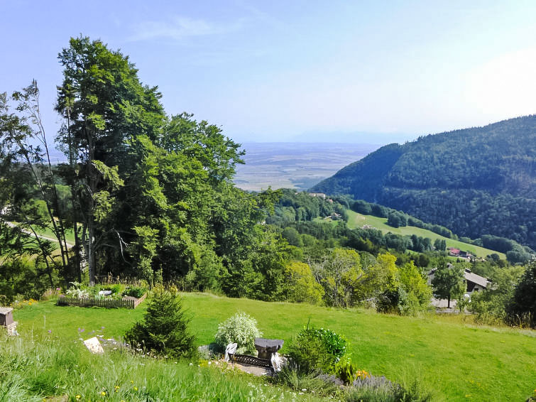 3-Zimmer-Wohnung 72 m2 auf 3 Stockwerken, im Erdgeschoss, Nordostlage. Einfach und zweckmässig eingerichtet: Wohn-/Esszimmer mit 1 Diwanbett, Schwedenofen, Esstisch, Kabel-TV und Heizofen. Ausgang zur Terrasse. Kochnische (4 Kochplatten, Backofen, Toaster, Wasserkocher, Fondue Set (Käse)). Heizung. Obergeschoss: 1 Zimmer mit 1 franz. Bett (140 cm, Länge 190 cm). Ausgang zum Balkon. Bad/WC. 2. Obergeschoss: 1 abgeschrägtes Zimmer mit 2 Betten. Dusche/WC. Balkon, Terrasse. Terrassenmöbel. Eingeschränkte Sicht auf die Berge und das Tal. Zur Verfügung: Internet (WLAN, gratis). Parkplatz (eingezäunt). Maximal 1 Haustier/Hund erlaubt.