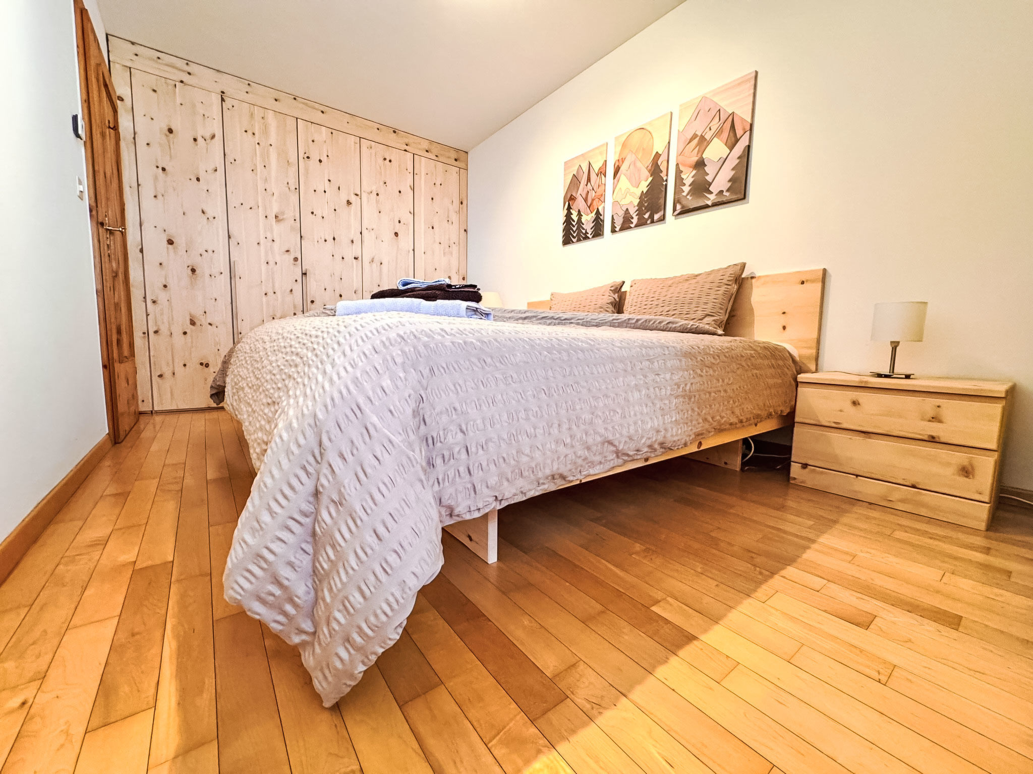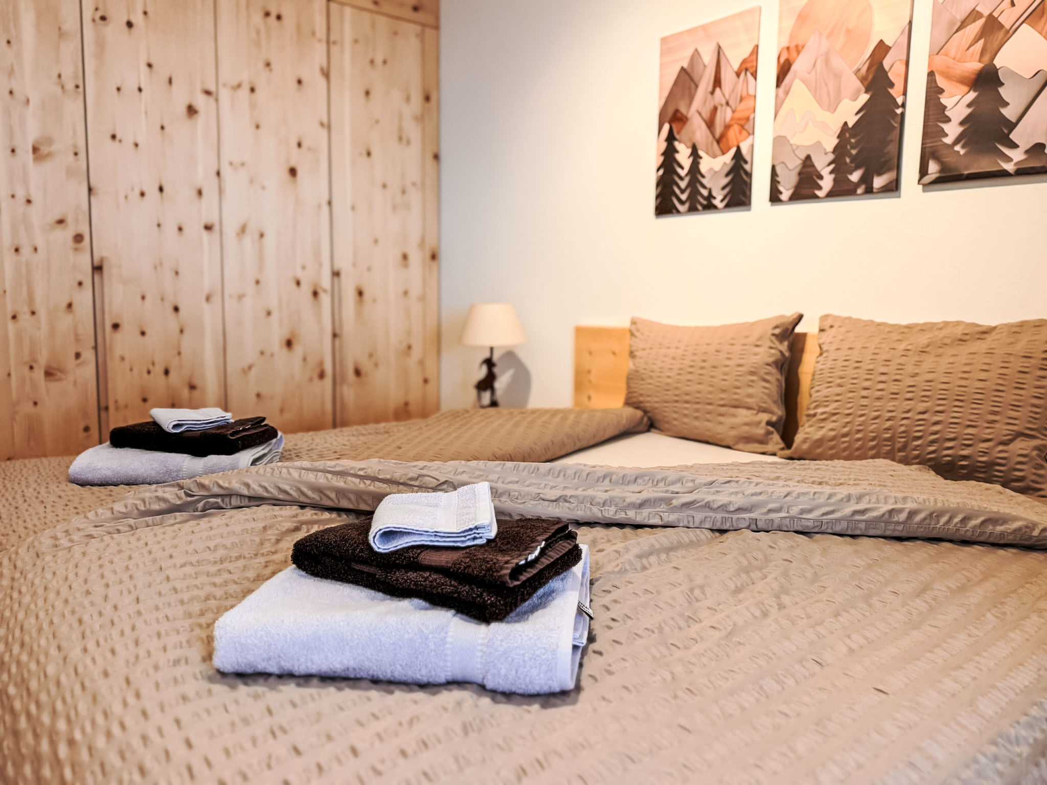 Im Inneren erwartet Sie ein großzügiges Wohn- und Esszimmer, das mit einem Balkon für malerische Aussichten ausgestattet ist. Zu den weiteren Annehmlichkeiten gehören eine gut ausgestattete Küche mit WC/Dusche, ein separates WC, sowie zwei Schlafzimmer, von denen eines mit einem Doppelbett und das andere mit zwei Einzelbetten bestückt ist; beide Schlafzimmer verfügen über Balkone. Die gesamte Wohnung ist mit Echtholzparkett ausgelegt, während die Nasszellen mit Keramikfliesen versehen sind, was für eine warme und einladende Atmosphäre sorgt.