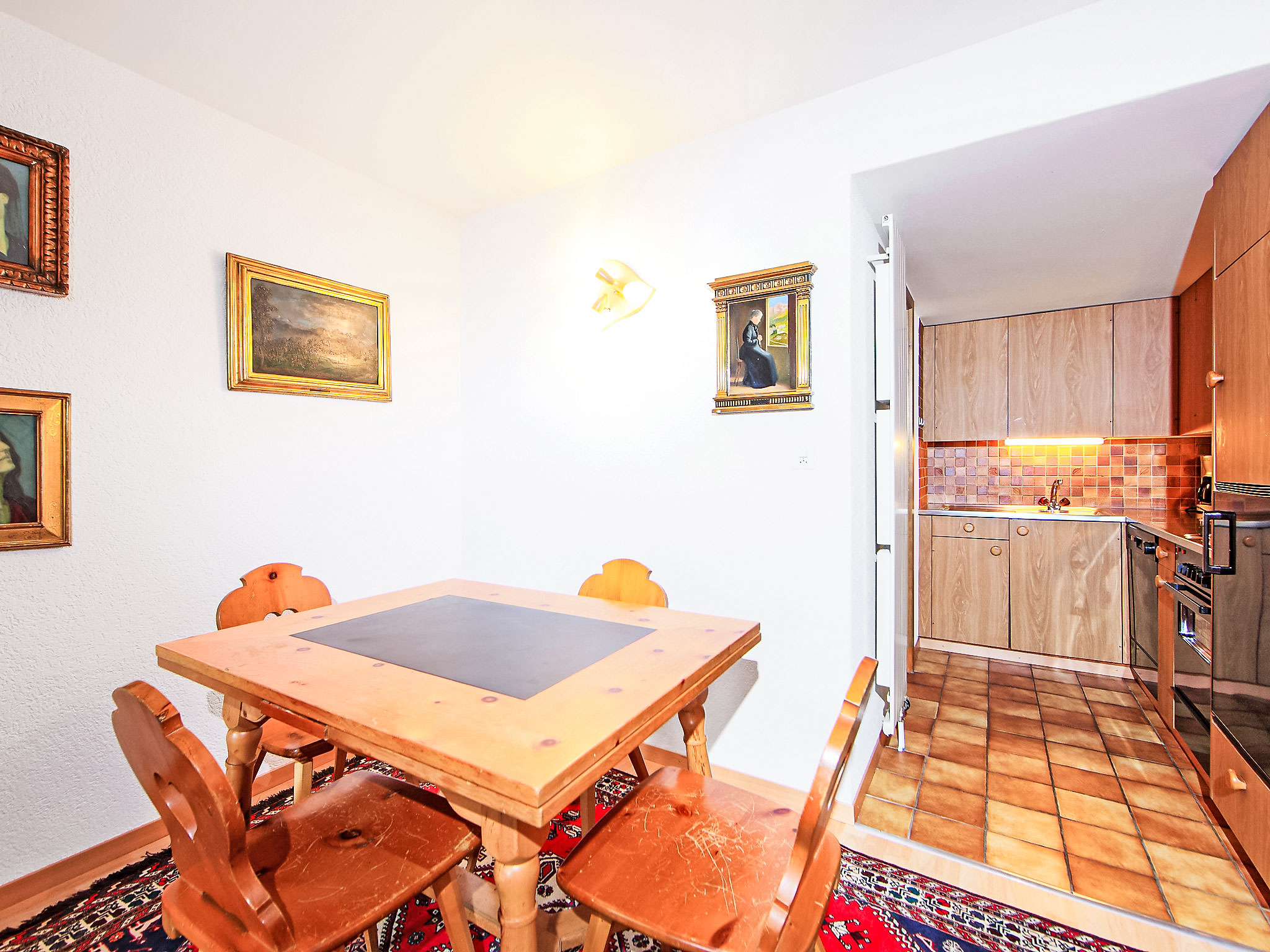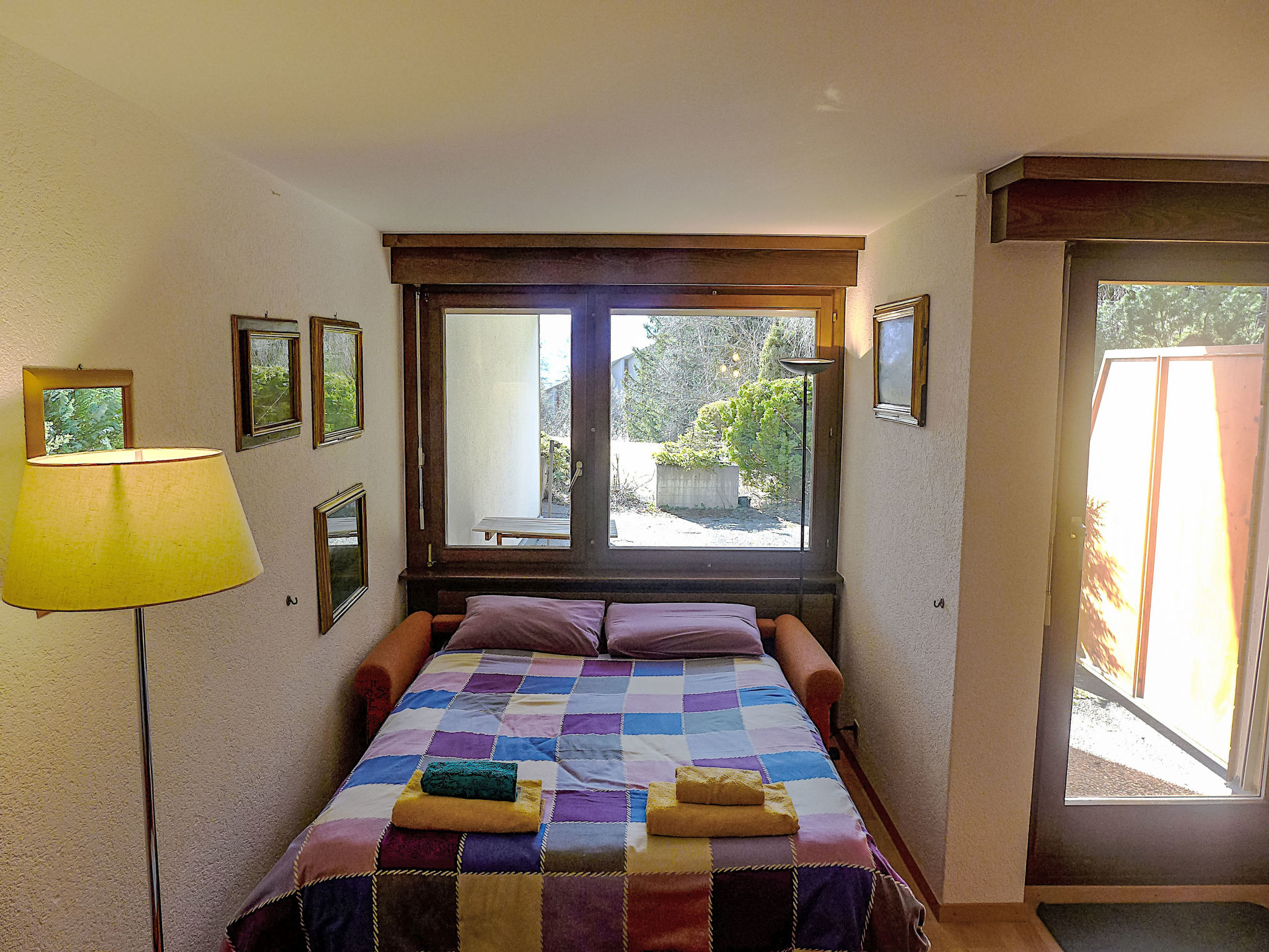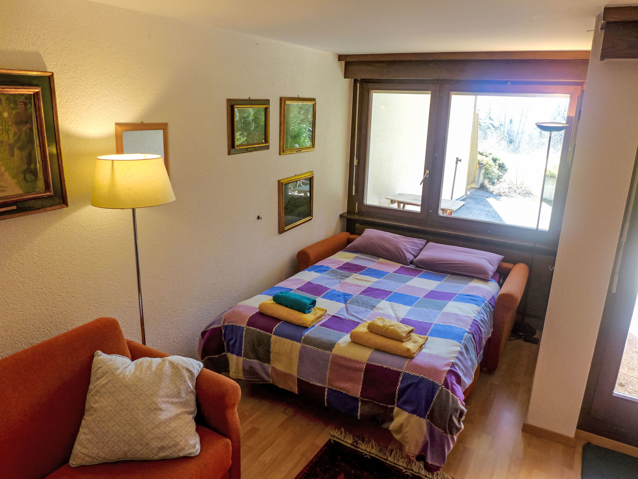 "Terrasse Des Alpes 618", 1-Zimmer-Studio 34 m2 im 1. Stock. Schön eingerichtet: Wohn-/Esszimmer mit 1 Doppeldiwanbett (140 cm, Länge 190 cm), Kabel-TV und Flachbildschirm. Offene Küche (4 Kochplatten, Backofen, Geschirrspüler, Toaster, Wasserkocher, Mikrowelle, elektrische Kaffeemaschine, Racletteofen, Fondue Set (Käse)). Bad/WC. Parkettboden. Terrasse 12 m2, Südwestlage. Terrassenmöbel. Sicht auf die Berge und den Wald. Zur Verfügung: Bügeleisen, Haartrockner. Internet (Wireless LAN, gratis). Garage Nr. 54, Höhe 200 cm, Breite 220 cm. Bitte beachten: Nichtraucher-Unterkunft.
