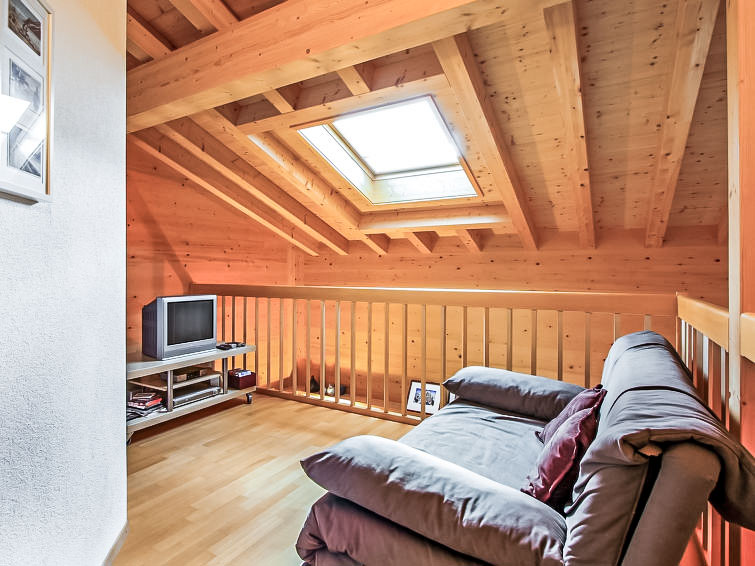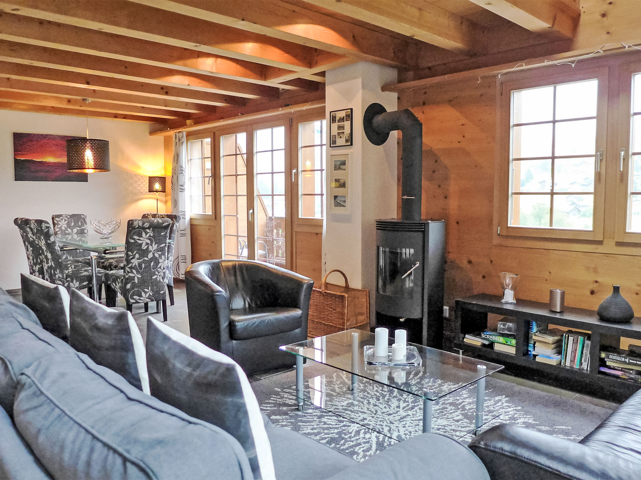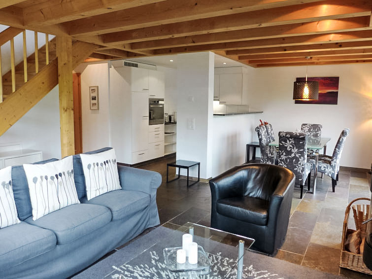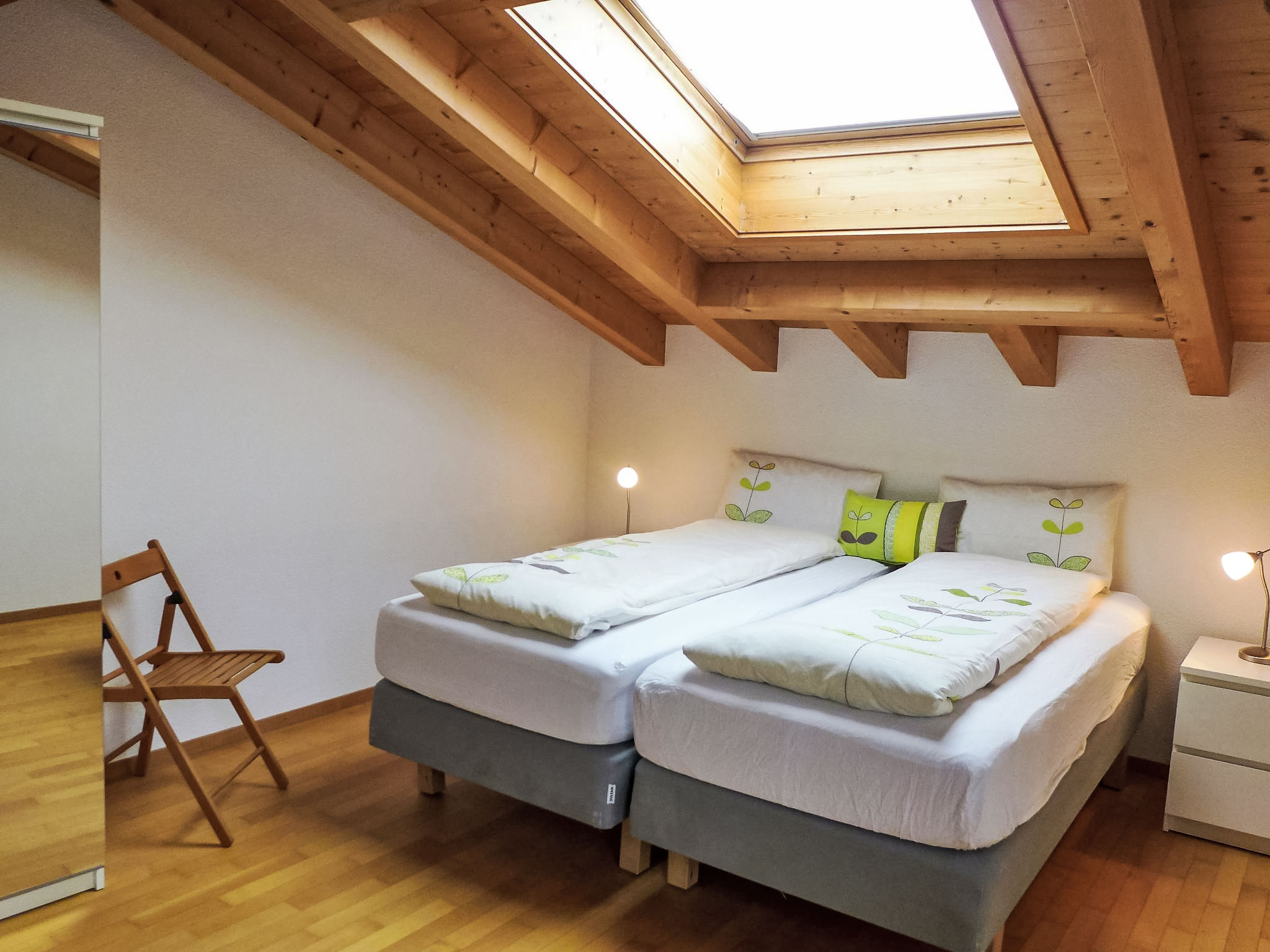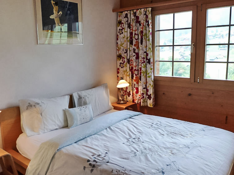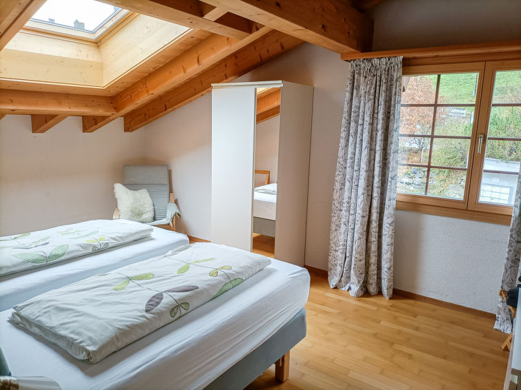 4-Zimmer-Attikawohnung 126 m2 auf 2 Stockwerken im 1. Stock, Südlage. Teilweise abgeschrägt, komfortabel und gemütlich eingerichtet: Wohn-/Esszimmer mit Schwedenofen und Kabel-TV (Flachbildschirm), Radio, CD und DVD. Ausgang zum Balkon, Richtung Süden und Richtung Westen. 1 Zimmer mit 2 Betten (90 cm, Länge 200 cm). Offene Küche (Backofen, Geschirrspüler, 4 Glaskeramikplatten, Toaster, Wasserkocher, Mikrowelle, elektrische Kaffeemaschine, Kapseln für die Kaffeemaschine (Nespresso) extra, Racletteofen, Fondue Set (Käse)). Dusche/WC. Bodenheizung. Obergeschoss: 1 Zimmer mit 2 Betten (90 cm, Länge 200 cm). 1 Zimmer mit 1 franz. Bett (160 cm). Bad/WC. Fussbodenheizung. Parkettboden, Natursteinboden. Balkon 21 m2, Südlage und Westlage. Balkonmöbel. Herrliche Sicht auf die Berge und Eigernordwand. Zur Verfügung: Waschmaschine, Wäschetrockner, Haartrockner. Internet (Wireless LAN, gratis). Parkplatz Nr. 10 Leeson (überdacht, 1 Auto). Bitte beachten: Nichtraucher-Unterkunft. Feuerlöscher.