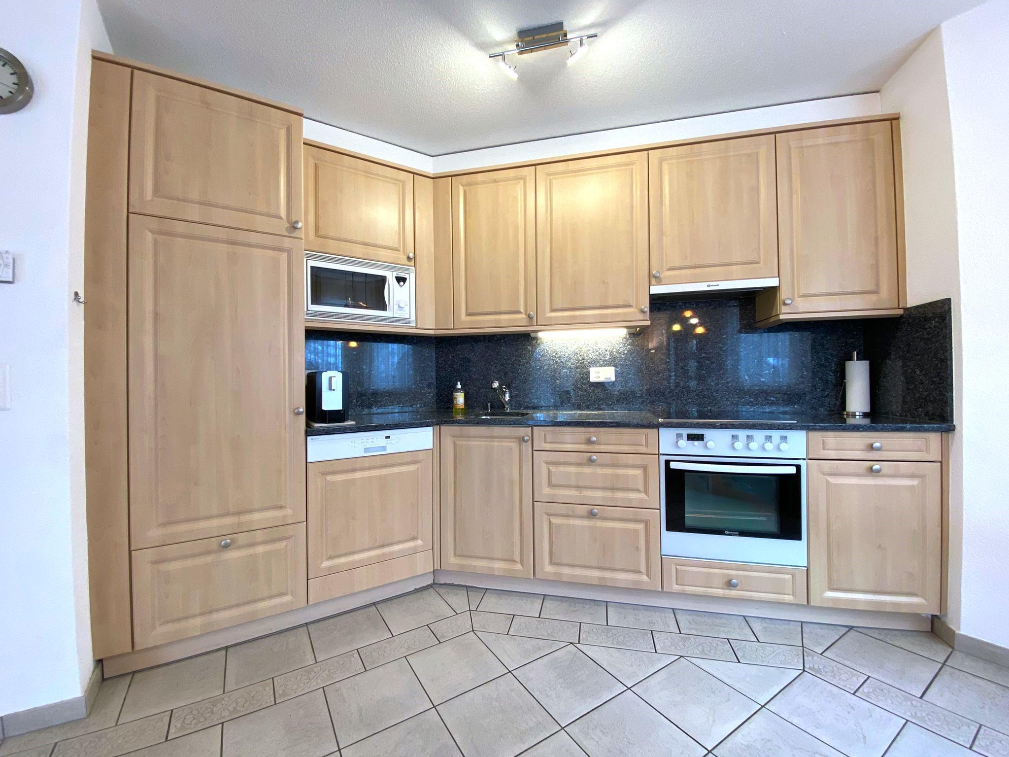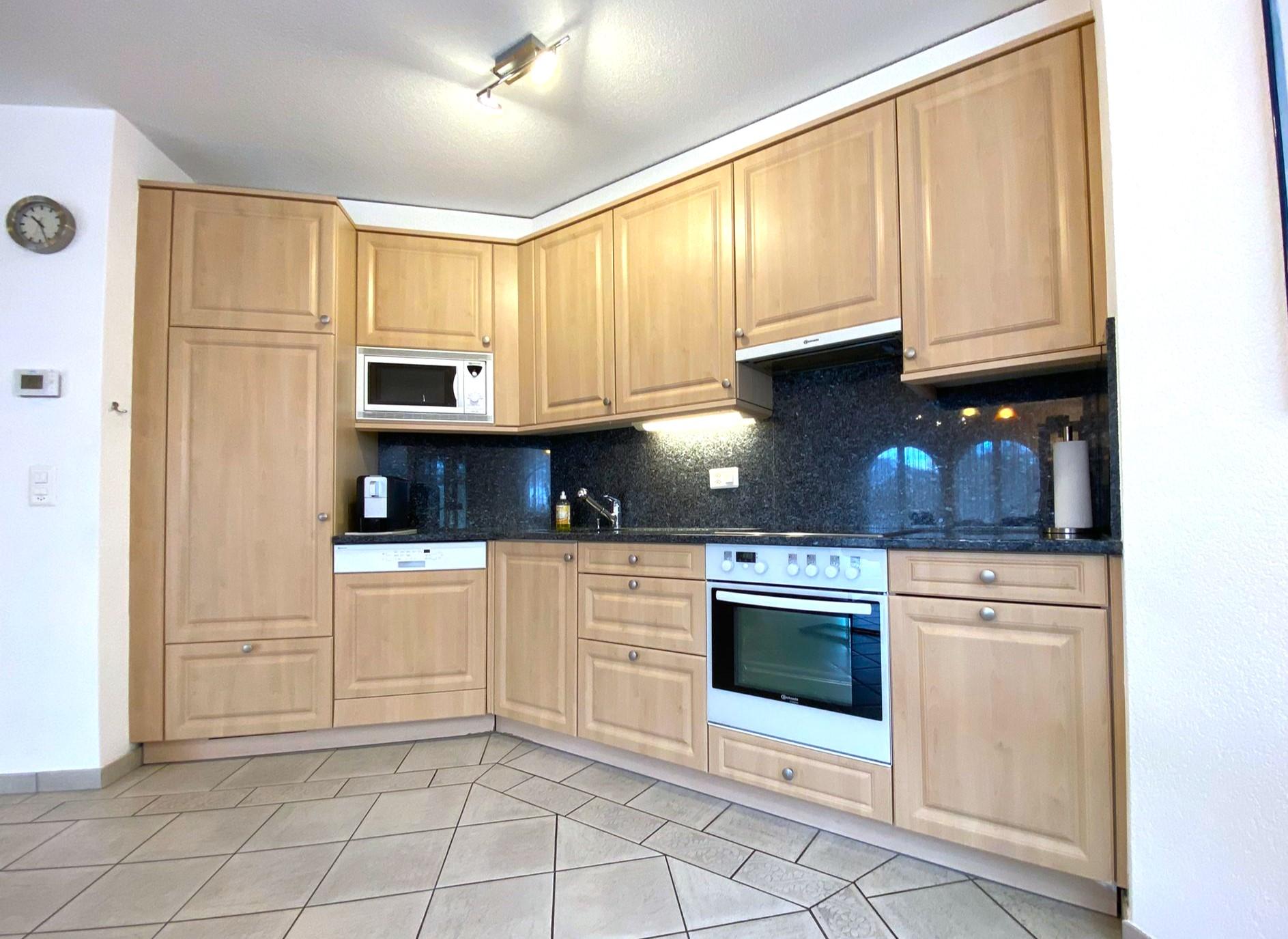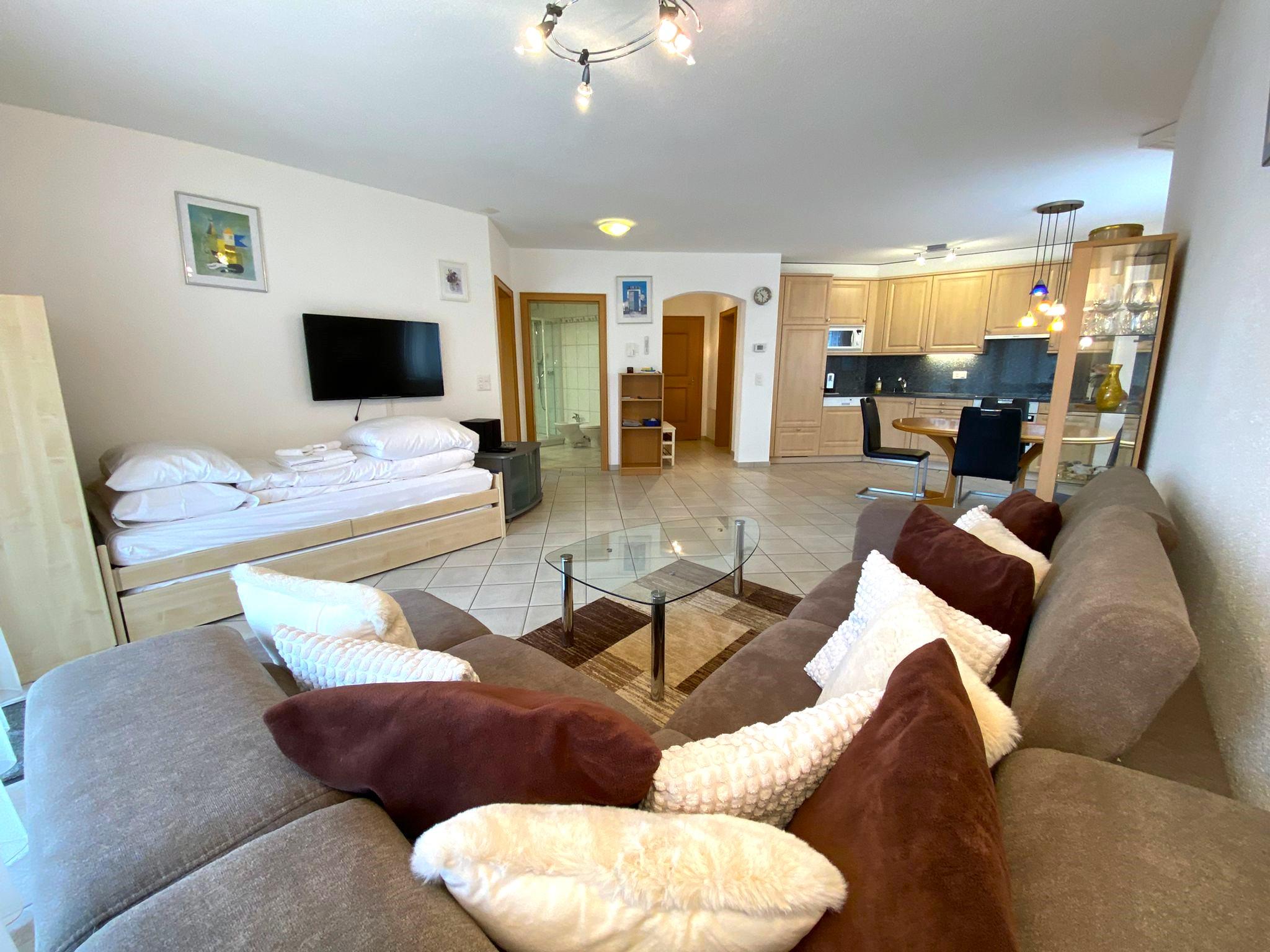 2-Zimmer-Eckwohnung mit grosser Südterrasse: Moderne, offene Küche mit Mikrowelle & Geschirrspüler, 1 Doppelschlafzimmer, Dusche/WC/Doppellavabo, Wohnraum mit 2 Einzelbetten, gratis WiFi, TV, DVD-Player, Radio, CD-Player. Gartenmöbel vorhanden. Garage im Haus inklusive. Nichtraucherwohnung! Haustiere nicht erlaubt!