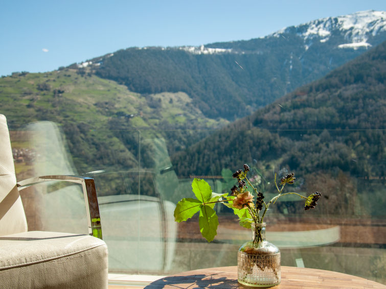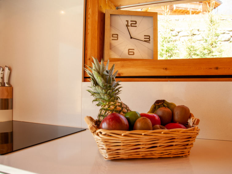 "Papillon", 3-Zimmer-Chalet 80 m2 auf 2 Stockwerken, Westlage. Geschmackvoll und romantisch eingerichtet: Wohn-/Esszimmer mit Panoramafenster mit Kabel-TV. Offene Küche (Geschirrspüler, 4 Induktionskochplatten, Wasserkocher, Tiefkühler, elektrische Kaffeemaschine, Kapseln für die Kaffeemaschine (Nespresso) extra, Racletteofen, Kombinationsmikrowelle, Fondue Set (Käse)) mit Bar. Ausgang zur Terrasse, Richtung Süden. Heizung. Unteres Geschoss: 1 Zimmer mit 1 franz. Bett (160 cm, Länge 200 cm). Offener Eingang mit 1 Bett (90 cm, Länge 190 cm). 1 Zimmer mit 1 Doppelbett (2 x 80 cm, Länge 200 cm). Dusche/WC, sep. WC, Doppelwaschbecken, Sauna. Grosse Terrasse, Südlage und Ostlage. Terrassenmöbel, Liegestühle (3). Sehr schöne Panoramasicht auf die Berge und das Tal. Zur Verfügung: Internet (WLAN, gratis). Parkplatz in 30 m. Bitte beachten: Nichtraucher-Unterkunft. Maximal 1 Haustier/Hund erlaubt.
